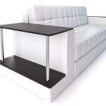 Лаконичный дизайн дивана Атлант великолепно дополняет белая обивка из экокожи, придающая благородный вид и достоинство. Белоснежный оттенок в сочетании с насыщенным цветом венге, которым отделаны накладки подлокотников и встроенный столик, создает изумительный эффект. Если купить качественное изделие по доступной цене, можно не только украсить обстановку, но подарить своей семье комфортный отдых на роскошном диване, где предусмотрено место для чашечки чая, журнала, телефона. Модель оборудована надежным механизмом трансформации «еврокнижка», с помощью которого вы легко организуете удобное спальное место с ровной поверхностью. Пружинный блок, используемый в качестве наполнителя, сделает сон спокойным и здоровым. Вместительный бельевой ящик, который можно заказать дополнительно, позволит хранить в порядке постельные принадлежности.