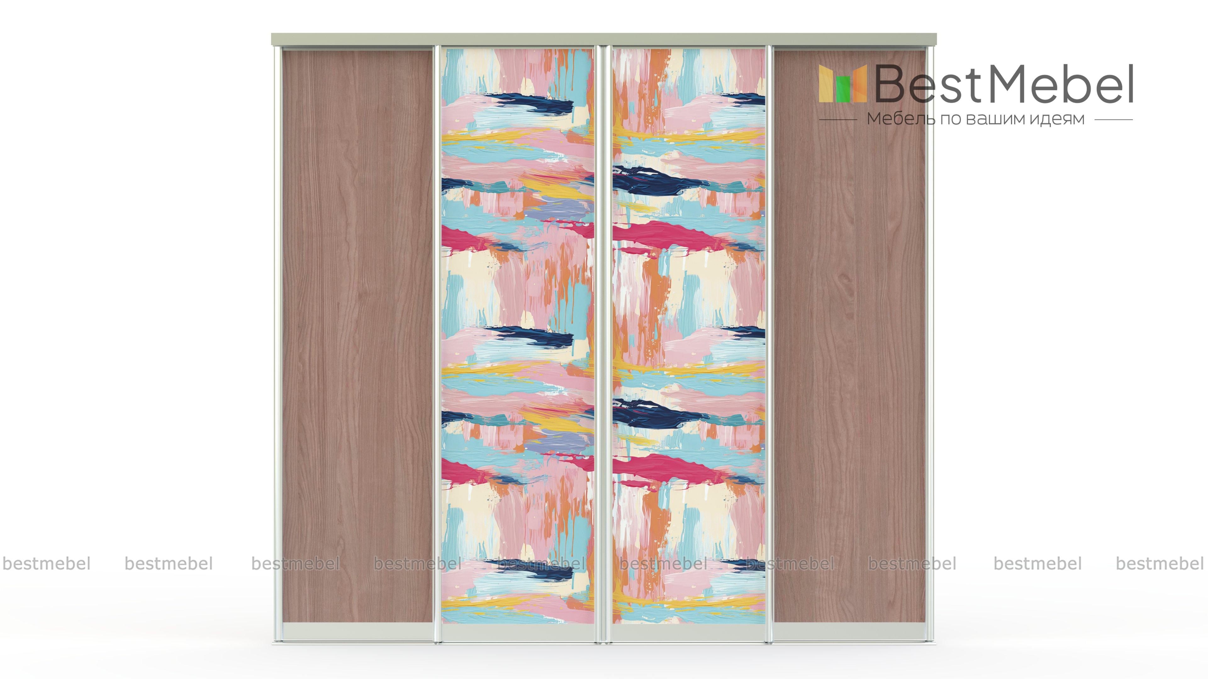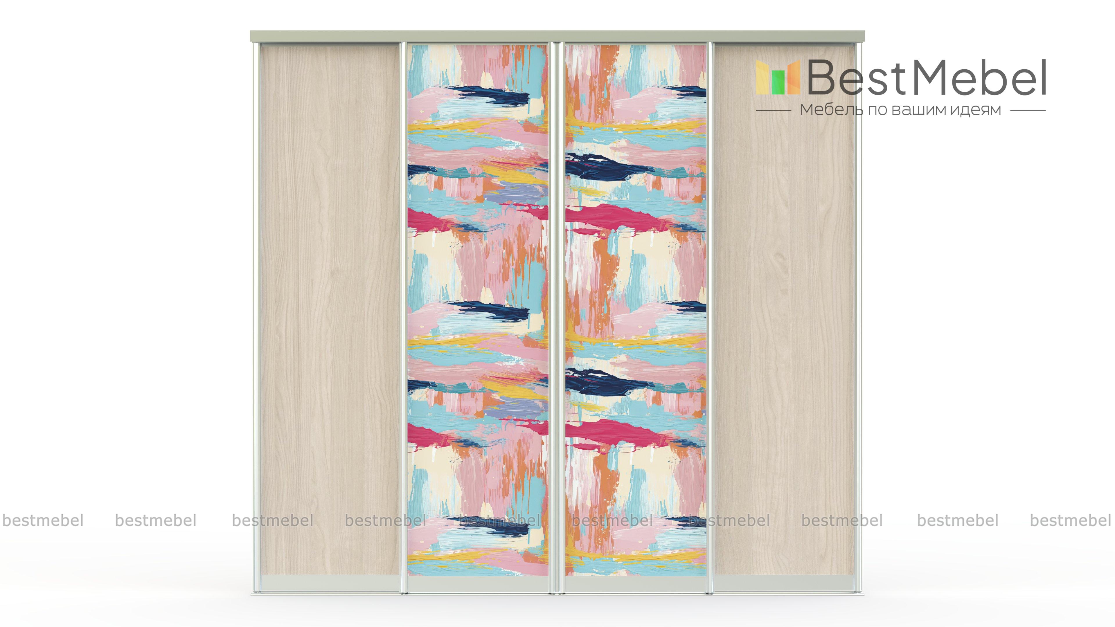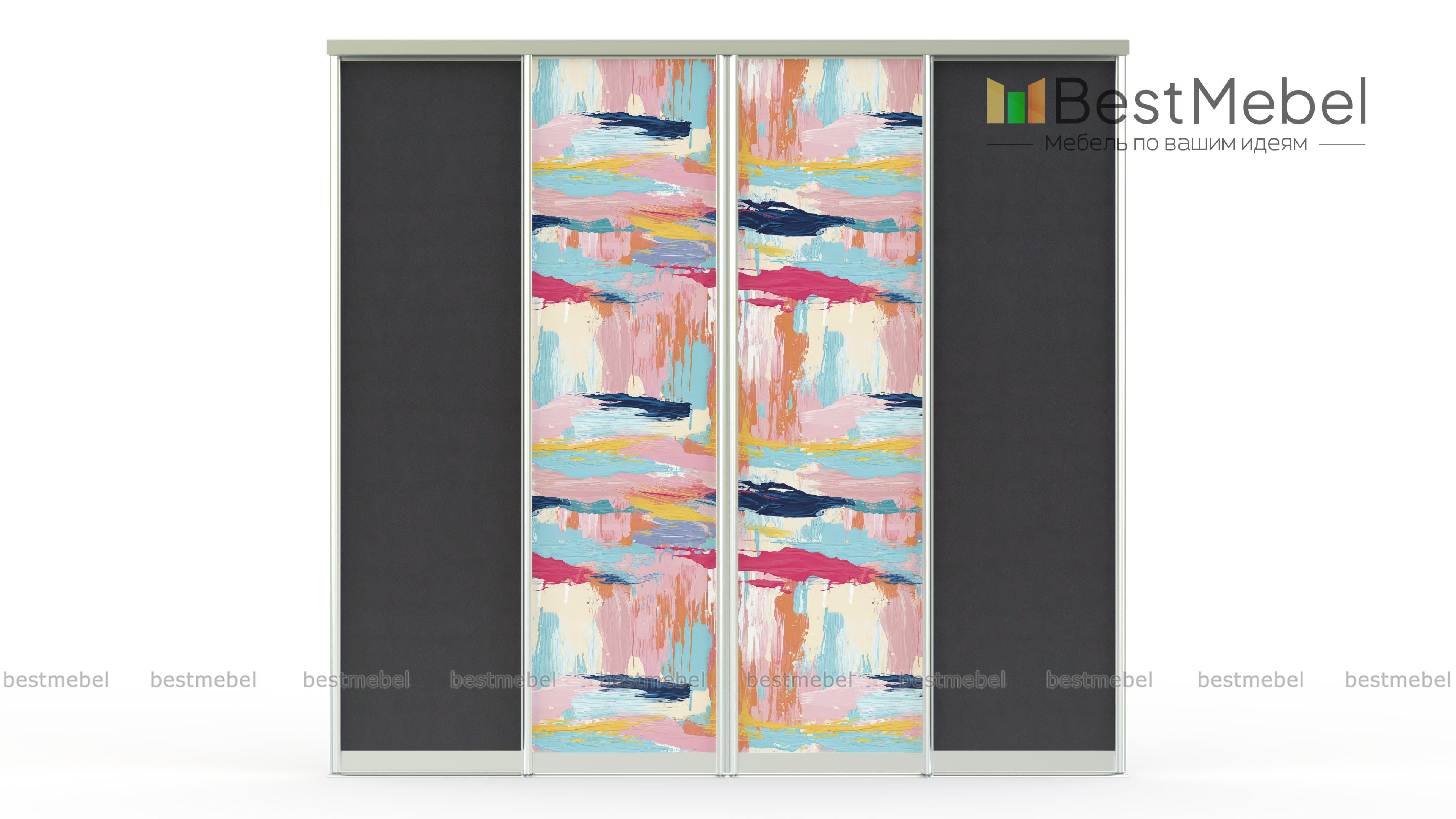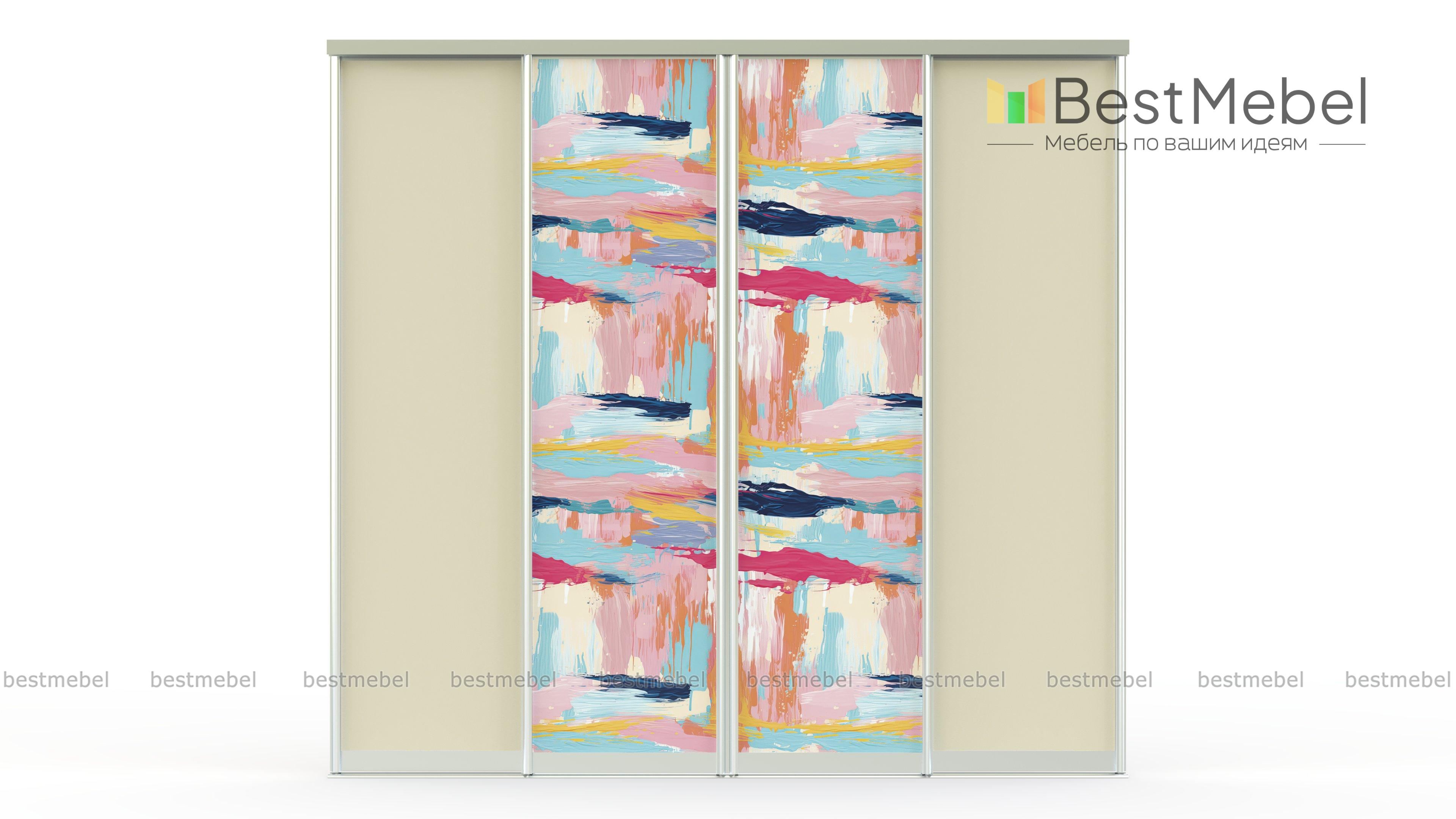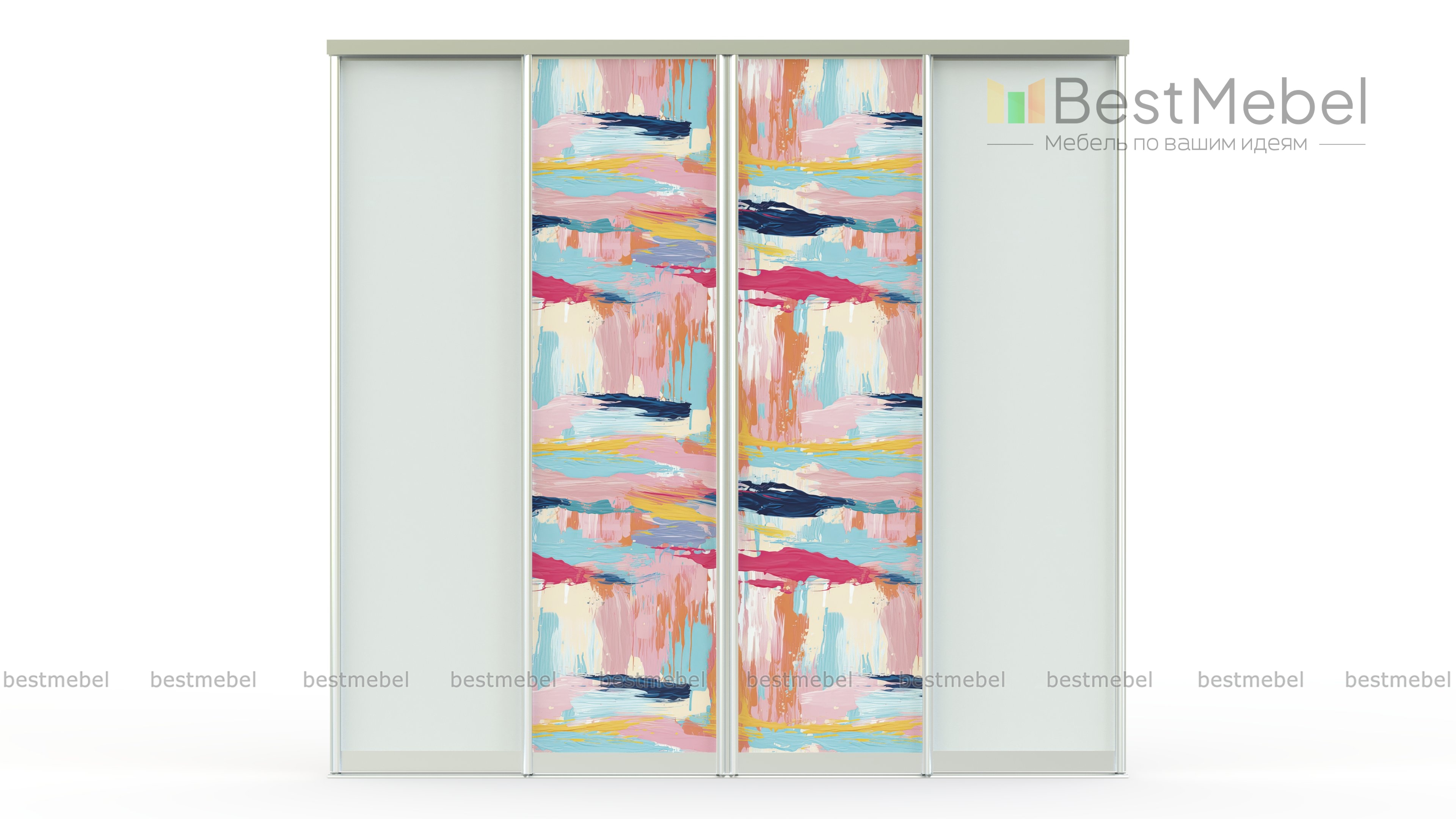 Двери-купе Риот 1 BMS в светлых тонах гармонично впишутся в пространство небольшой спальни или детской. Два однотонных полотна в алюминиевых рамах и два украшенных яркой цветной абстракцией составляют стильный раздвижной фасад. Конструкция отличается простотой монтажа, безопасностью и комфортом в эксплуатации, а также обеспечивает удобный доступ к вещам. Купить двери-купе Риот 1 BMS для шкафа или гардеробной вы сможете на сайте нашего интернет-магазина.