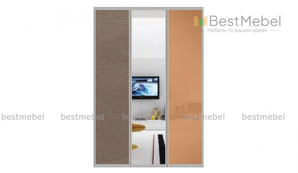 Двери-купе Вива 30 BMS выполнены в теплой коричневой гамме. В оформлении трех створок скомбинированы разные фактуры – текстурная экокожа, стекло в пленке Оракал и зеркальное полотно, незаменимое для примерок и визуально расширяющее пространство. Заключенные в рамы из профиля, створки отличаются прочностью и дополнят раздвижную систему шкафа-купе или гардеробной. Купить двери-купе Вива 30 BMS приглашаем в наш интернет-магазин с подбором оптимальных размеров.