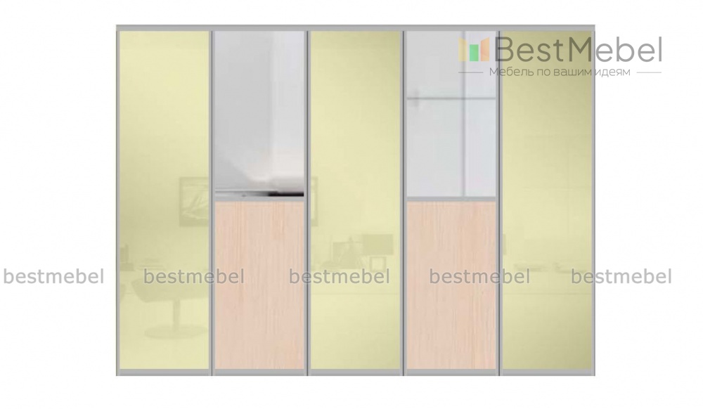 Двери-купе Юла 2 BMS подчеркнет достоинства современных интерьеров. В оформлении пятидверного готового фасада сочетаются створки в глянцевой пленке Оракал бежевого цвета и комбинированные с зеркалами. Двери с прочным каркасом из профиля отличаются надежностью и безопасностью в эксплуатации, а также не смотрятся громоздко и делают комнату визуально просторнее и светлее. Купить двери-купе Юла 2 BMS для монтажа гардеробной вы сможете в нашем интернет-магазине.