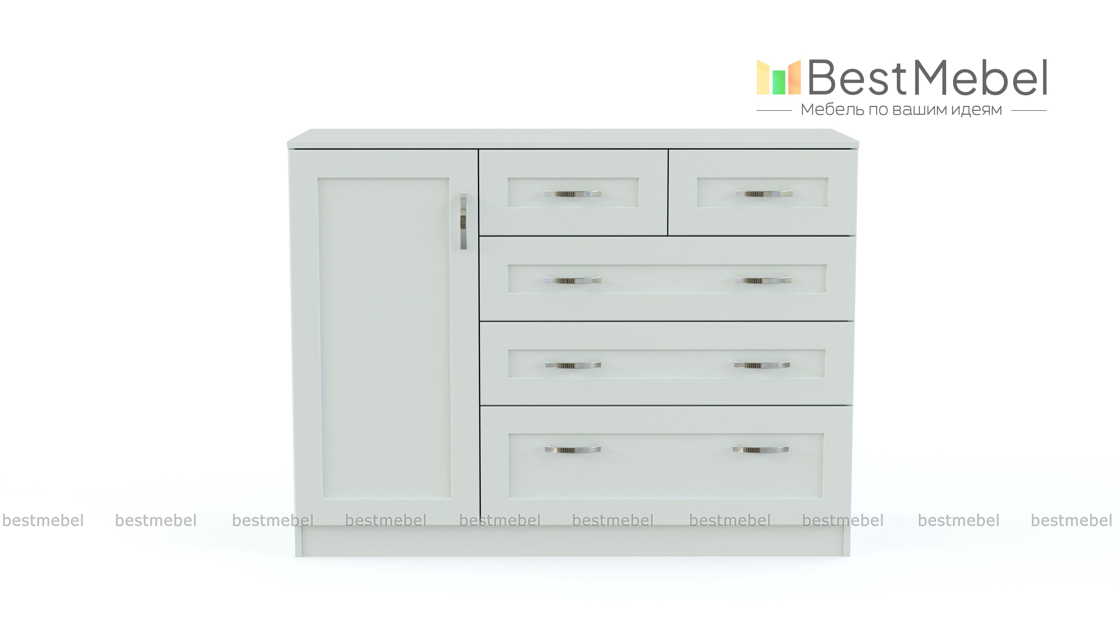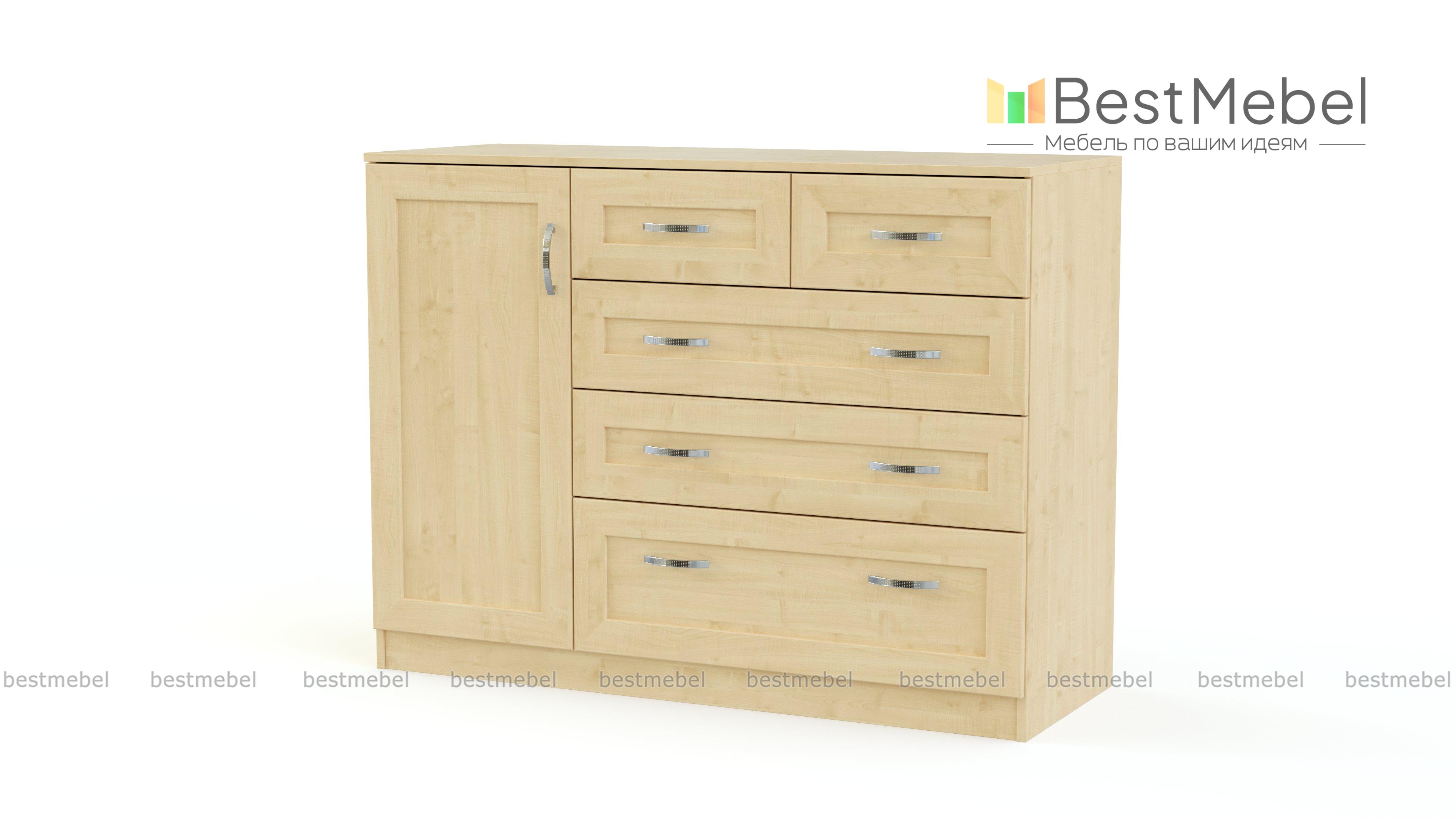 Комод №5 МДФ Люкс BMS украсит классический интерьер и обеспечит бережное хранение вашим вещам. В левой части комода находятся полки за распашной дверцей, а справа - пять выдвижных ящиков разных размеров, в которых удобно хранить как мелочи, так и одежду и постельные принадлежности. Фасады насыщенного природного оттенка декорированы рамочным профилем и изящными ручками-скобами. Купить комод №5 МДФ Люкс BMS с выбором размеров и цветовой гаммы можно на сайте нашего интернет-магазина.