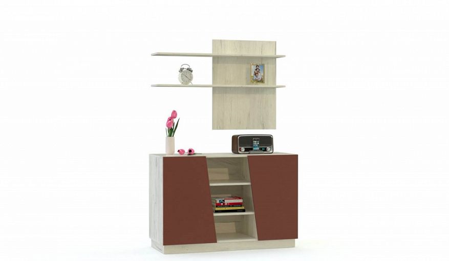 Комод Лайт BMS дополнит другие предметы серии или станет стильным акцентом в интерьере спальни или гостиной. Широкая комбинированная модель на высоком цоколе оборудована двумя глухими распашными отделениями и тремя открытыми секциями, а необычный вид ей придают скошенные дверцы. Навесное панно с выходящими за периметр полками, выполненное в тон корпусу, позволит эффектно представить книги и предметы декора. Купить комод Лайт BMS вы сможете на сайте нашего интернет-магазина.