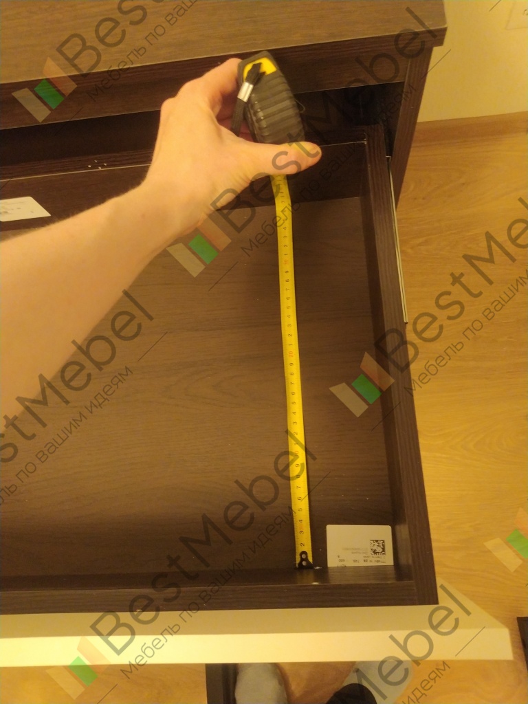 Покупала из распродажи, вышло немного дешевле, качество и дизайн очень понравились, по конструктивно жаль что ящики оказались маловаты по высоте, на фото видно, не все коробки убрались туда. Сборка достаточно сложная у этого изделия, у фасадов разный отступ для крепежа, это надо учитывать. Рекомендую доверить сборку все таки сотруднику компанию.