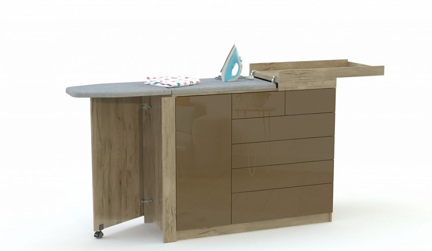 Комод Маринер 5 BMS с корпусом в теплом крафтовом оттенке и глянцевым фасадом без лицевой фурнитуры выглядит уместно в любом помещении дома. Вместительный трансформер с шестью выдвижными ящиками и распашным отделением не только решит проблему хранения большого количества вещей, но и поможет оборудовать комфортное место для глажки. В устойчивую гладильную доску комод превращается с помощью откидной столешницы и складной секции на выкатной опоре. Купить комод Маринер 5 BMS вы сможете на сайте нашего интернет-магазина.