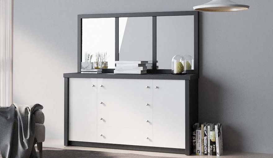 Комод Олива 5 BMS, выполненный в сочетании темного венге корпуса и светлого фасада, привлекает строгими, четкими линиями. Широкая модель оборудована рядом из четырех выдвижных ящиков и двумя распашными отделениями с полками, а на столешнице располагается трехсекционное зеркало. Элегантный комод украсит современный спальный интерьер и поможет компактно разместить постельные принадлежности, уходовые средства и множество мелочей. Купить комод Олива 5 BMS приглашаем в наш интернет-магазин по выгодной цене.