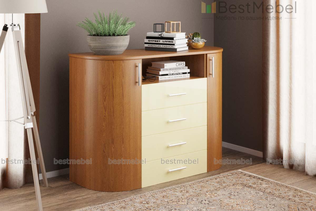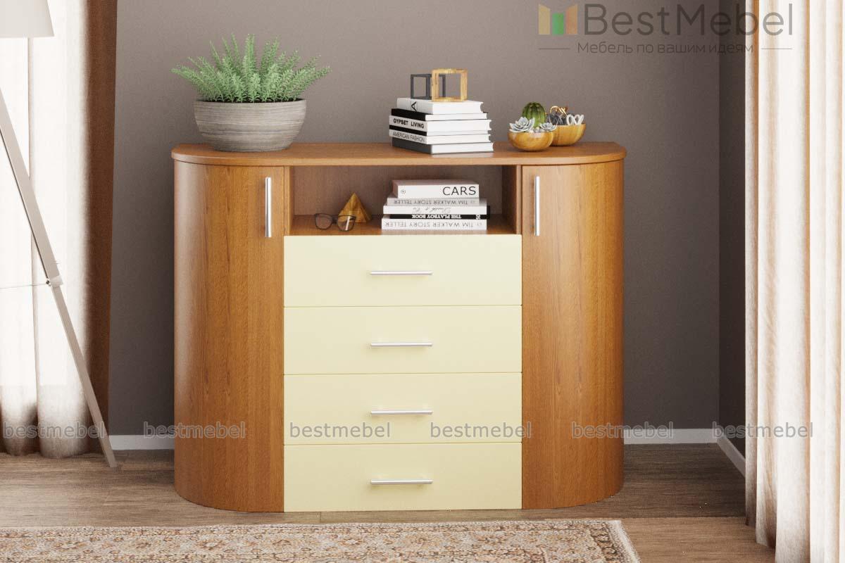 Комод радиусный Этюд 17 BMS дополнит интерьер гостиной или спальни удобной системой хранения и поможет оформить зону ТВ. Комбинированная модель оборудована просторной скругленной столешницей, нишей под аппаратуру, четырьмя выдвижными ящиками и двумя распашными отделениями с выпуклыми радиусными фасадами. В оформлении комода гармонично сочетаются древесные тона и бежевый глянец. Купить комод радиусный Этюд 17 BMS приглашаем на сайт нашего интернет-магазина.