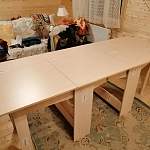 Заказывал стол на дачу длиной 2400. Собрали без проблем. Полностью разложенный позволяет усадить 8 человек с запасом. За столом можно сидеть в значительно большем количестве, но начинают мешать широкие средние ноги. За то он очень быстро трансформируется в широких пределах. Надо иметь ввиду, что центральная вставная часть столешницы никак не крепится. Если соберетесь двигать полностью разложенный стол, то части столешницы будут "елозить" между собой.