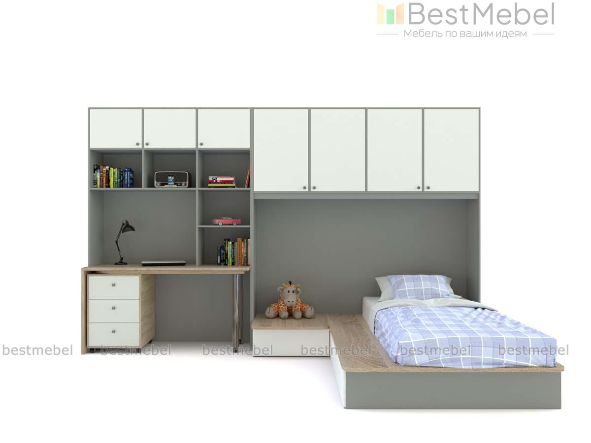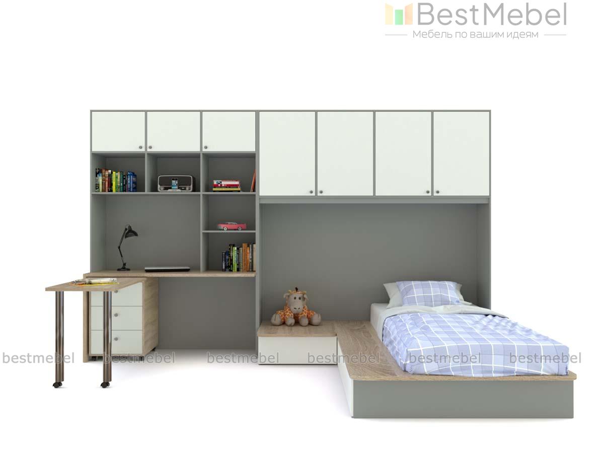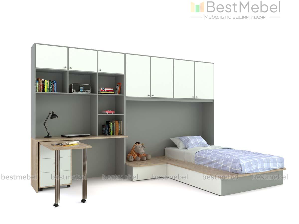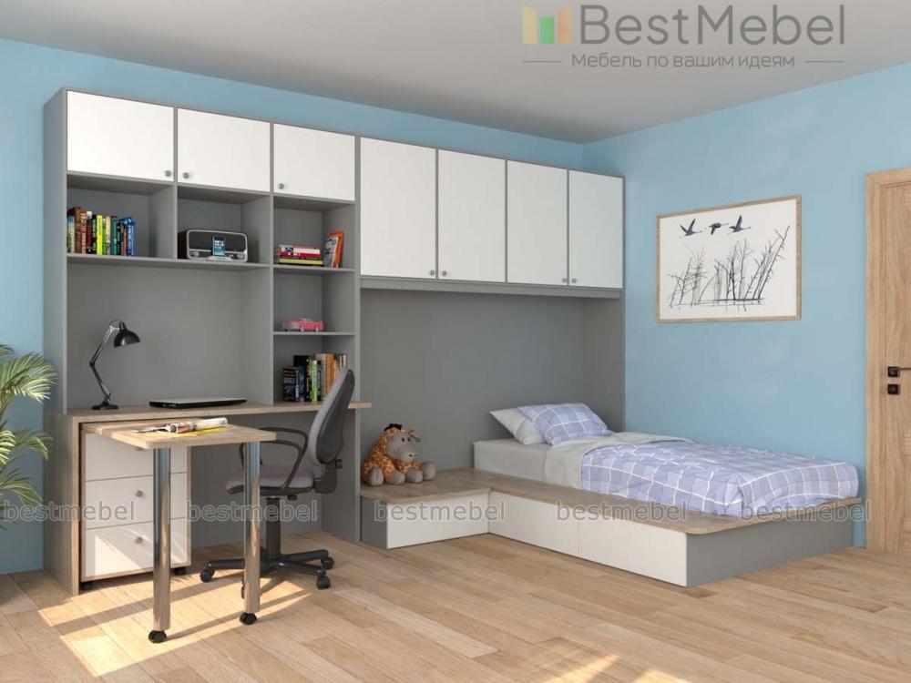 Детская комната Лайма 14 BMS непременно понравится подросткам своей функциональностью и современным дизайном. Модульная композиция поможет рационально организовать пространство и вписать в интерьер зону отдыха, комфортное рабочее место и удобную систему хранения. В комплекте секция с распашными антресольными шкафчиками, кровать-подиум с ящиками в основании и прикроватной тумбой, дополненный стеллажом письменный стол и мобильный поворотный столик с тумбой. Купить детскую комнату Лайма 14 BMS приглашаем к нам в интернет-магазин.