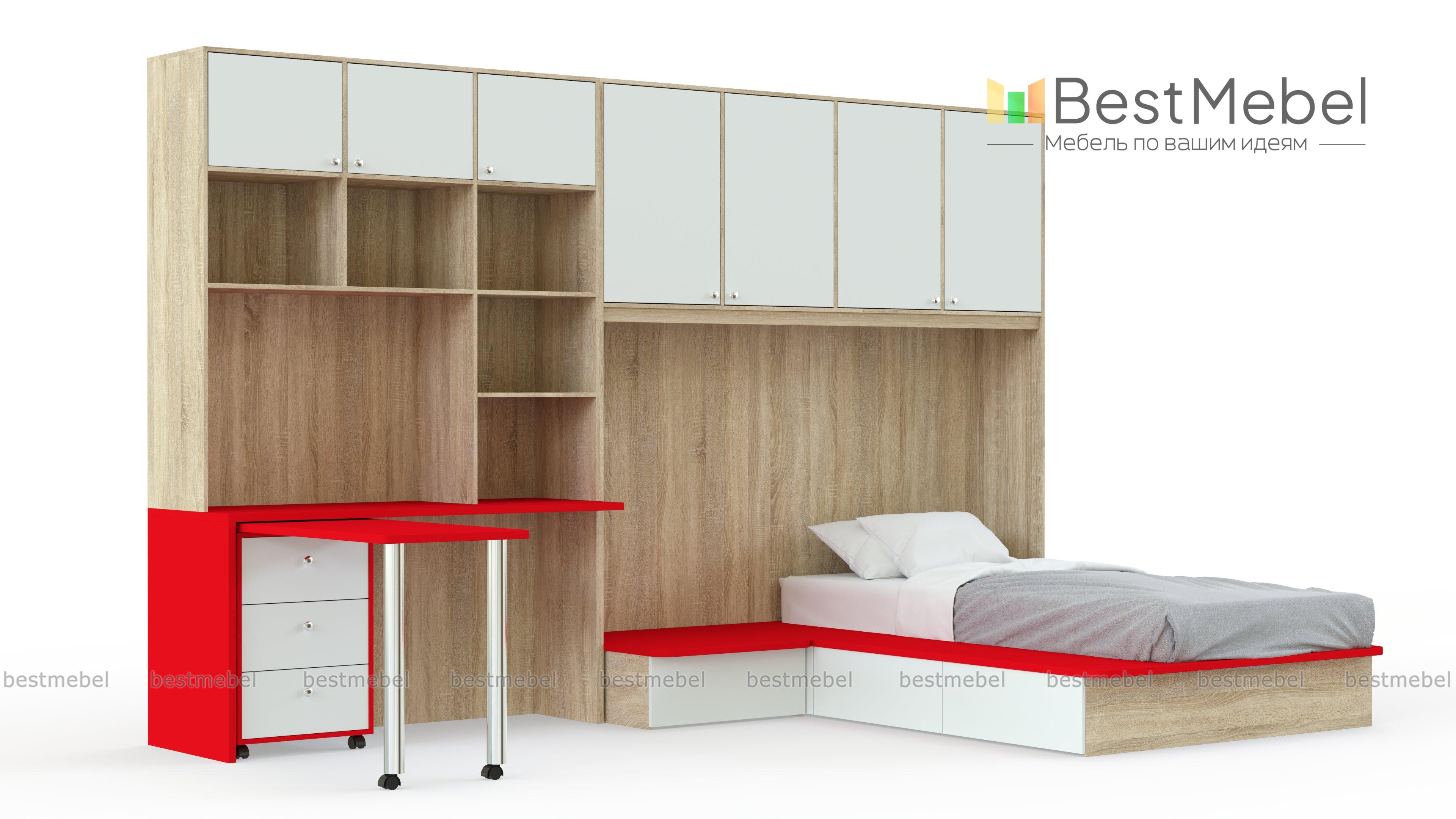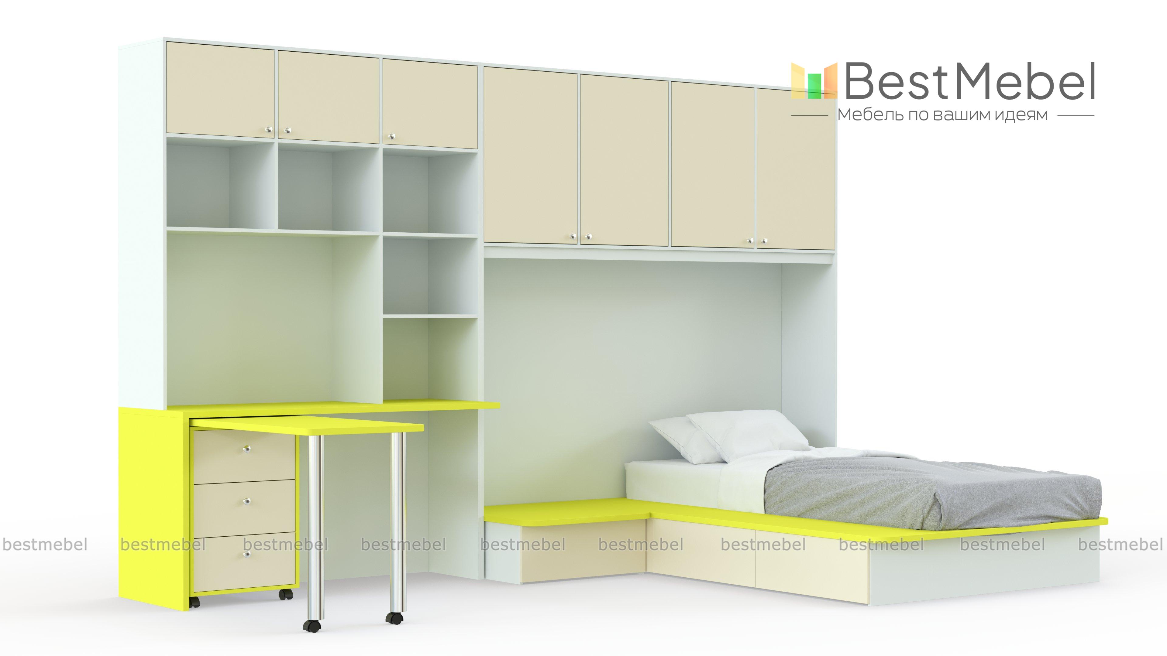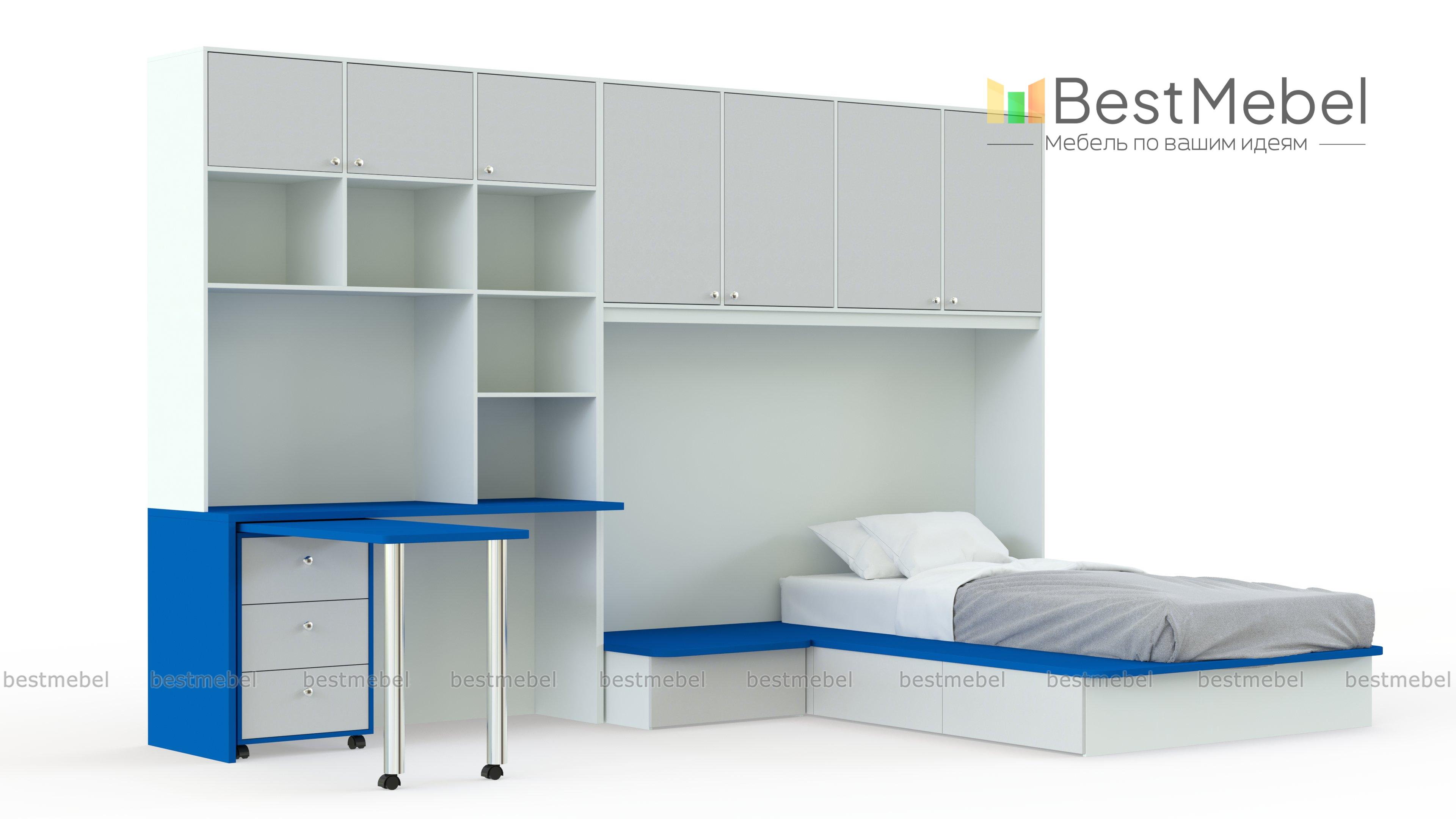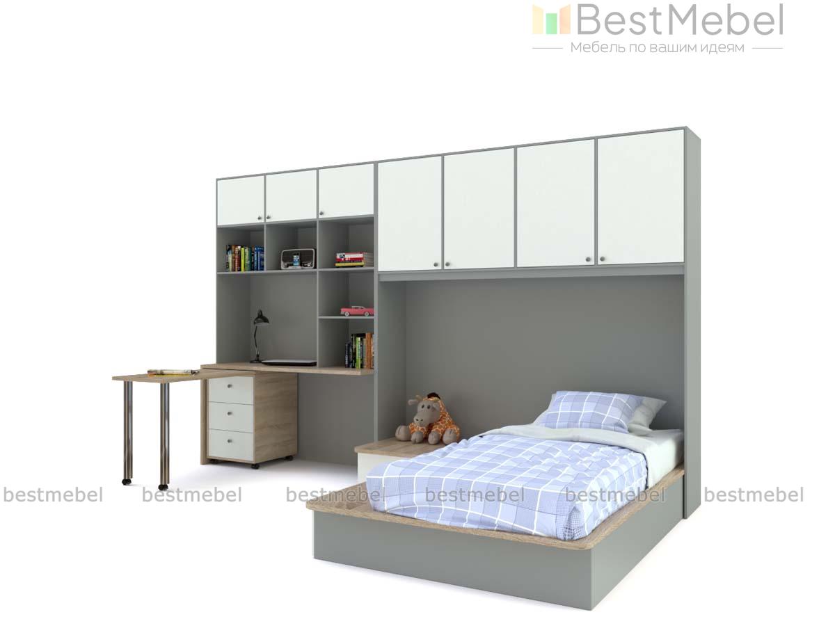 Детская комната Лайма 14 BMS непременно понравится подросткам своей функциональностью и современным дизайном. Модульная композиция поможет рационально организовать пространство и вписать в интерьер зону отдыха, комфортное рабочее место и удобную систему хранения. В комплекте секция с распашными антресольными шкафчиками, кровать-подиум с ящиками в основании и прикроватной тумбой, дополненный стеллажом письменный стол и мобильный поворотный столик с тумбой. Купить детскую комнату Лайма 14 BMS приглашаем к нам в интернет-магазин.
