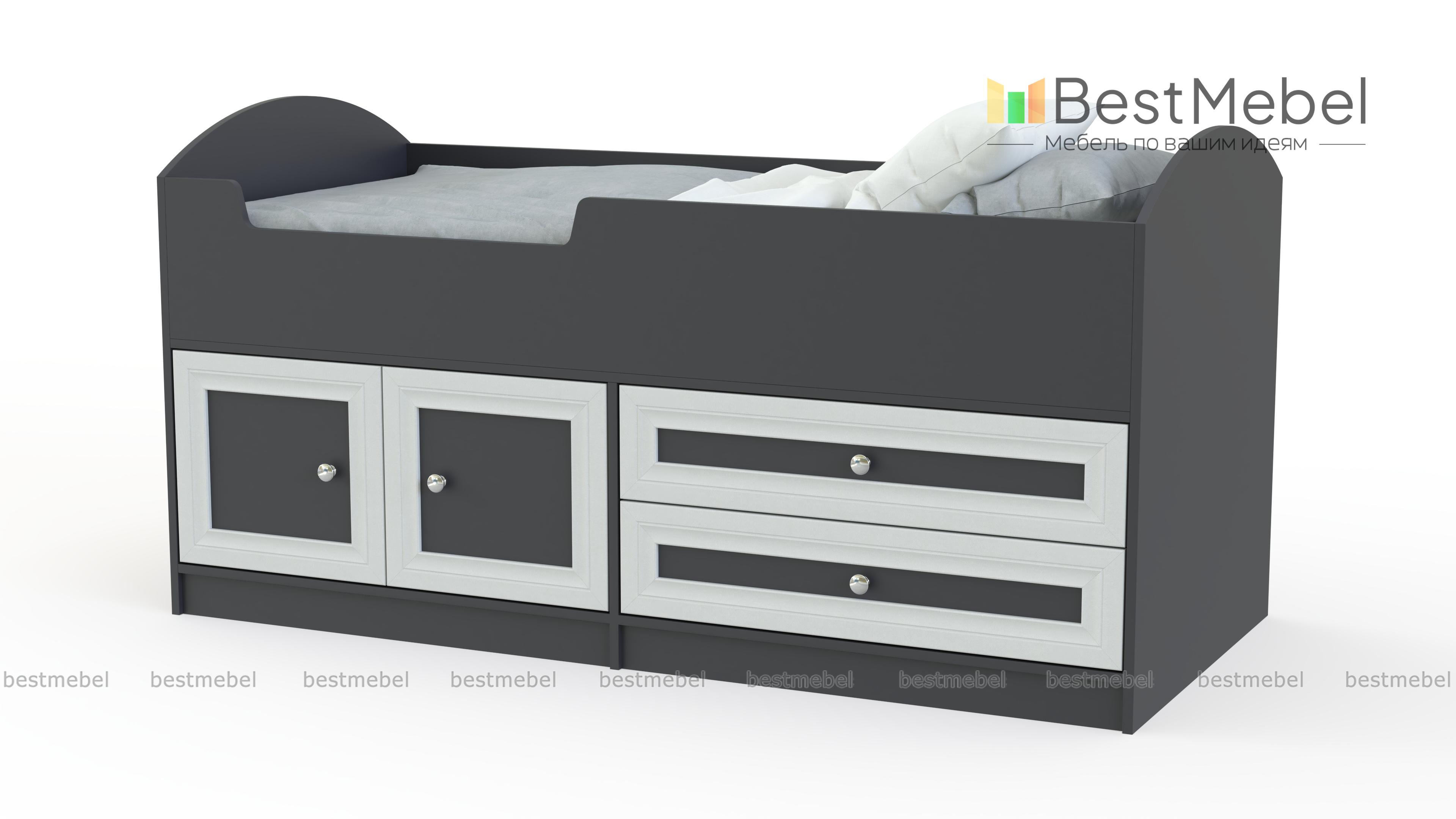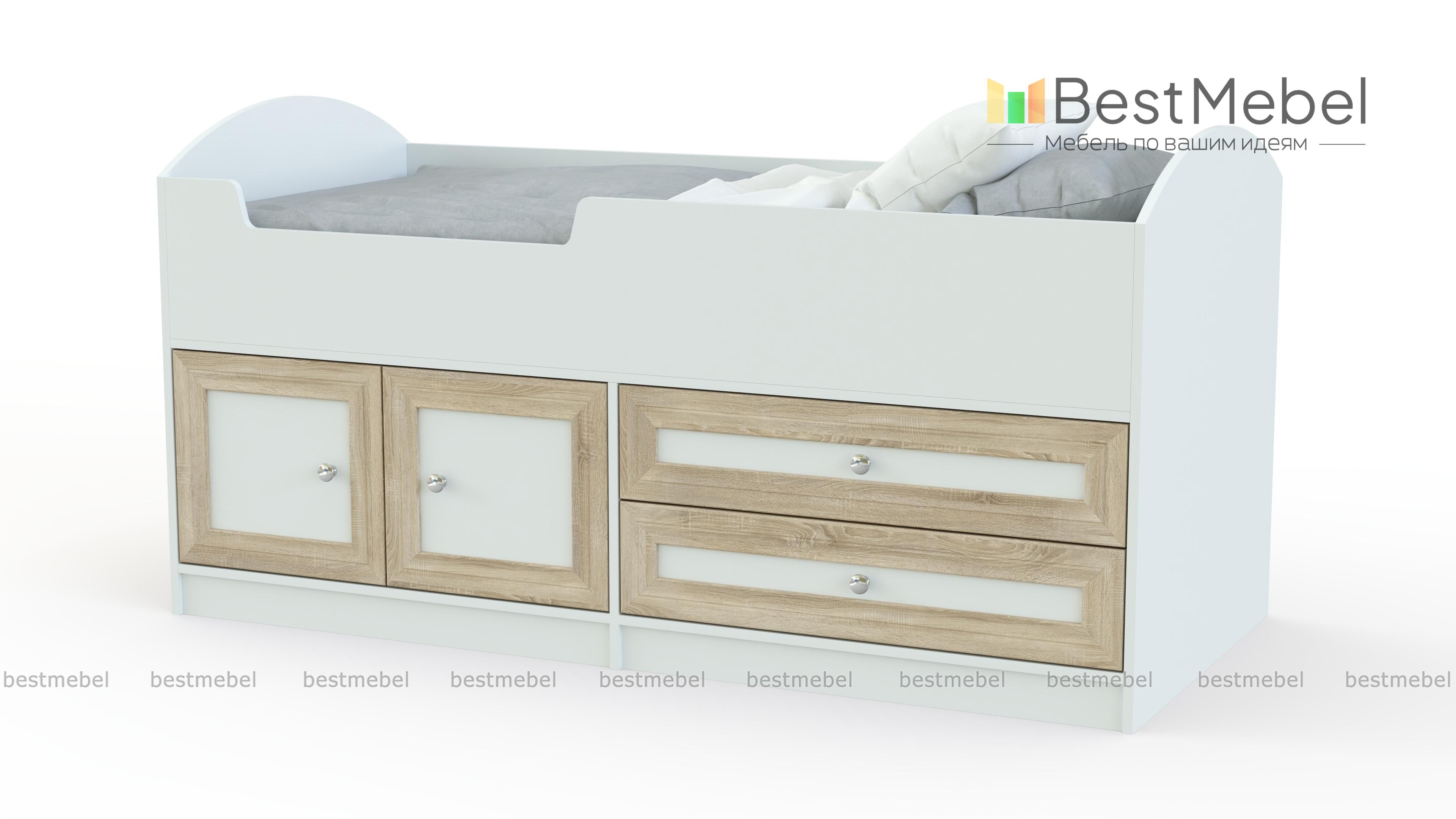Симпатичная детская кровать Твинс-3 BMS решает проблему с организацией места для сна ребенку-дошкольнику. В конструкции соединяются постель (габариты 60 х 170 см) с ДСП-основанием и элементы для хранения одежды, игрушек, текстиля. Они представлены в виде двух выдвижных ящиков и объемной ниши с распашными дверцами. Привлекательное рамочное оформление фасадов создает респектабельный запоминающийся облик, лаконичный стиль. В цветовой гамме ЛДСП каркаса сочетаются два оттенка.