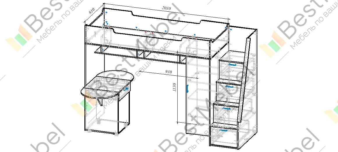 Детская кровать Ульяна МДФ BMS занимает совсем немного места и оборудована самым необходимым ребенку или подростку для комфортного отдыха, учебы и хранения вещей. Двухъярусная композиция включает в себя просторное спальное место, лестницу-комод с ящиками для игрушек, мини-диван, книжные полки, распашной шкафчик для одежды и выкатной компьютерный стол с раскладной столешницей. Купить детскую кровать Ульяна МДФ BMS, выполненную в нейтральных древесных тонах, вы сможете в нашем интернет-магазине.