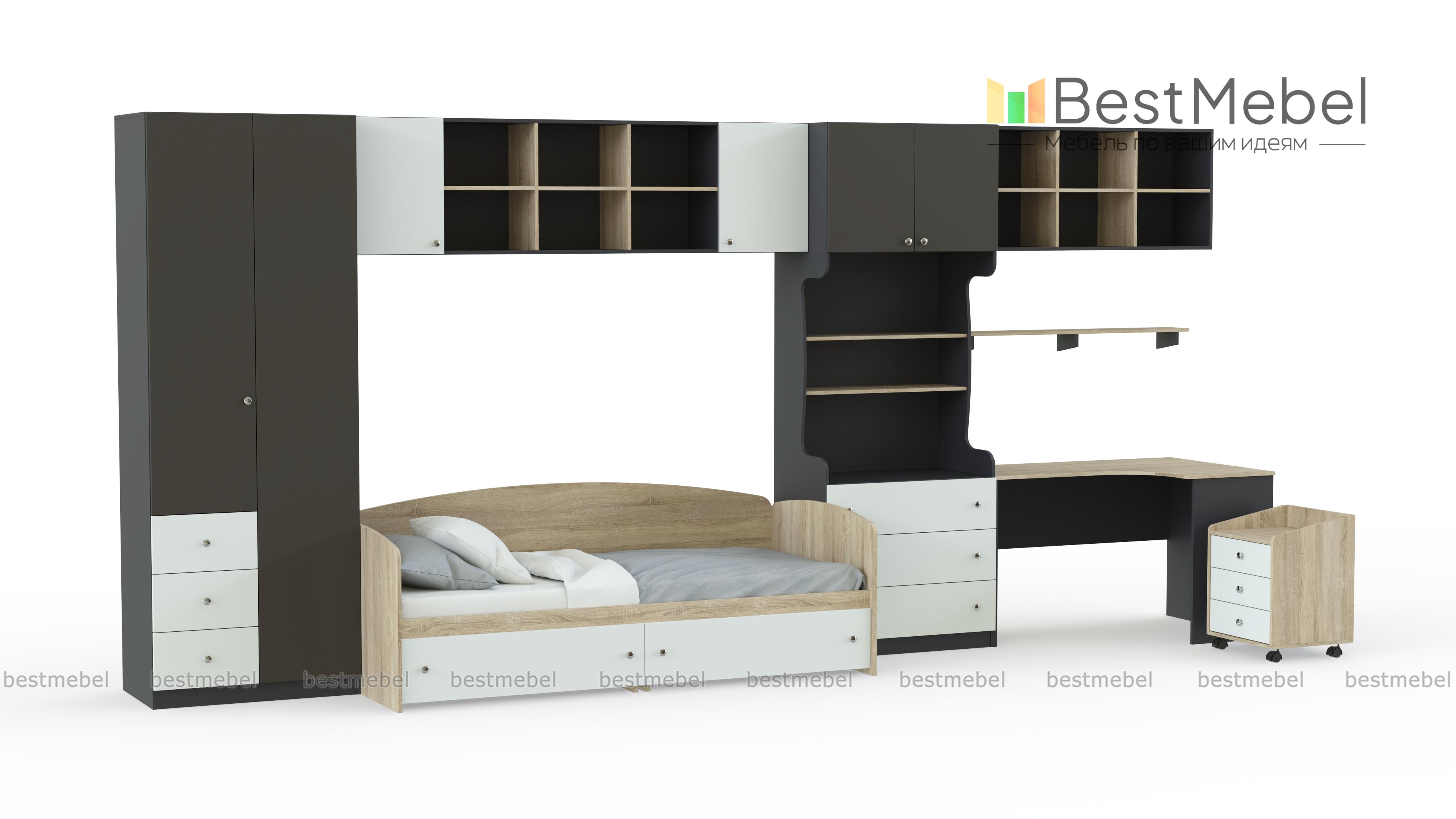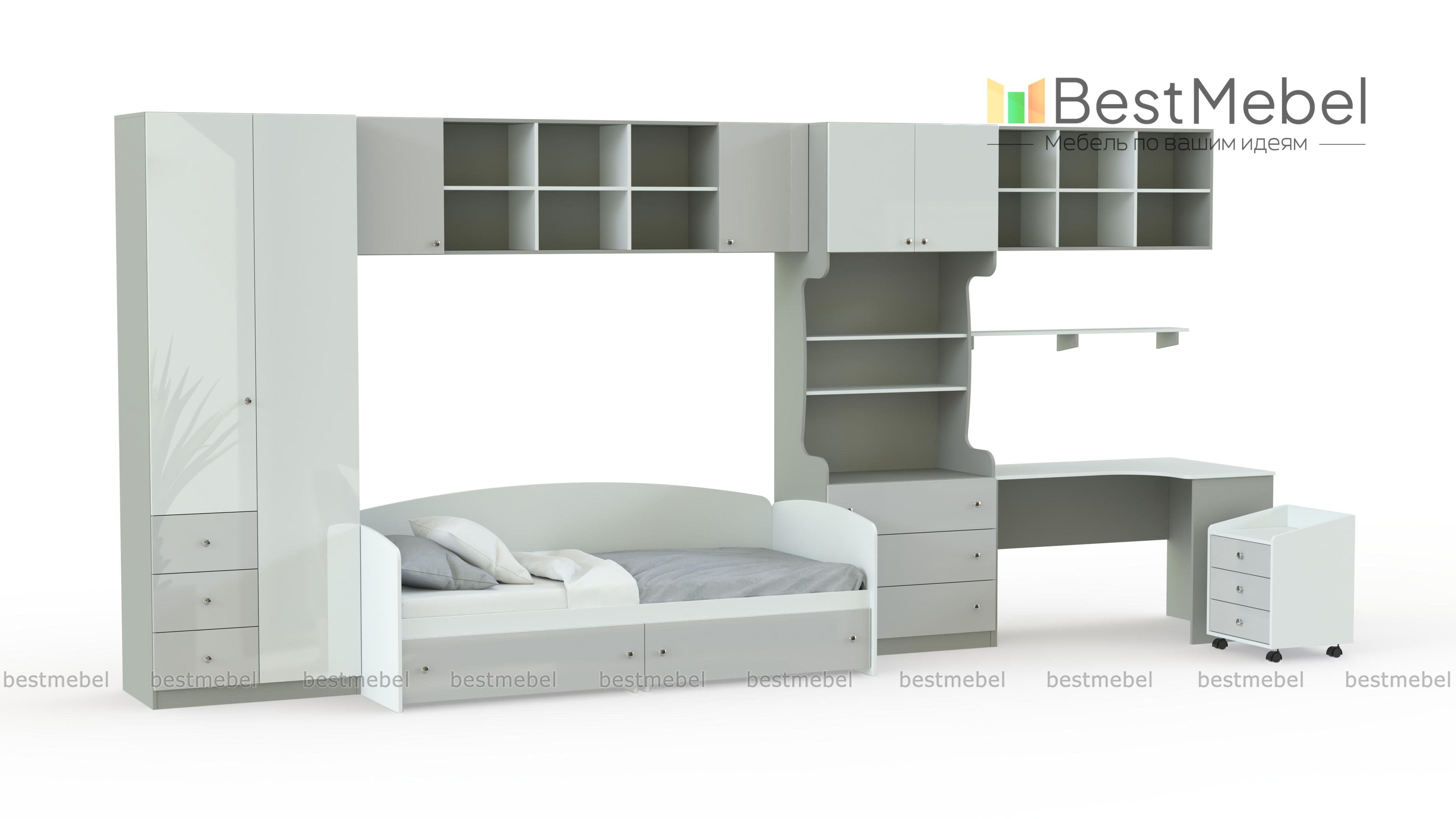 Детская мебель Белоснежка 7 BMS – современный модульный комплект, визуально легкий и практичный. Отдельные элементы вы сможете вписать в помещения любой планировки, а свежие краски создадут комфортную для отдыха и учебы атмосферу. В комплект входят кровать-софа с ящиками, двухстворчатый платяной шкаф, антресоль, навесные полки, комбинированный книжный шкаф, угловой компьютерный столик и тумба на колесиках. Все углы безопасно закруглены. Купить детскую мебель Белоснежка 7 BMS вы сможете в нашем интернет-магазине с подбором оптимальных параметров.