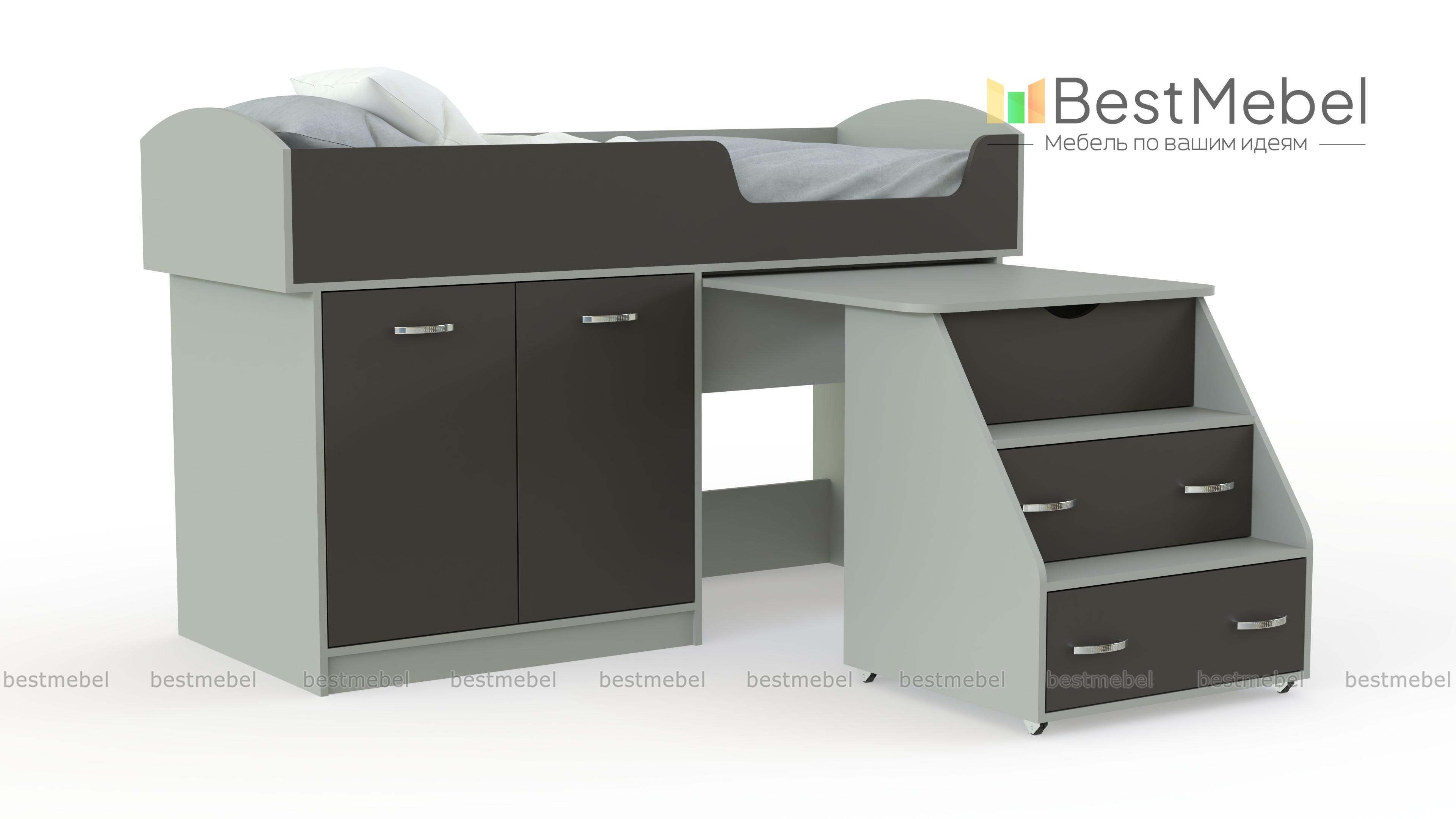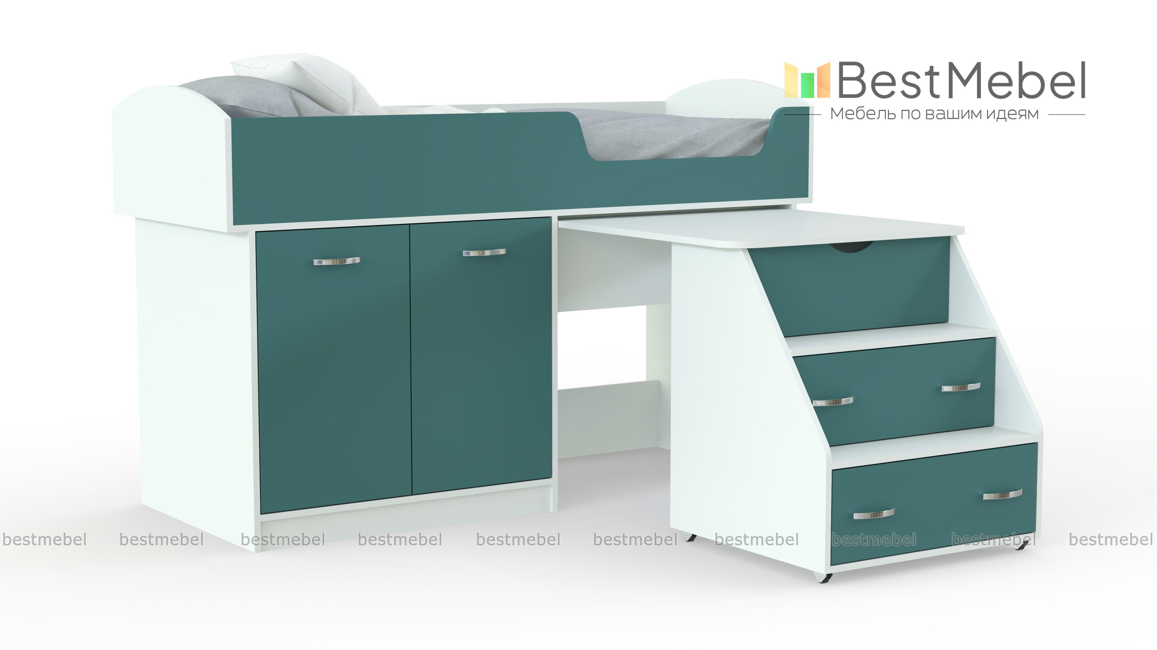 Кровать чердак Дюймовочка 2 BMS отличается миниатюрными размерами и редкой функциональностью. Комплект оборудован кроватью с защитным бортиком, лестницей-стеллажом с выдвижными ящиками, рабочим столиком и встроенной распашной тумбой. Продуманная конструкция совмещает зону для отдыха и игр с просторными отделениями для хранения вещей ребенка. Благодаря возможности выбора расцветки фасадов вы легко впишете модель в интерьер. Купить кровать чердак Дюймовочка 2 BMS по лучшей цене приглашаем в наш интернет-магазин.