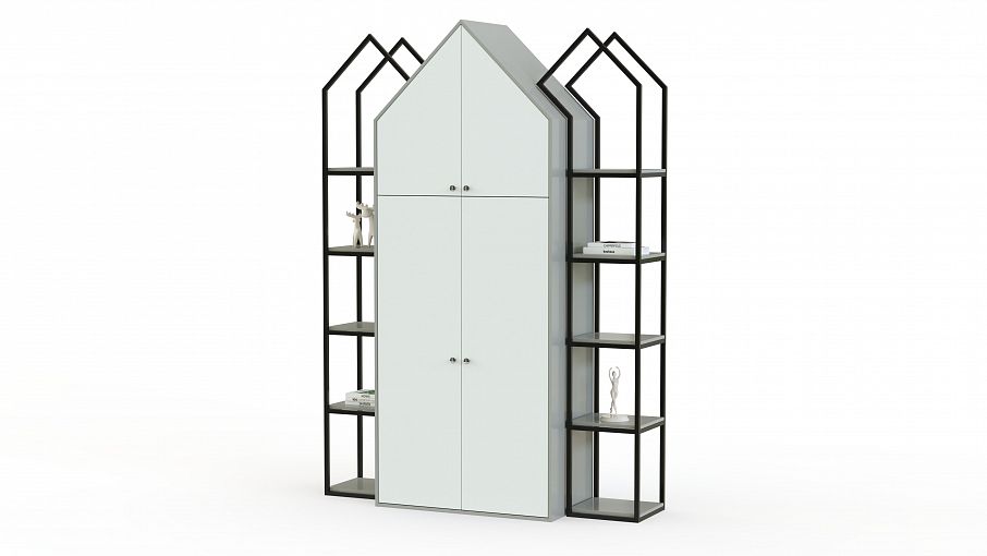 Шкаф Домик 6 BMS понравится даже подросткам благодаря трендовым элементам в дизайне. Монохромная гамма, глянец и контрастный металл создают интересную комбинацию для современной детской. В центре композиции - распашной шкаф в форме домика с крышей-антресолью, по бокам которого расположились фигурные книжные стеллажи на металлических каркасах. Купить шкаф Домик 6 BMS для размещения одежды, книг и игрушек вы сможете на сайте нашего интернет-магазина.