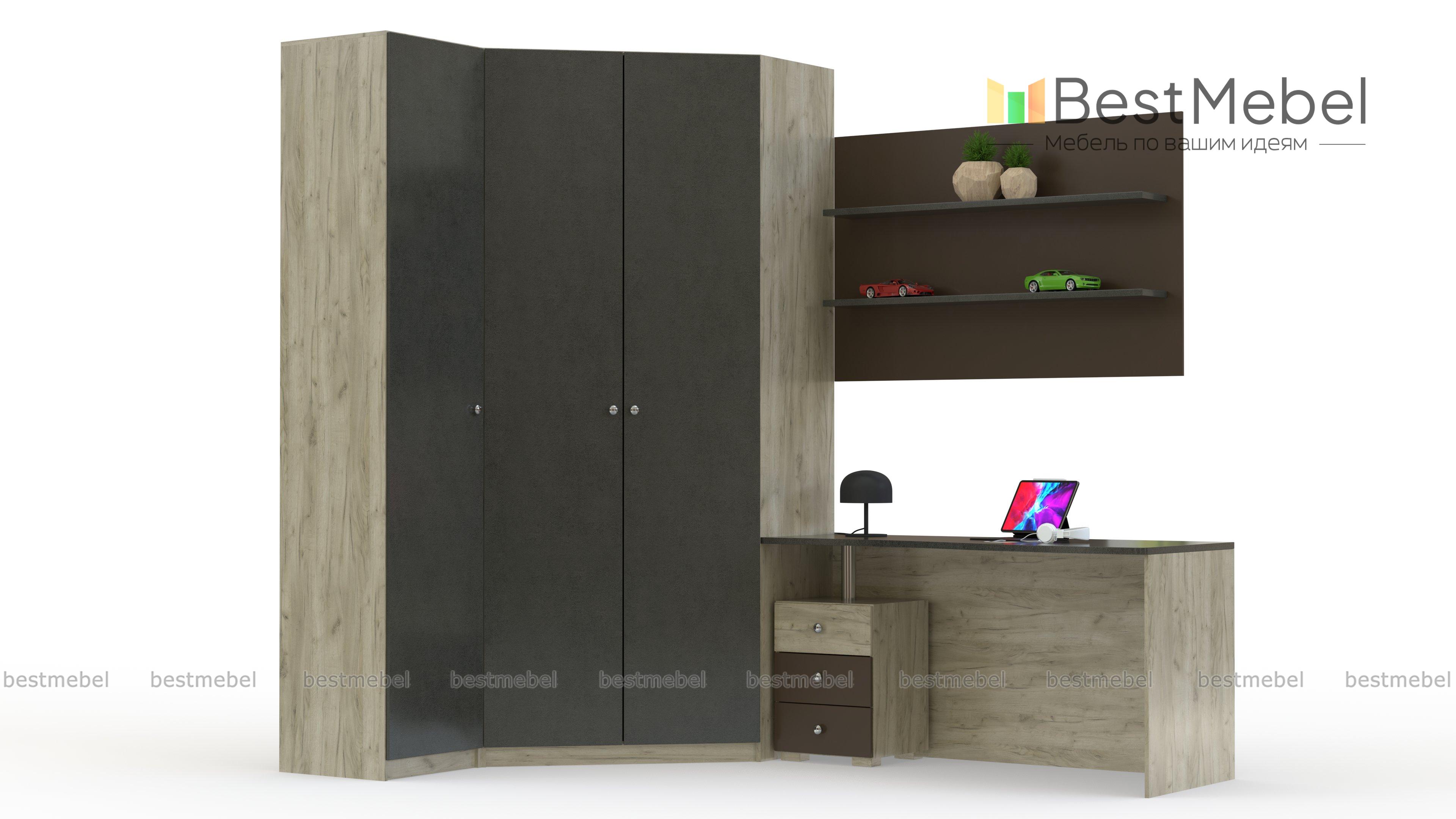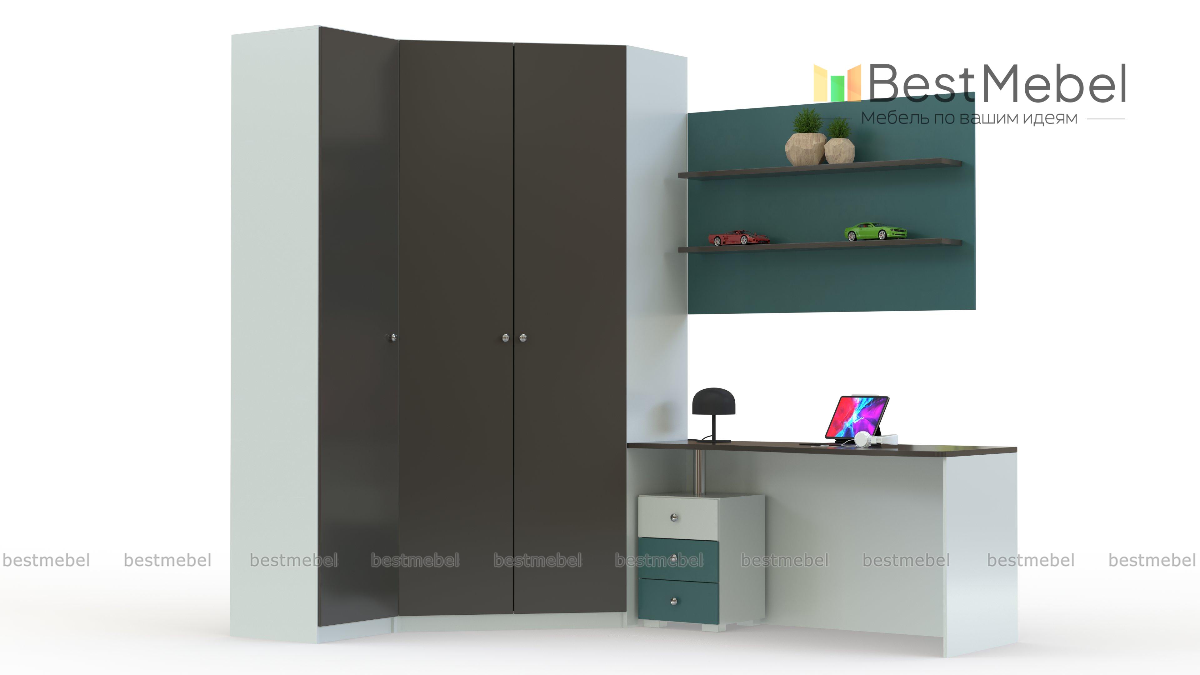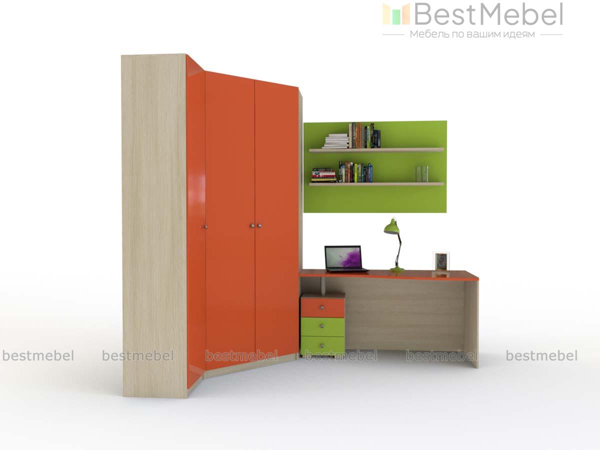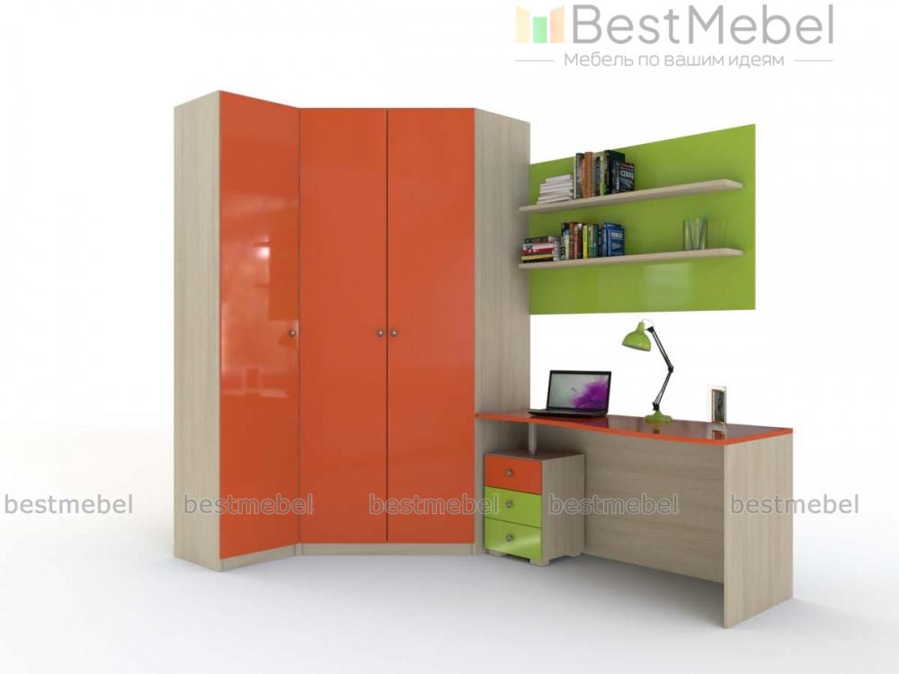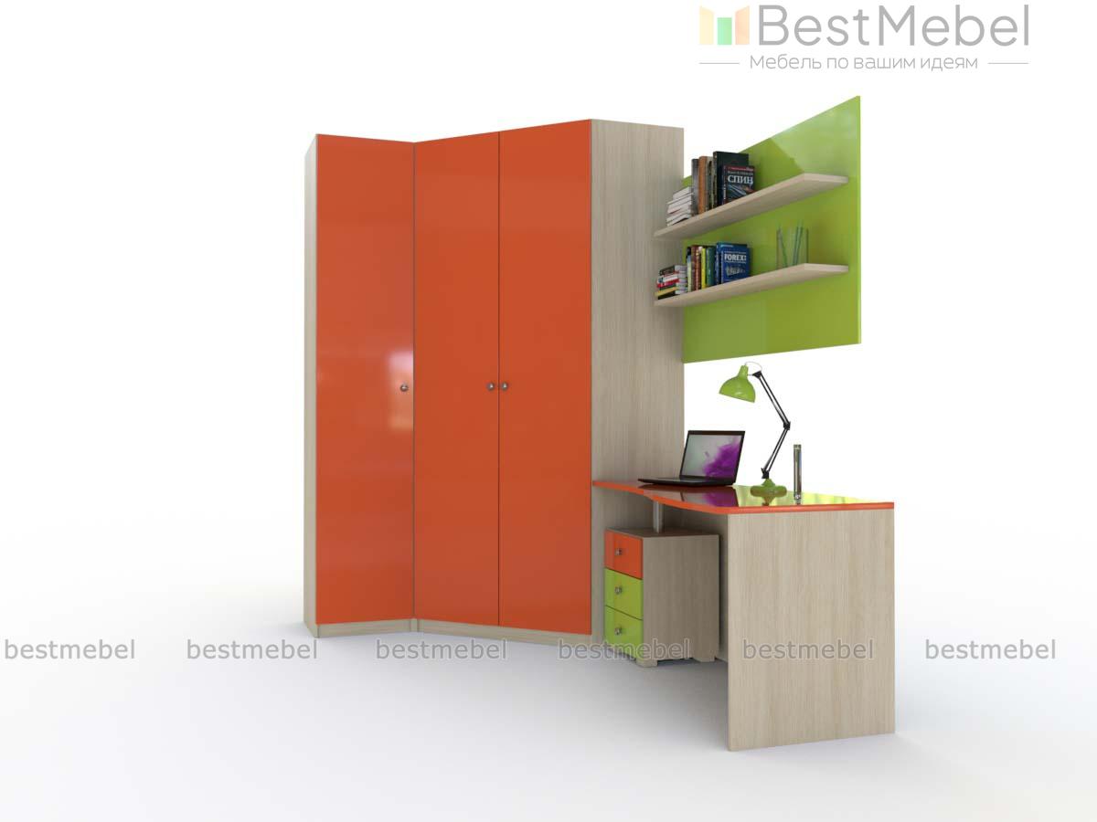 Шкаф угловой со столом Ярко BMS поможет обустроить уютную и стильную детскую. Модульная композиция включает в себя удобный для письма и работы за компьютером стол с эргономичной столешницей и тумбой, открытые навесные полки для книг и комплект из углового платяного шкафа и пенала. Вы сможете компактно разместить гардероб ребенка, школьные принадлежности и оборудовать полноценное рабочее место, сэкономив пространство. Оригинальными акцентами в интерьере станут матовые фасады. Купить шкаф угловой со столом Ярко BMS приглашаем в наш интернет-магазин по лучшей цене.