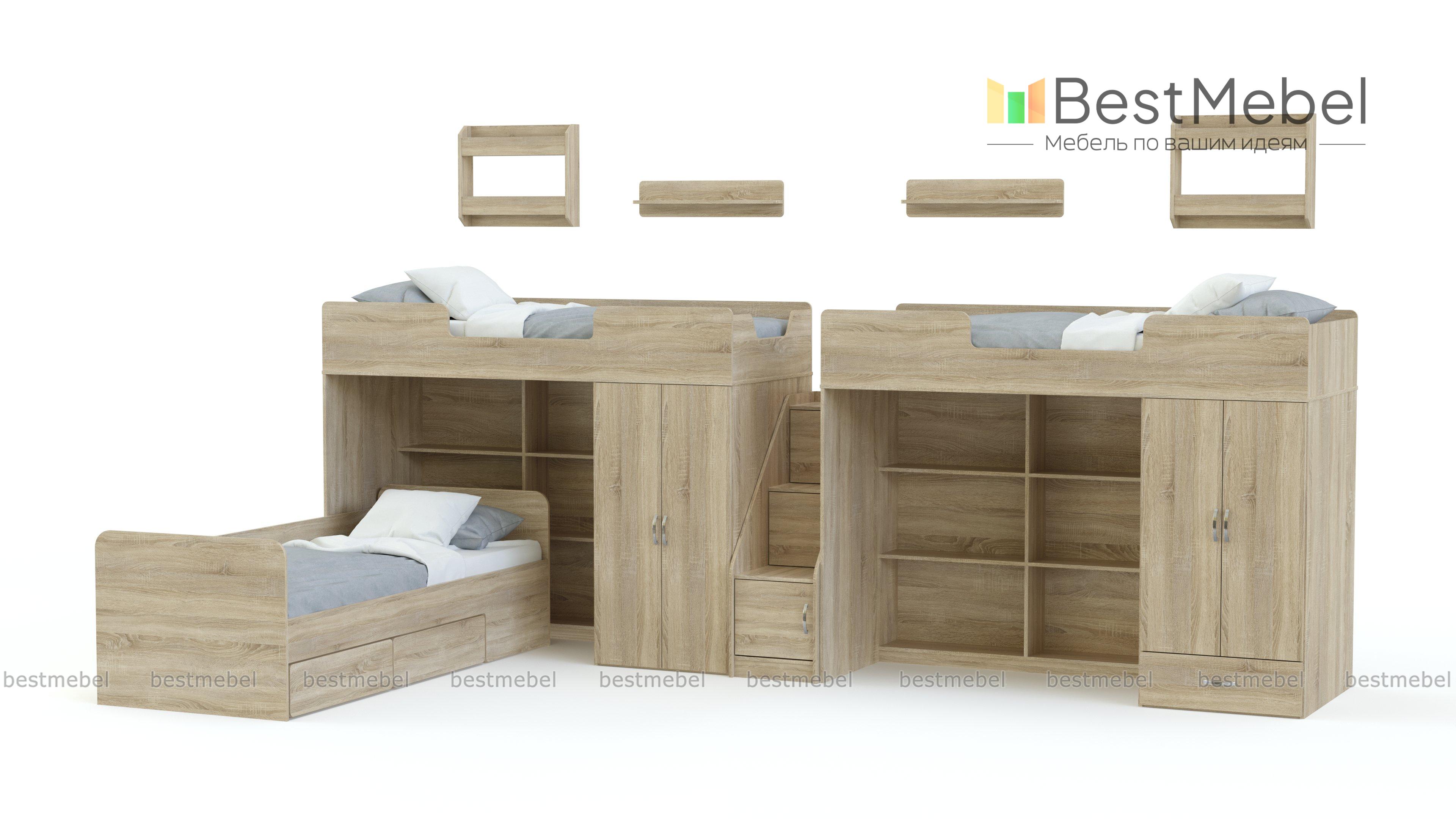 Трехъярусная кровать Миф 3.15 BMS – не просто комфортные спальные места для троих детей, а многофункциональная модель, которая организует размещение множества вещей. Кровати второго яруса оборудованы бортиками и приставной лестницей-стеллажом. Первый ярус – комбинированные шкафчики, открытые полки для книг и игрушек и удобная кровать-трансформер с выкатными ящиками. Для приятных мелочей предназначены навесные полочки. Купить трехъярусную кровать Миф 3.15 BMS по лучшей цене приглашаем к нам в интернет-магазин.