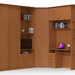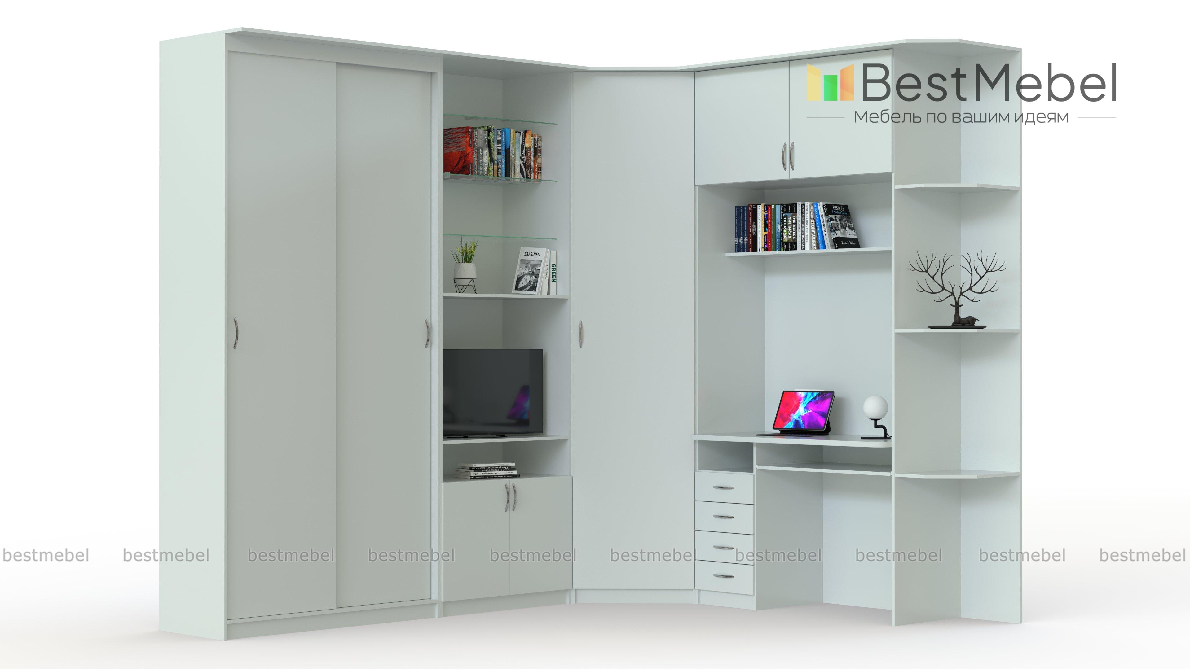 Угловой шкаф со столом Композиция-1 BMS отличается лаконичным и функциональным дизайном, который будет легко вписать в интерьер современного рабочего кабинета, молодежной комнаты. Композиция включает в себя двухдверный шкаф-купе для одежды, угловой шкаф, комбинированную секцию с тумбой, нишей под ТВ и полками, компьютерный стол с антресолью и торцевой стеллаж. Вы сможете не только хранить под рукой все необходимые рабочие материалы и книги, но и компактно разместить предметы гардероба. Купить угловой шкаф со столом Композиция-1 BMS приглашаем в наш интернет-магазин.
