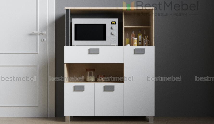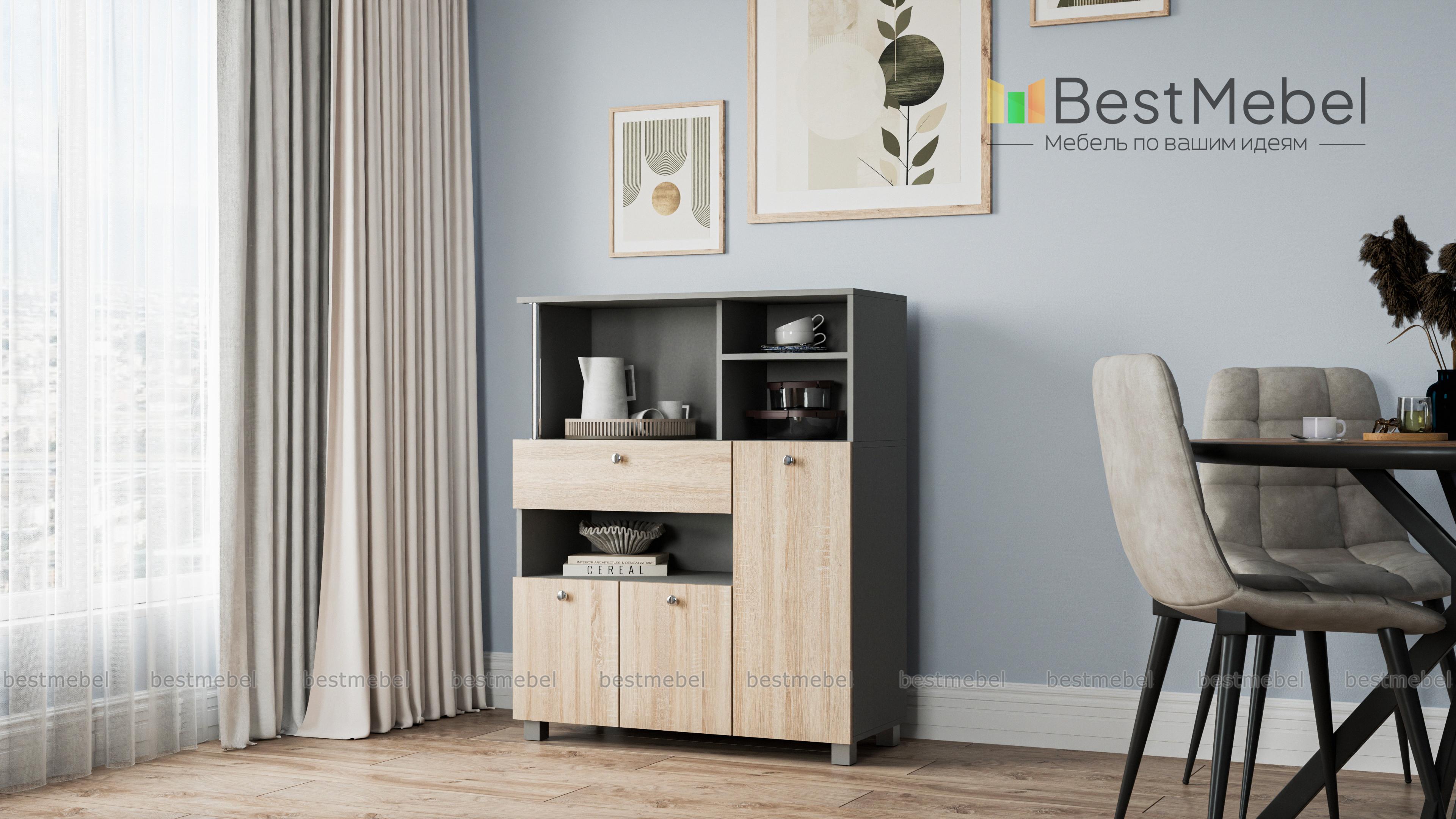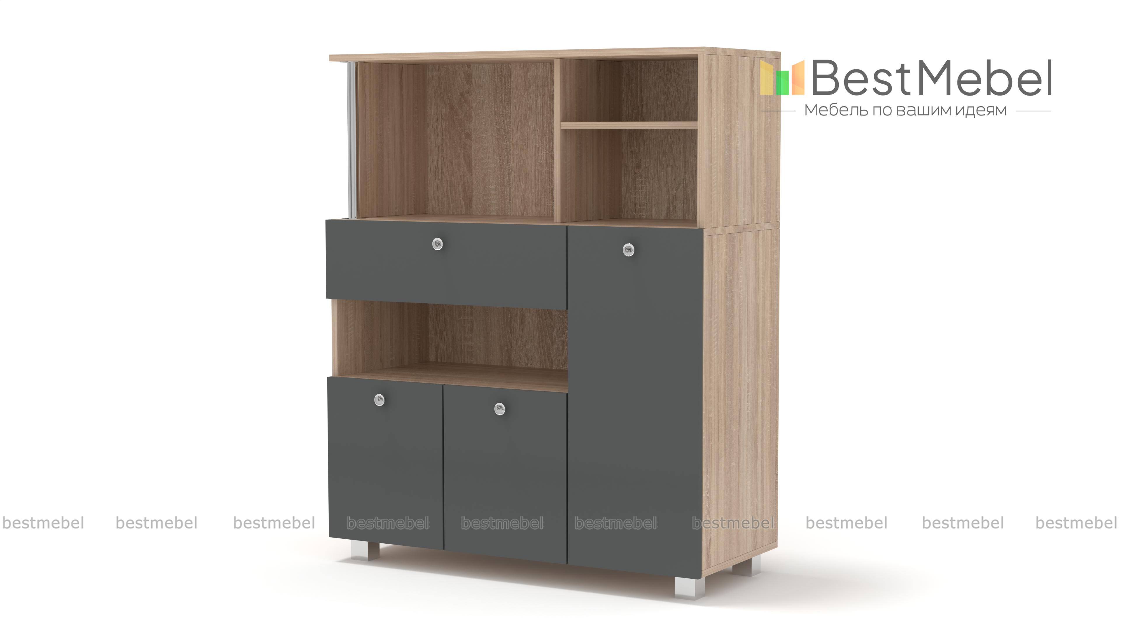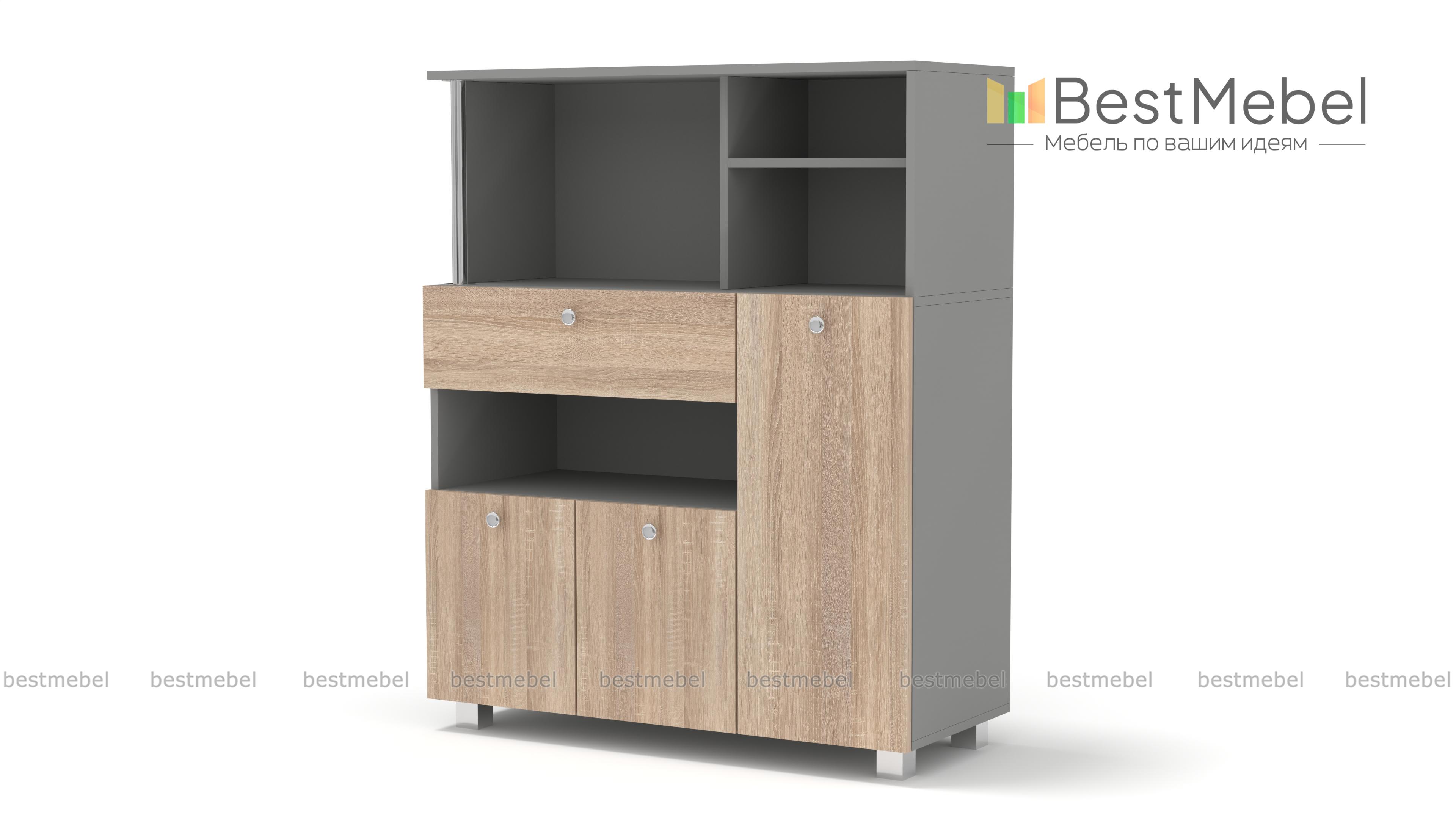 Буфет D420 BMS – компактная модель, которая станет гармоничным дополнением современного кухонного гарнитура. Особенно актуальный вид буфету придает сочетание оттенков под массив дерева, белого и элементов в цвете металлик. Продуманная конструкция с открытыми полками, выдвижным ящиком и распашными отделениями позволит разместить бытовую технику, посуду, баночки со специями и многое другое. Купить Буфет D420 BMS по отличной цене вы сможете в нашем интернет-магазине.