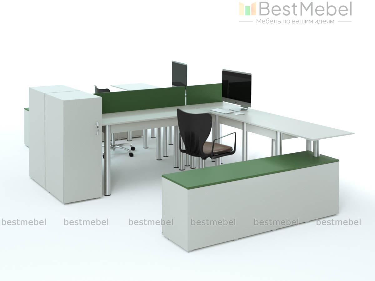 Бенч-система Тим 24 BMS отличается современным, визуально легким дизайном, не перегружая офисное пространство. Сотрудников за угловыми столами на регулируемых металлических ножках разделяет перегородка. Две высокие и две широкие низкие тумбы с распашными дверцами позволят комфортно работать с документами и оргтехникой, разместив все необходимое под рукой. Купить бенч-систему Тим 24 BMS вы сможете в нашем интернет-магазине, подобрав нужные размеры и цветовую гамму.