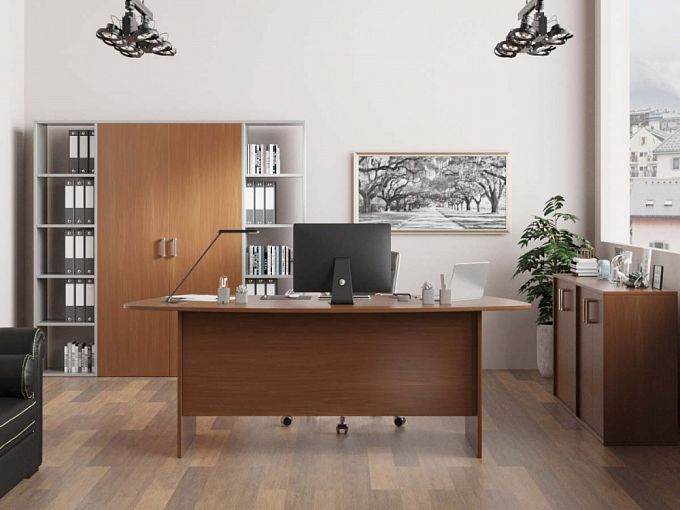 Кабинет руководителя Артос 3 BMS, выполненный в популярном сочетании белого и теплых древесных тонов, будет гармонично смотреться в интерьере современного офиса. Композиция объединила рабочий стол, распашную тумбу и шкафную группу из двух открытых стеллажей и шкафа для документов с глухим фасадом. Простота и надежность конструкции в сочетании с износостойкостью материалов станут гарантией долговечности и эстетичного вида. Купить кабинет руководителя Артос 3 BMS вы сможете в нашем интернет-магазине по доступной цене.