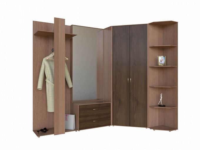 Прихожая Бекас Угловой BMS гармонично сочетает открытые и закрытые глухими фасадами модули. Двухдверный угловой шкаф, тумба с зеркалом, оснащенная полкой и штангой вешалка и скошенный торцевой стеллаж составляют современную композицию для меблировки входной зоны. Древесные тона в отделке смягчают строгую геометрию линий и создают атмосферу уюта и комфорта. Купить прихожую Бекас Угловой BMS, изготовленную по вашим размерам, приглашаем к нам в интернет-магазин.