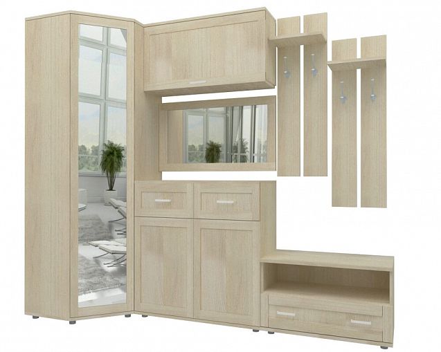 Прихожая Гаурон К № 7.1 BMS – современный модульный комплект, который не только разместит всю необходимую одежду и обувь, но и выгодно использует свободное пространство за счет угловой конструкции. Прихожая оборудована однодверным шкафом с зеркальной дверцей, комодом, навесным зеркалом, обувницей с ящиком и нишей, антресолью с откидной дверцей и двумя узкими панелями с крючками и верхними полочками. Широкие рамочные фасады и древесные оттенки придают модели основательную добротность. Купить прихожую Гаурон К № 7.1 BMS вы сможете в нашем интернет-магазине.