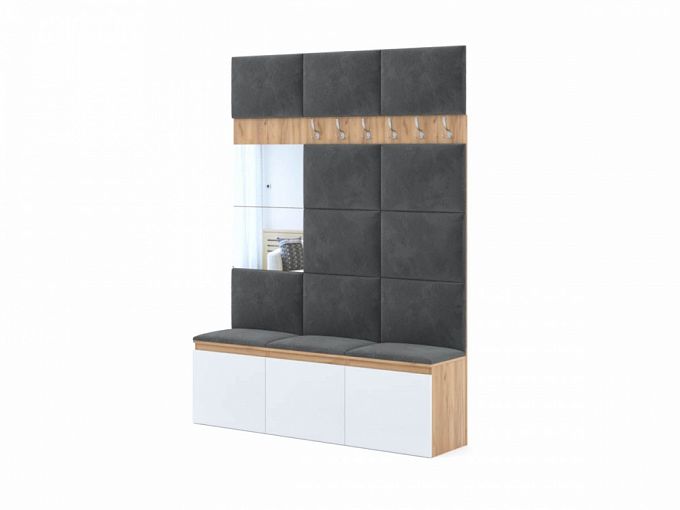 Прихожая Харлей 29 BMS может дополнить другие предметы серии или использоваться как самостоятельный предмет меблировки. Широкое панно с крючками для верхней одежды и аксессуаров и зеркальными панелями объединено с трехдверной тумбой-обувницей. Мягкая темная обивка, простроченная объемными крупными квадратами, эффектно сочетается с теплыми древесными оттенками корпуса и белым фасадом. Купить прихожую Харлей 29 BMS с учетом оптимальных габаритов вы сможете в нашем интернет-магазине.