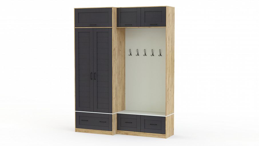 Прихожая Лазурь 11 BMS в трендовом дизайне поможет обустроить комфортную и функциональную входную зону. Центральная часть композиции с разной глубиной модулей оборудована платяным шкафом с фактурным фасадом и открытой вешалкой, а в верхней и нижней части располагаются распашные секции и выдвижной ящик. Темный фасад составляет эффектную цветовую комбинацию с древесным и светлым базовым оттенками корпуса. Купить прихожую Лазурь 11 BMS приглашаем к нам в интернет-магазин, подобрав размеры, цвет и фурнитуру.