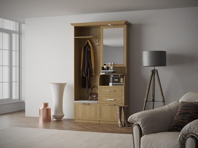 Прихожая Милан-1 BMS - это классическая элегантность и продуманный до мелочей функционал. В составе композиции для входной зоны открытая вешалка, обувница с мягким сиденьем и зеркальный шкафчик, дополненный полкой и ящиками для мелочей. Рамочные фасады и карниз с фрезеровкой создают характерный традиционный дизайн, в козырек над зеркалом встроен светильник для комфортного ухода за собой. Купить прихожую Милан-1 BMS вы сможете в нашем интернет-магазине, подобрав наиболее подходящее цветовое решение.