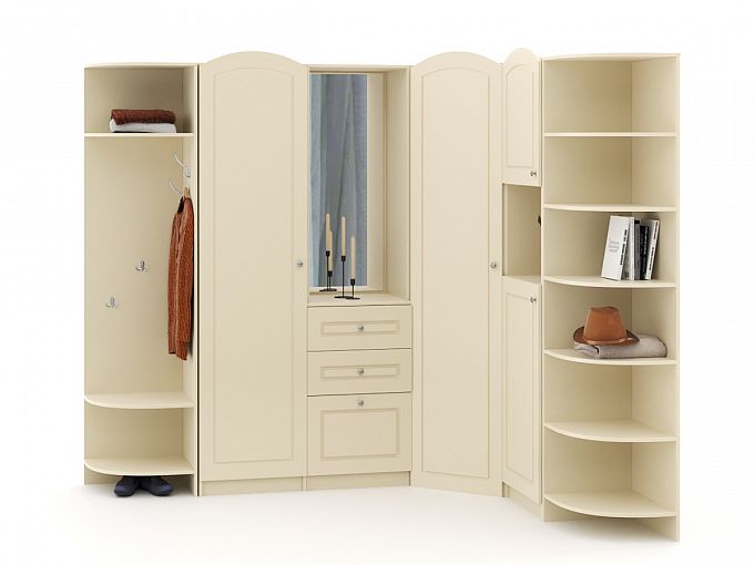 Прихожая Мишель BMS выглядит легко и изящно в классическом оформлении. Выполненные в светлых тонах фасады украшены фрезерованными рамками, распашные дверцы плавно закруглены. Угловая композиция включает в себя однодверные шкафы для одежды, шкафчик с нишей и комбинированный модуль с тумбой и зеркалом, а также радиусные торцевые секции с полками и крючками. Купить прихожую Мишель BMS с учетом оптимальных размеров вы сможете на сайте нашего интернет-магазина.