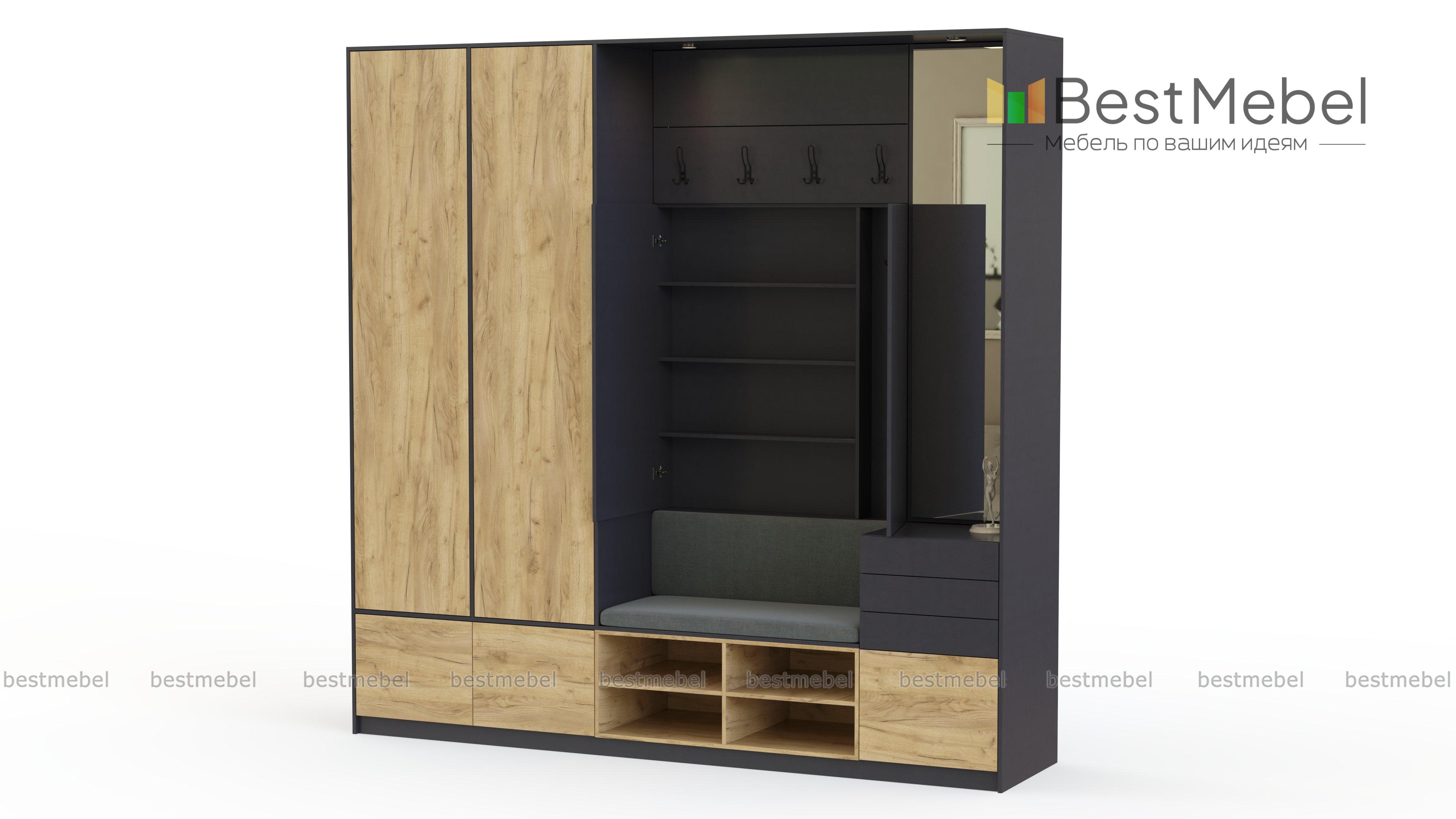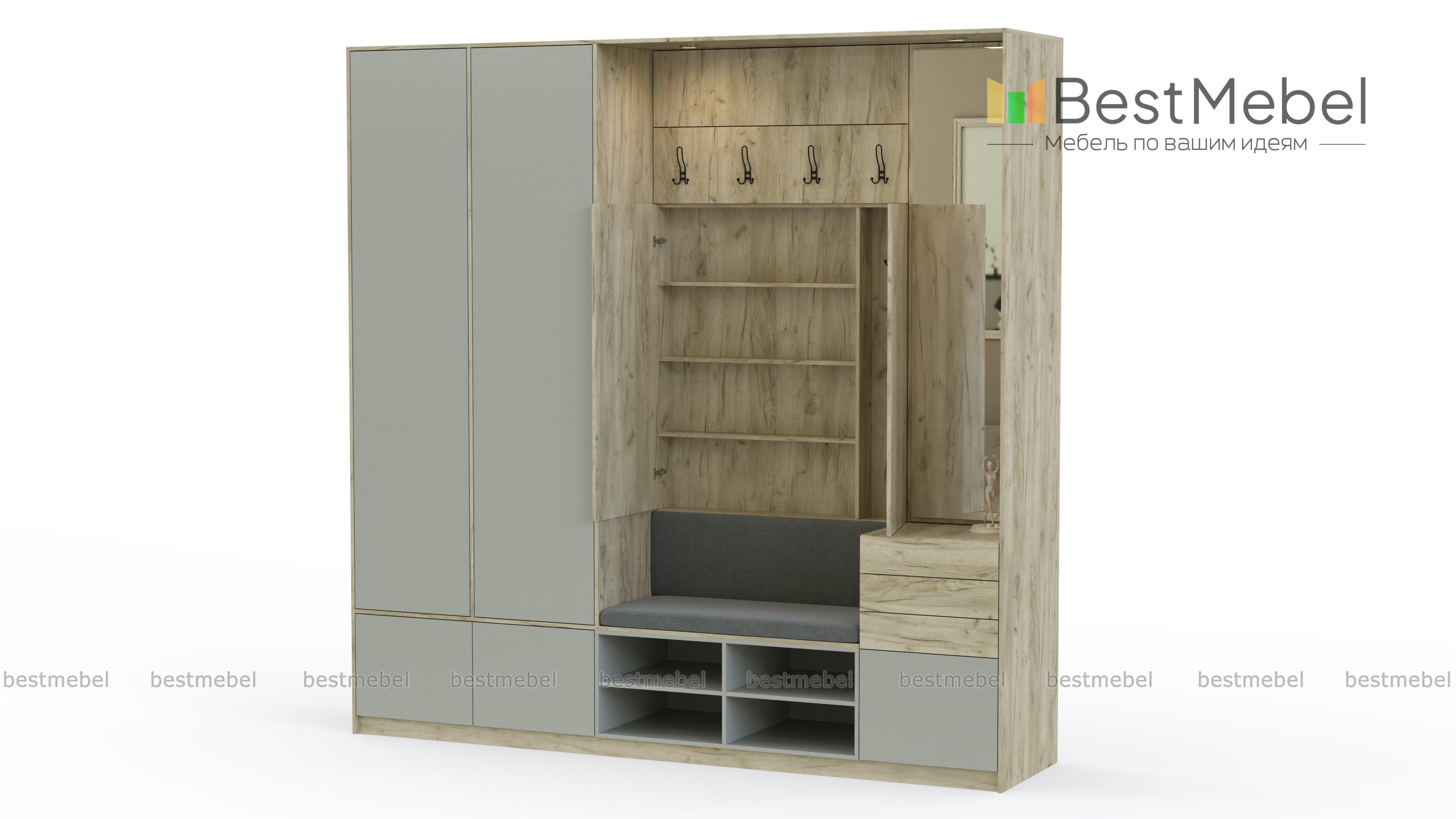 Прихожая Нелли 19 BMS - для тех, то ценит в мебели функциональность и современные лаконичные дизайны. Платяной шкаф, открытая обувница, тумба с ящиками для мелочей, зеркало и панель с крючками объединены в стильной композиции с нейтральным оформлением. Использовать пространство над сиденьем для хранения позволяет распашной шкафчик с отделением для зонтов и полками. Купить прихожую Нелли 19 BMS приглашаем в наш интернет-магазин с возможностью выбора цвета и размеров.