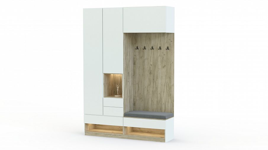 Прихожая Немезида 13 BMS эффектно сочетает геометричные формы с отделкой в крафтовых древесных тонах. В композиции для оформления входной зоны предусмотрены распашные отделения для одежды и панель с крючками, выдвижные ящики для мелочей и открытые секции под обувь и декор. Стильным штрихом в дизайне станут выделенные теплой светодиодной подсветкой ниши. Купить прихожую Немезида 13 BMS с выбором размеров и цветового решения приглашаем в наш интернет-магазин.