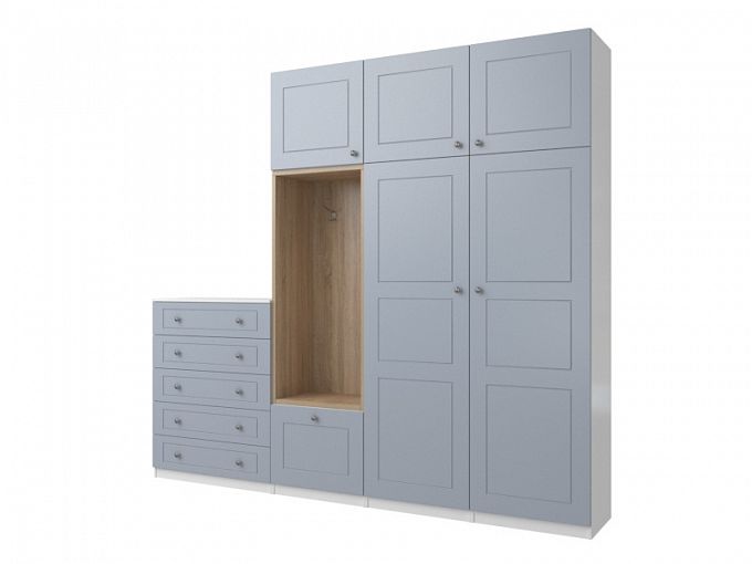 Прихожая распашная BMS – это сочетание традиционной распашной конструкции и современного дизайна. Модульный комплект включает в себя платяной шкаф с антресолью, комбинированную секцию с открытой вешалкой, обувницей и распашным отделением и вместительный комод из пяти выдвижных ящиков. Матовые фасады модной серой гаммы декорированы фрезеровкой и дополнены эффектной вставкой под древесный массив. Купить Прихожую распашную BMS для стильной и функциональной входной зоны приглашаем в наш интернет-магазин.