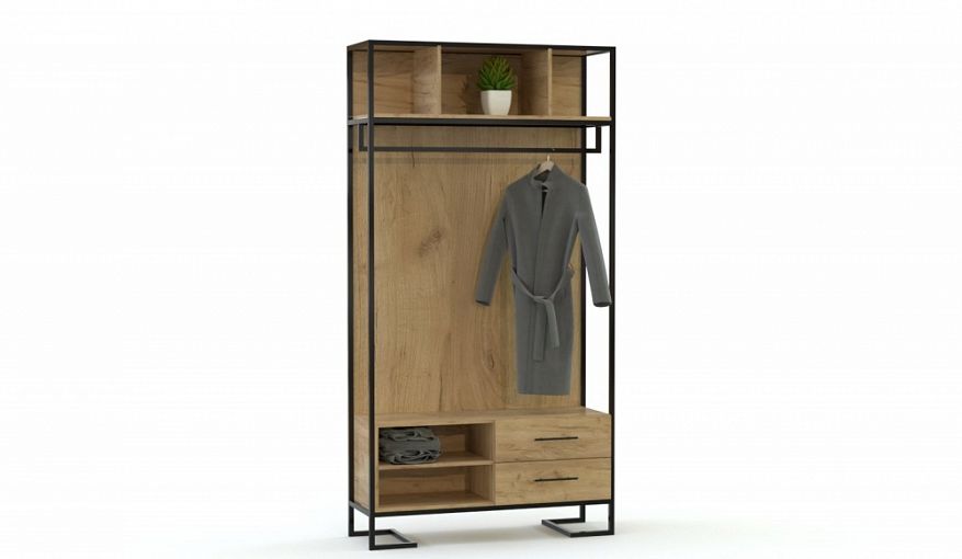 Прихожая Устина 11 BMS сочетает в себе эстетику лофта и продуманный функционал. Открытая модель выполнена из высококачественной ламинированной плиты в теплом крафтовом оттенке, а металлический каркас придает конструкции устойчивость и легкость. Для удобного хранения одежды, обуви и аксессуаров прихожая оборудована штангой, верхними полками и тумбой с двумя выдвижными ящиками и двумя открытыми секциями. Купить прихожую Устина 11 BMS вы сможете в нашем интернет-магазине с выбором цвета и размеров.
