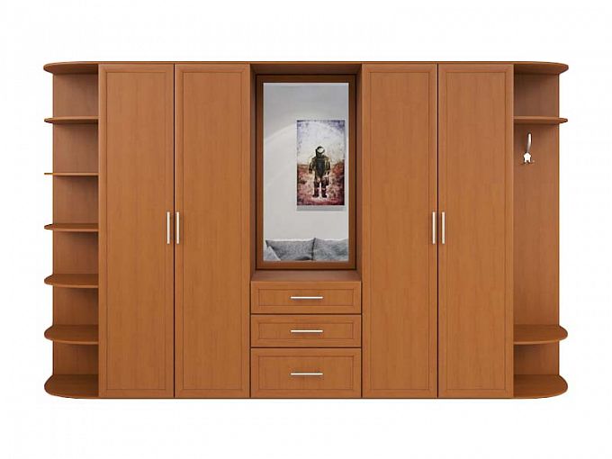 Прихожая Вера Е BMS гармонично сочетает универсальный дизайн, вместительность и демократичную цену. Композиция, выполненная в нейтральных древесных тонах, включает в себя два распашных шкафа для одежды, большое зеркало, выдвижные ящики и симметрично расположенные торцевые стеллажи с полками и крючками. Рамочные фасады лаконичны, просты в уходе и оснащены удобными ручками-рейлингами. Купить прихожую Вера Е BMS для просторного помещения в классическом стиле приглашаем в наш интернет-магазин.