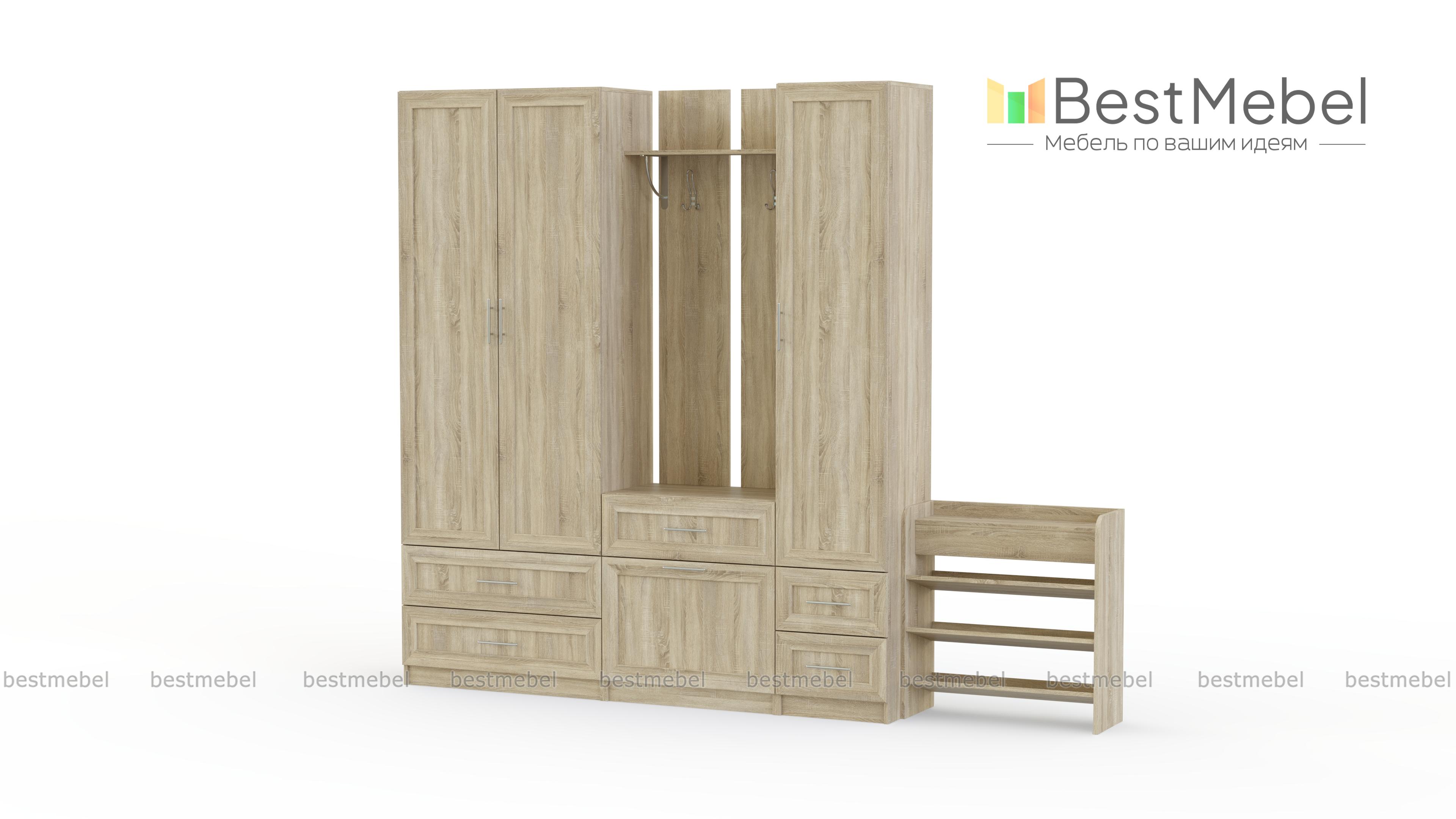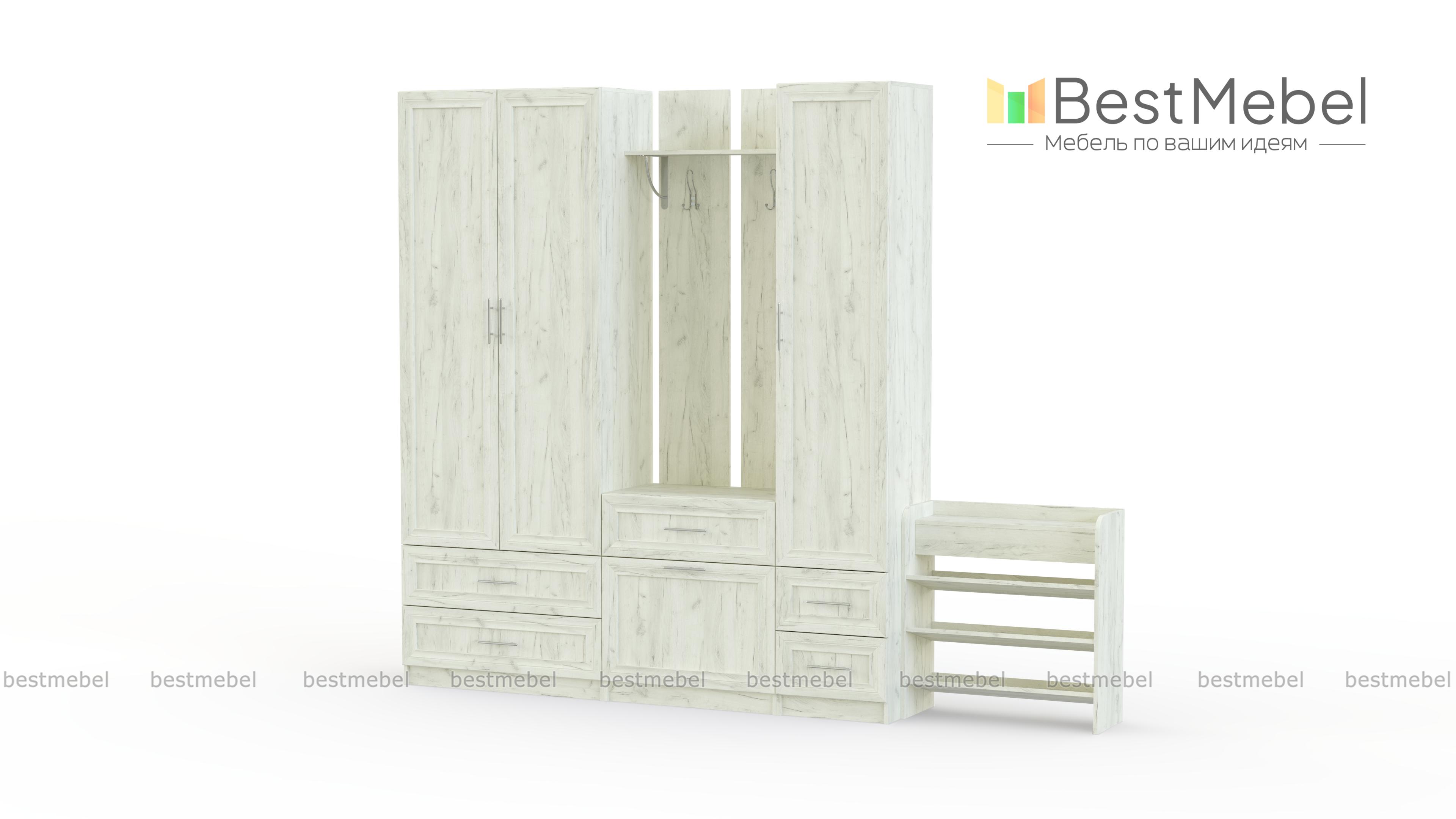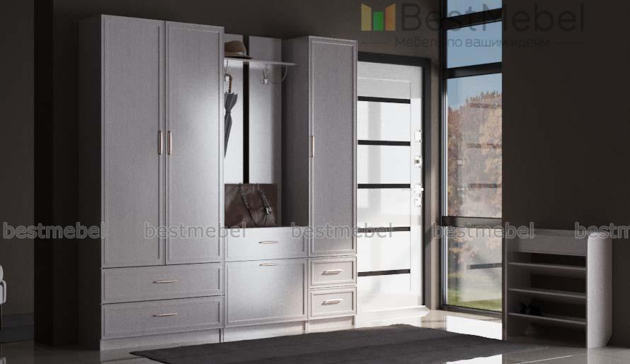 Прихожая Йорк 10 BMS – это элегантный модульный комплект, предназначенный для меблировки просторных помещений. Гармонично сочетающая классические черты и современную функциональность, прихожая поможет обустроить комфортную и эстетичную входную зону. В комплект входят платяной шкаф с выдвижными ящиками в основании, настенная вешалка с тумбой, комбинированный пенал и открытая обувница. Рамочные фасады светлых тонов декорированы ручками под серебро. Купить прихожую Йорк 10 BMS по лучшей цене приглашаем в наш интернет-магазин.