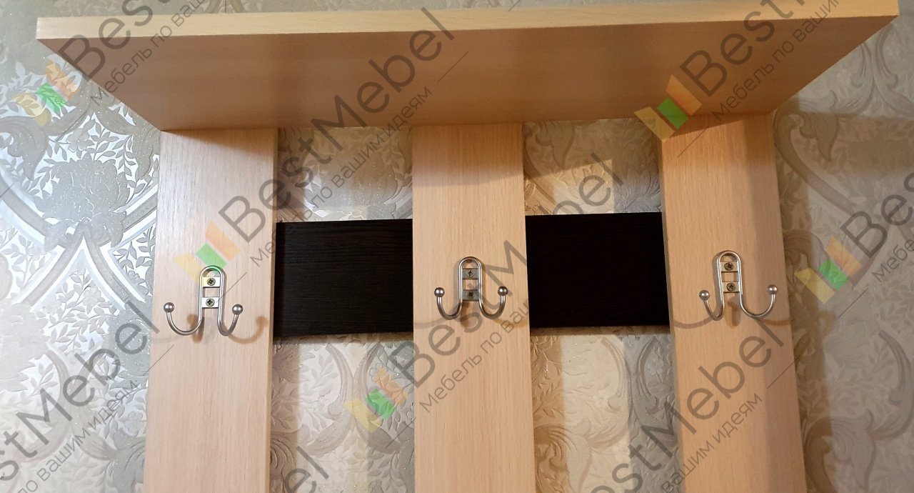 Заказ 490610.Вешалка Луи.Компактная вешалка для верхней одежды, сумок, зонтов и т.п. Контрастные цвета деталей смотрятся современно и графично.Есть полка для головных уборов. Для верхней одежды предусмотрены три двойных металлических крючка.Еще три крючка должны быть в нижней части, где проходит втора темная горизонтальная планка. Но их в комплекте не оказалось. Это минус, но нам там крючки и не нужны. Однако при получении заказа стоит обратить внимание на полную комплектность и сообщать о недостаче фурнитуры.В целом неплохая вещь для одного-двух человек либо как вспомогательная вешалка к большой прихожей. На фото видно, сколько места занимает женский зимний пуховик.Материалы качественные, кромки ровные, не крошатся. Покрытие красивое, передает текстуру древесины, без сколов и вмятин, есть приятный глянец.Химического запаха нет.