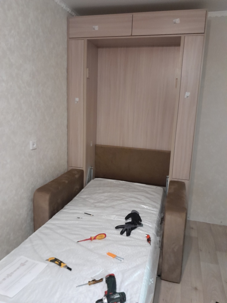 Мы не рекомендуем покупать пружинные матрасы к шкафу-кровати. Стоит отдавать предпочтение беспружинным изделиям. Это связано с тем, что поведение пружин в вертикальном положении матраса невозможно предсказать. Матрас быстро подвергается деформации и смещению слоев. Идеальным вариантом для откидной модели будет лёгкий беспружинный матрас, основу которого составляют современные материалы, не имеющие в составе пружины.