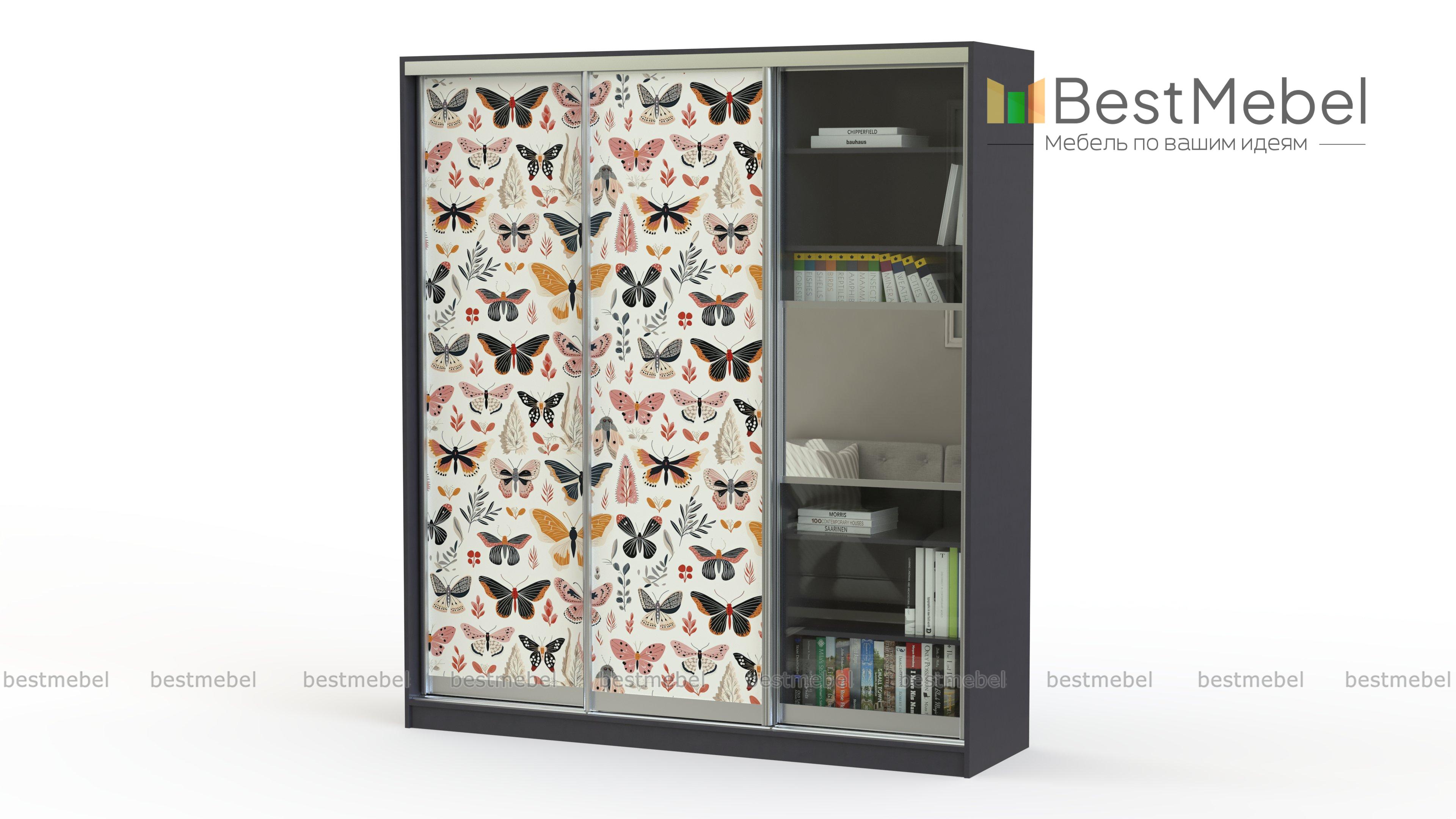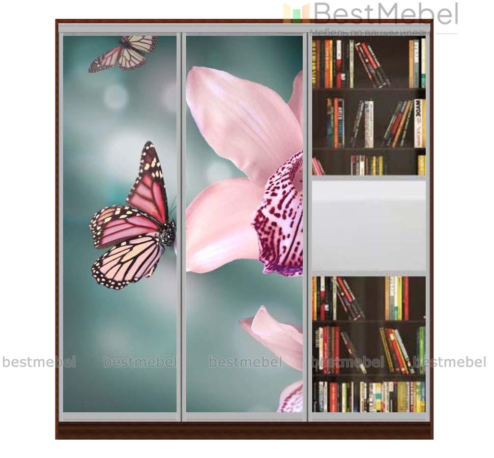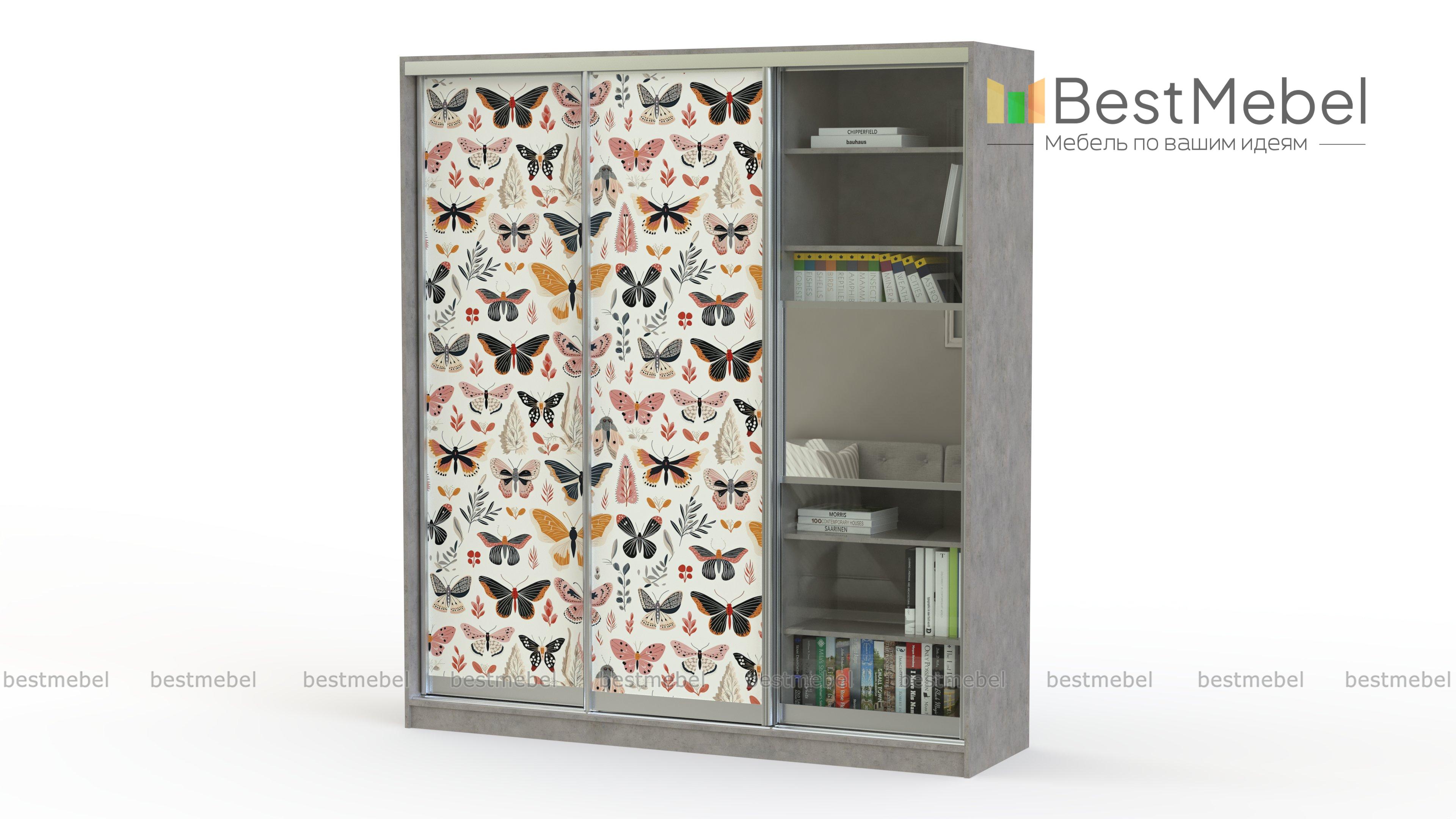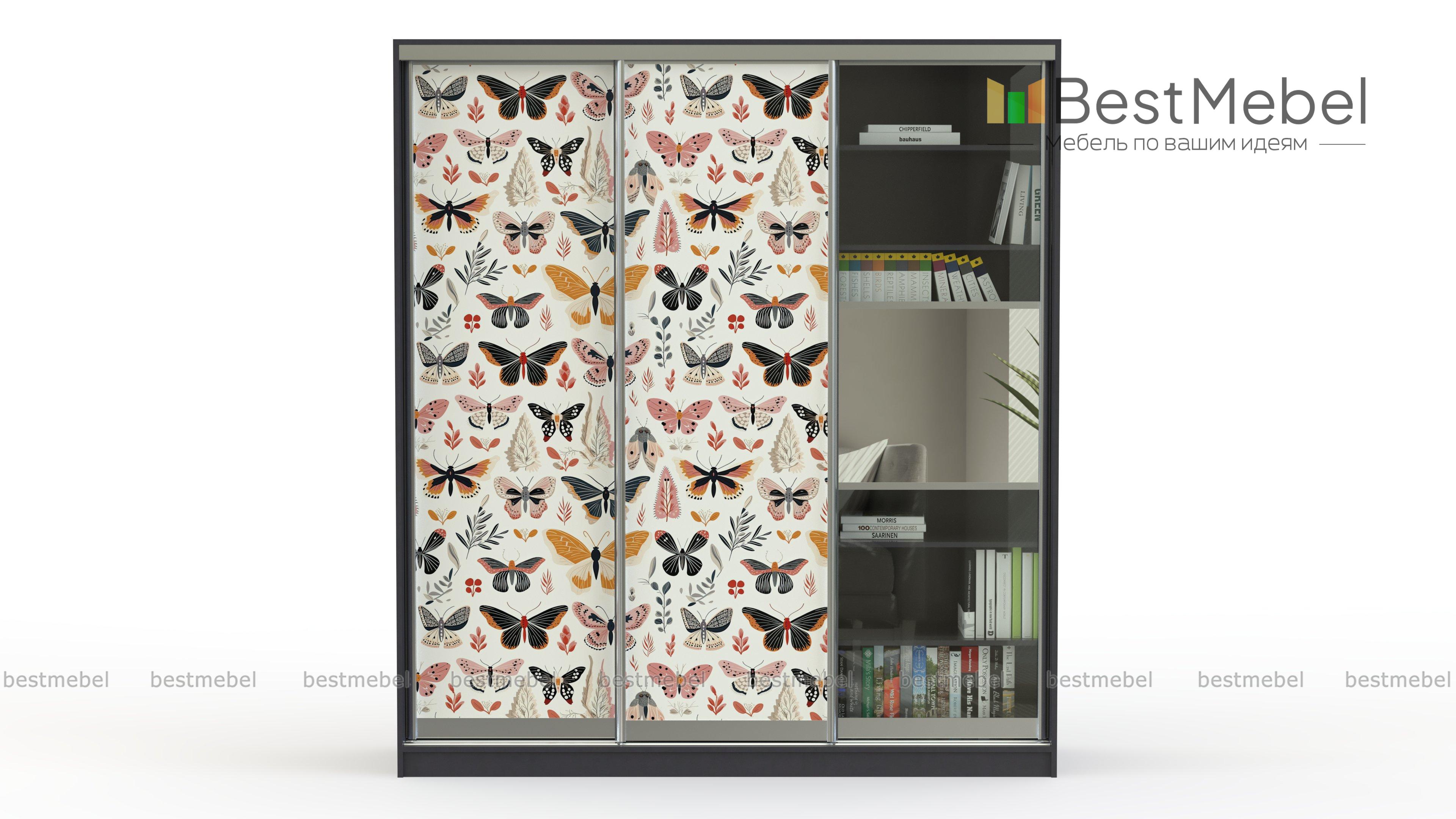 Шкаф-купе Бабочки 29 BMS с трендовым принтом и приятной бежевой палитрой поможет интересно оформить детскую, гостиную или спальню. Традиционное платяное отделение со штангой дополняет секция с книжными полками, закрытая от пыли стеклянной дверцей. Зеркальная вставка в сочетании со стеклом визуально облегчает конструкцию и создает иллюзию глубины. Купить шкаф-купе Бабочки 29 BMS, изготовленный по вашим размерам, приглашаем к нам в интернет-магазин.