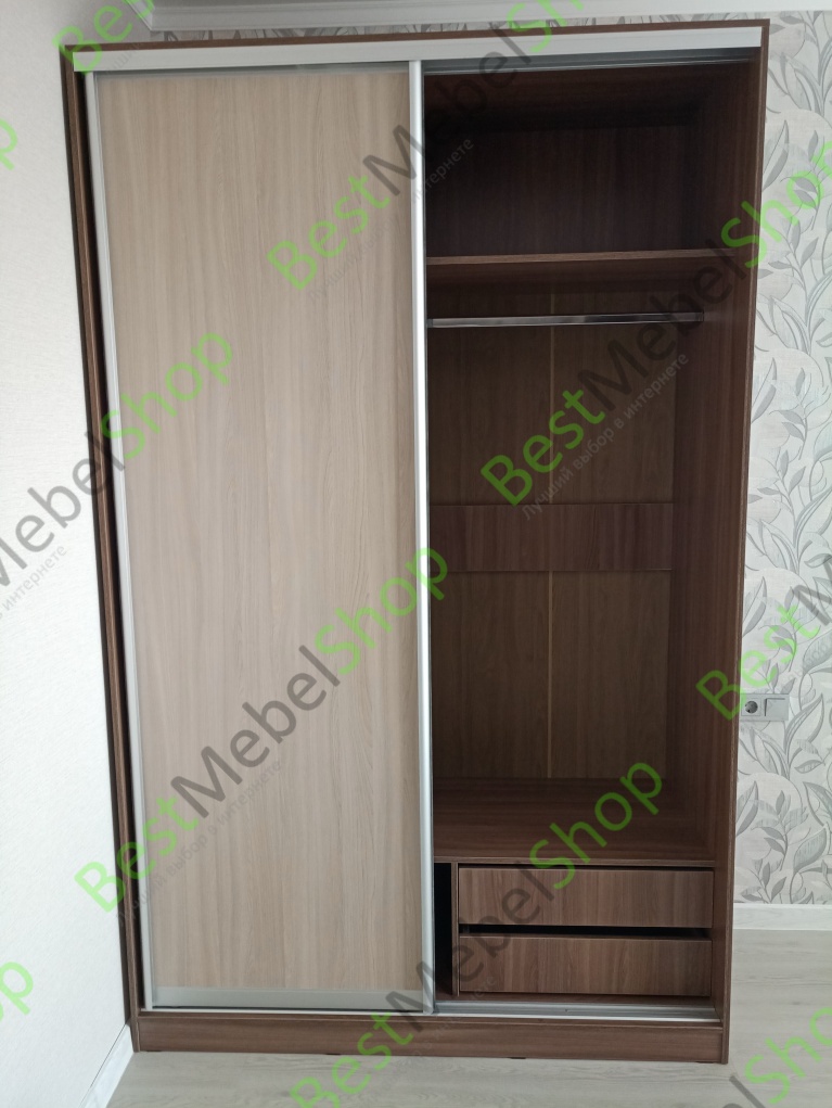 Шкаф-купе Эконом BMS - вместительный гардероб с отделением для одежды и верхней полкой. Изготовленный из ламинированной плиты высокого качества и оборудованный надежной системой направляющих, шкаф удобен в эксплуатации, нетребователен в уходе и доступен по цене. Лаконичный дизайн и контрастная древесная палитра подходят для спокойных интерьерных решений. Купить шкаф-купе Эконом BMS в прихожую или спальню вы всегда сможете на сайте нашего интернет-магазина.
