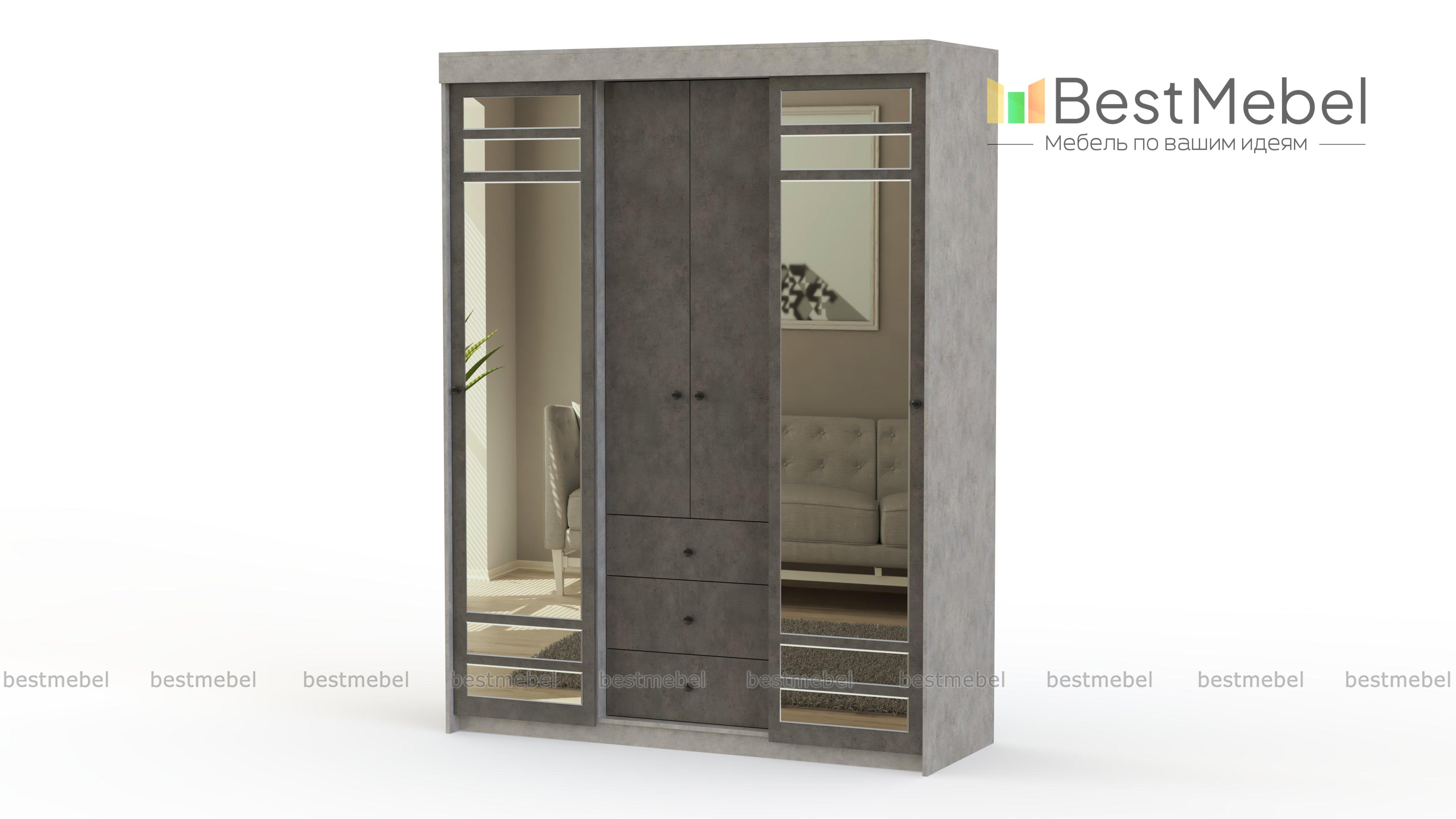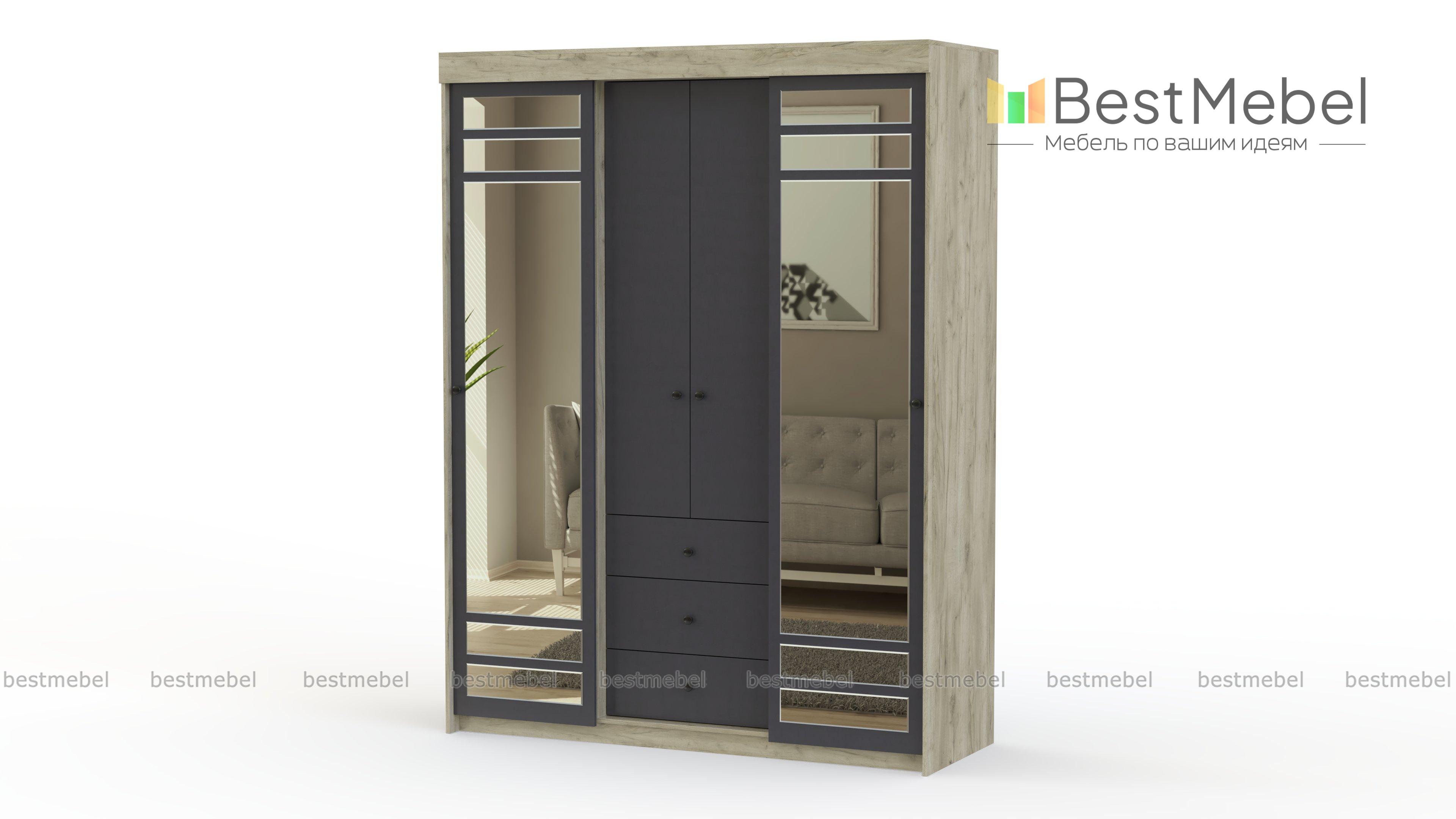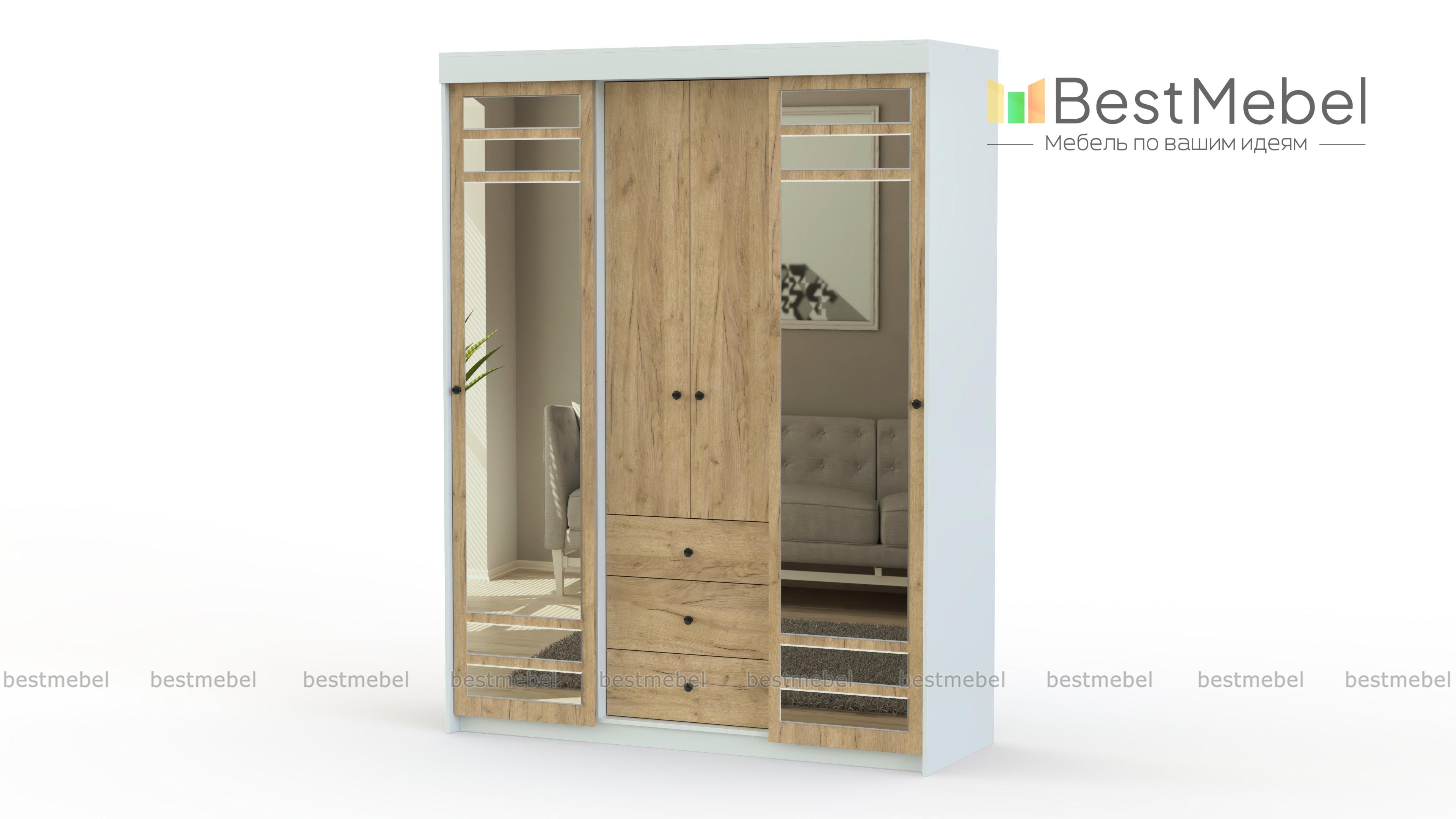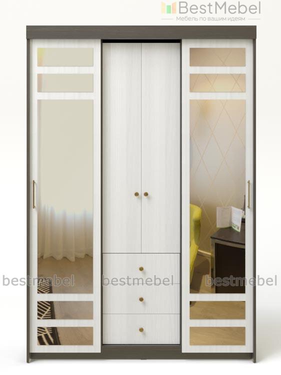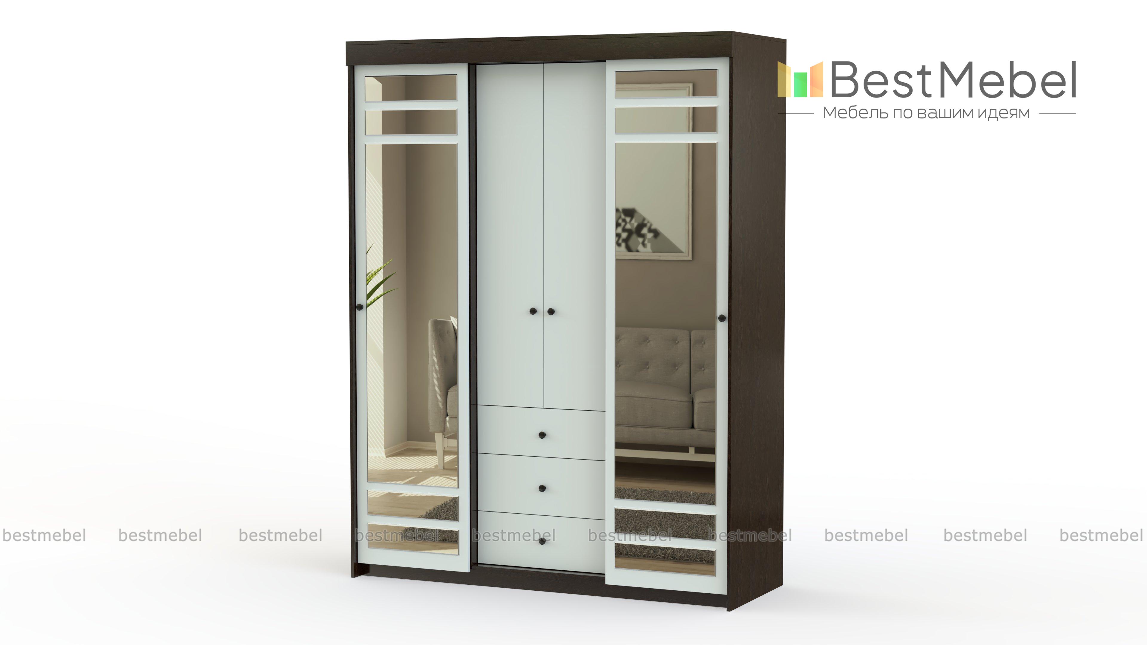 Шкаф-купе комби СВ-655 BMS выигрышно сочетает в себе разнотипные отделы для хранения разногабаритных вещей и принадлежностей. Здесь присутствуют классические распашные створки, раздвижные дверки, удобные вместительные выдвижные ящики. Вмещая в своё объёмное внутреннее пространство большое количество вещей, шкаф экономно и органично вливается в маленькое помещение. Вас не оставит равнодушными зеркальные вставки и идеально гармонирующие контрастные оттенки. Безупречной эксплуатации не помешает даже фурнитура, потому что она выполнена из проверенных временем материалов и надёжно крепится. Купить по низкой цене шкаф-купе комби СВ-655 BMS можно очень быстро в нашем магазине.