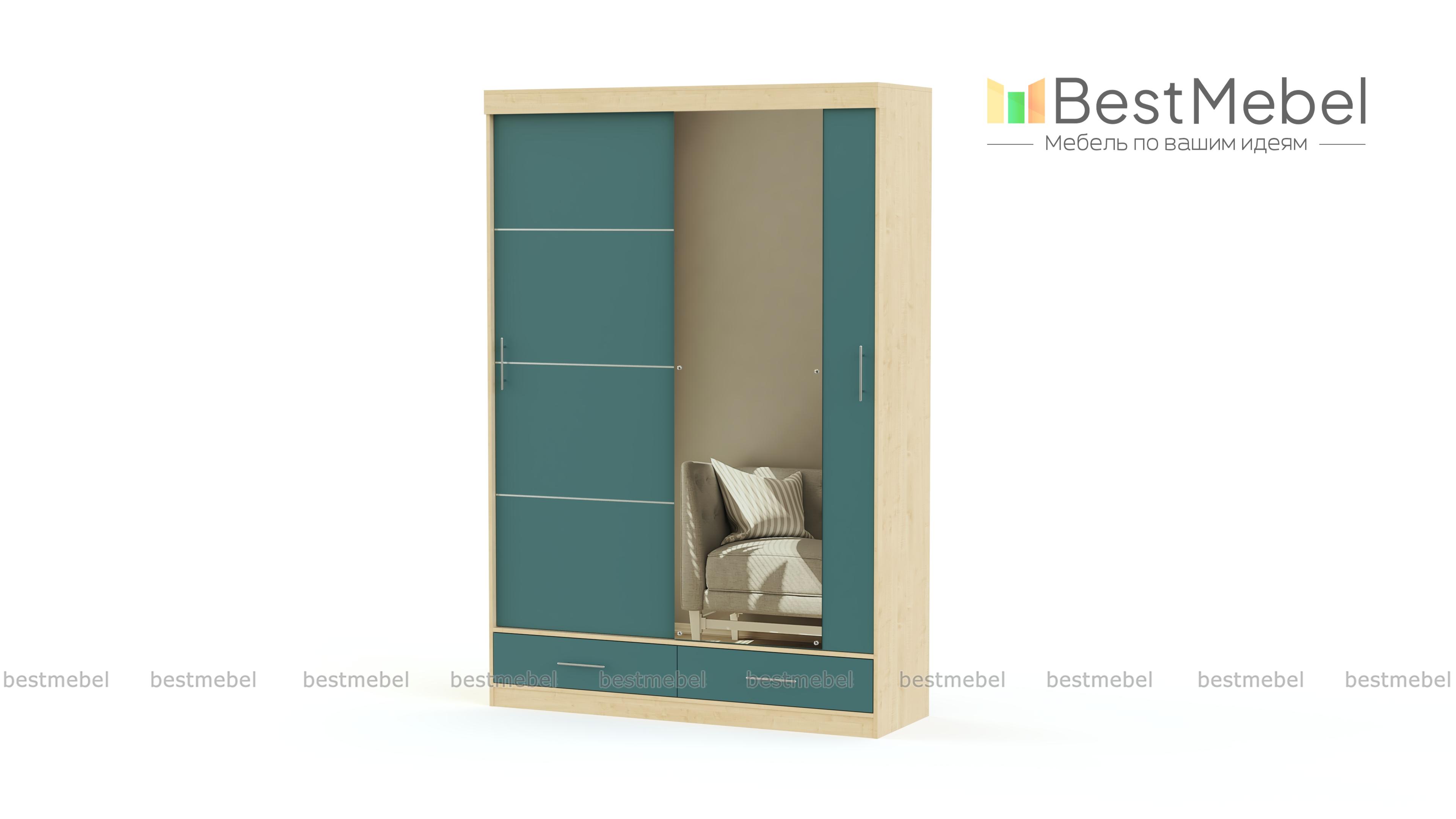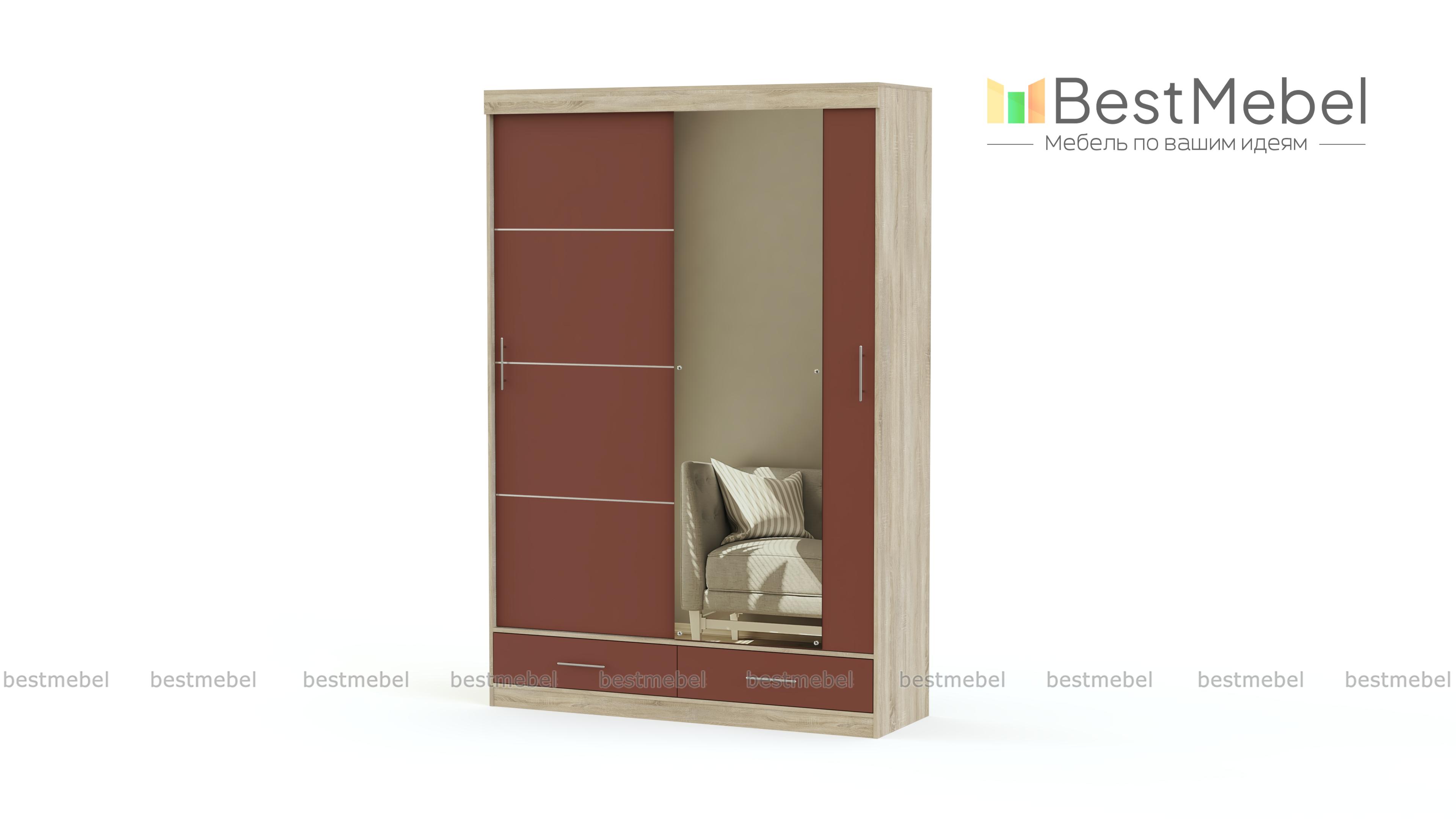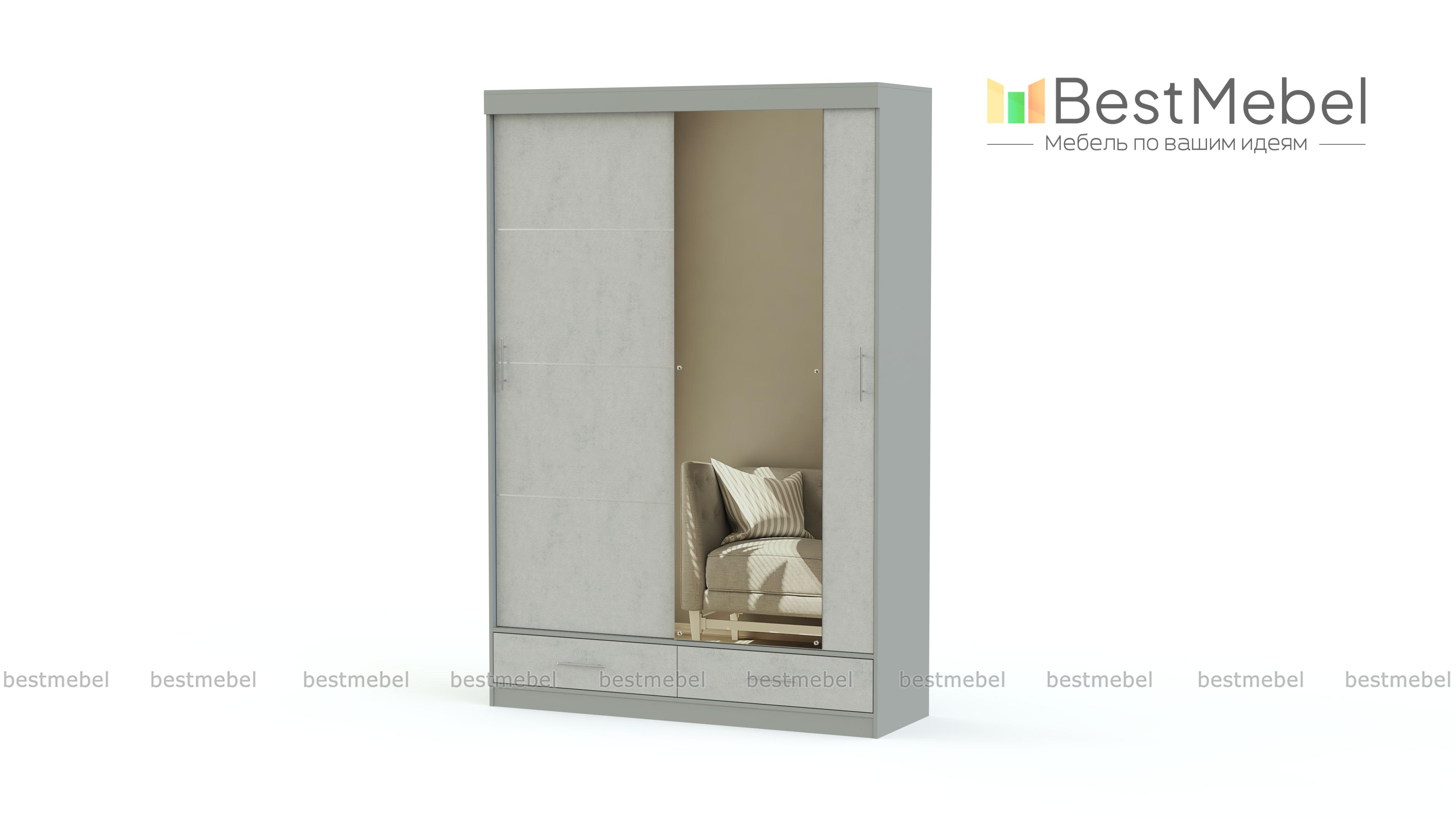 Внутреннее наполнение шкафа-купе – это 2 просторных отделения со штангами, 7 ниш для одежды разного размера и 2 вместительных выдвижных ящика. Здесь найдется место для Вашей обуви, вещей, аксессуаров, коробок и много другого. Дополнительно, шкаф может быть оснащен светодиодной подсветкой.