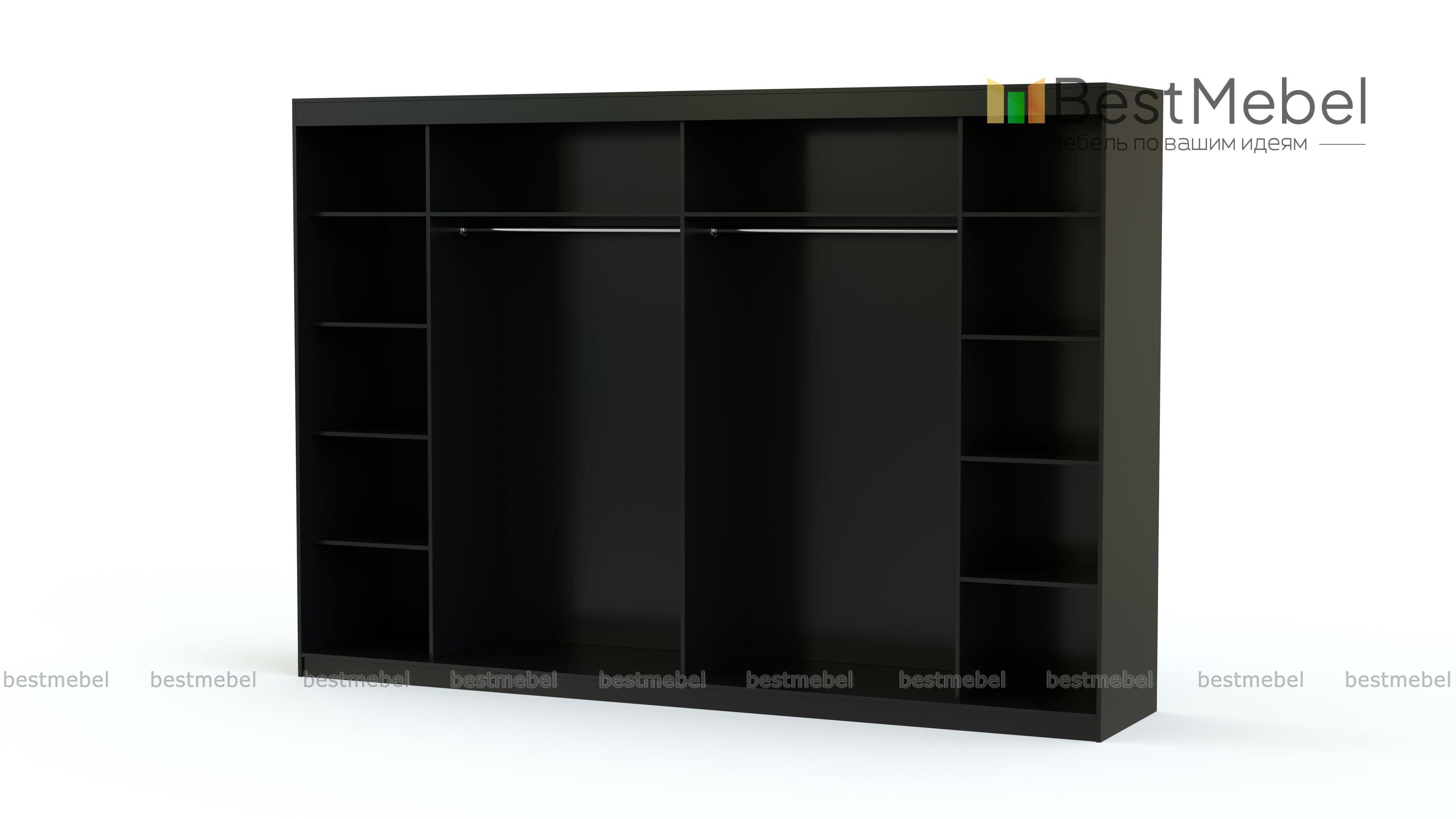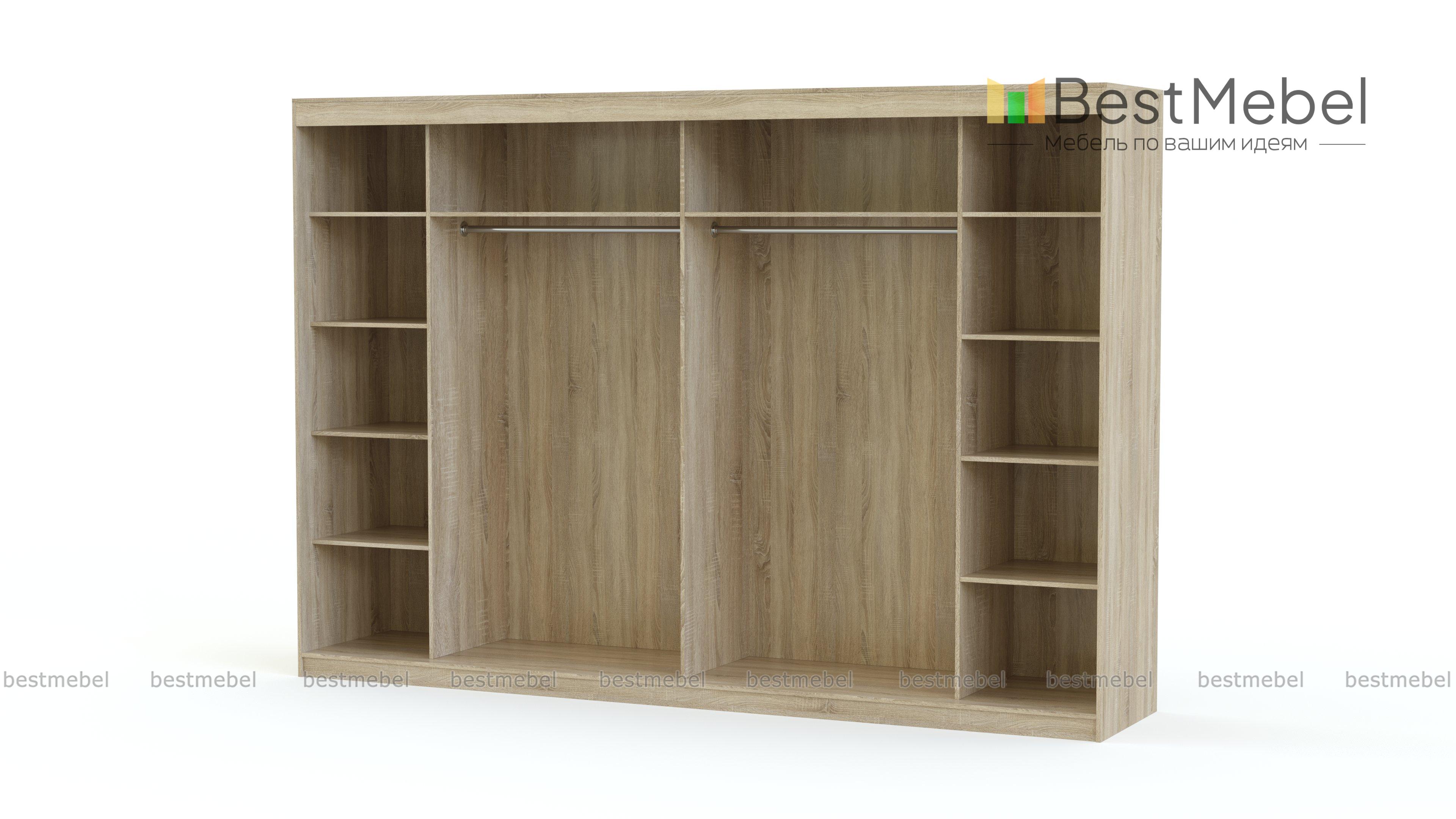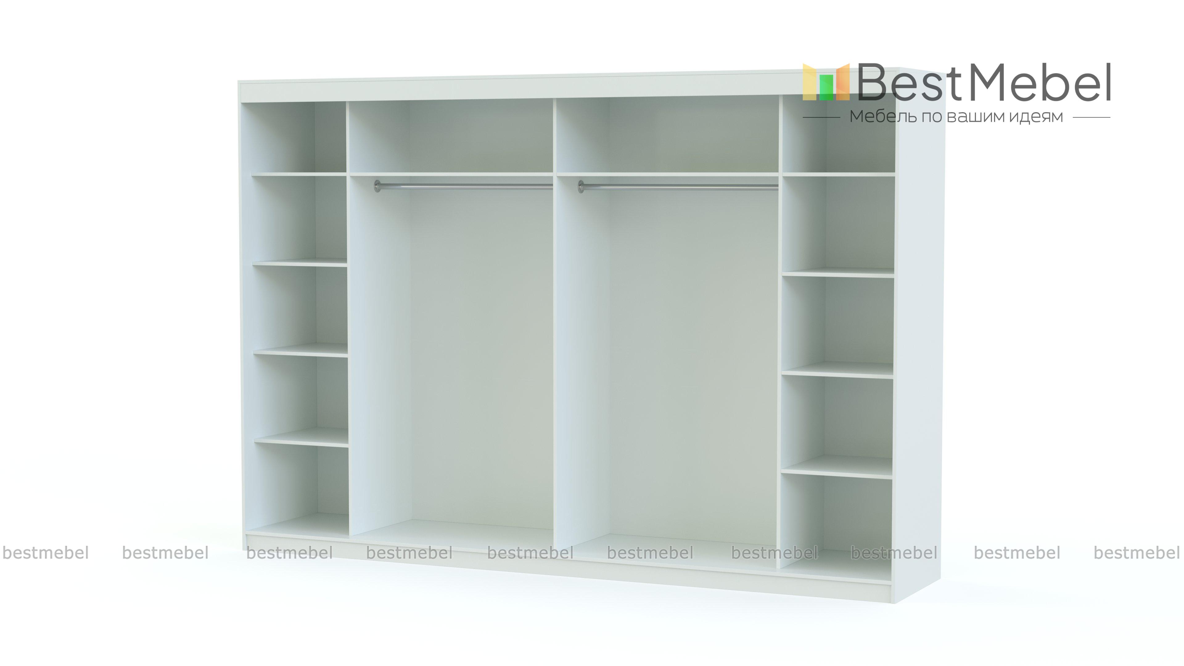Шкаф-купе Торонто 34 BMS легко вмещает весь семейный гардероб - от мелочей до объемной верхней одежды. Два центральных отделения со штангами и две боковые секции, укомплектованные полками, закрыты шестью раздвижными дверцами. Благодаря минималистичному дизайну шкаф станет базовым решением для вашей спальни или прихожей, сочетаясь с разными по стилю интерьерами. Купить шкаф-купе Торонто 34 BMS вы сможете в нашем интернет-магазине с изготовлением по индивидуальным размерам.
