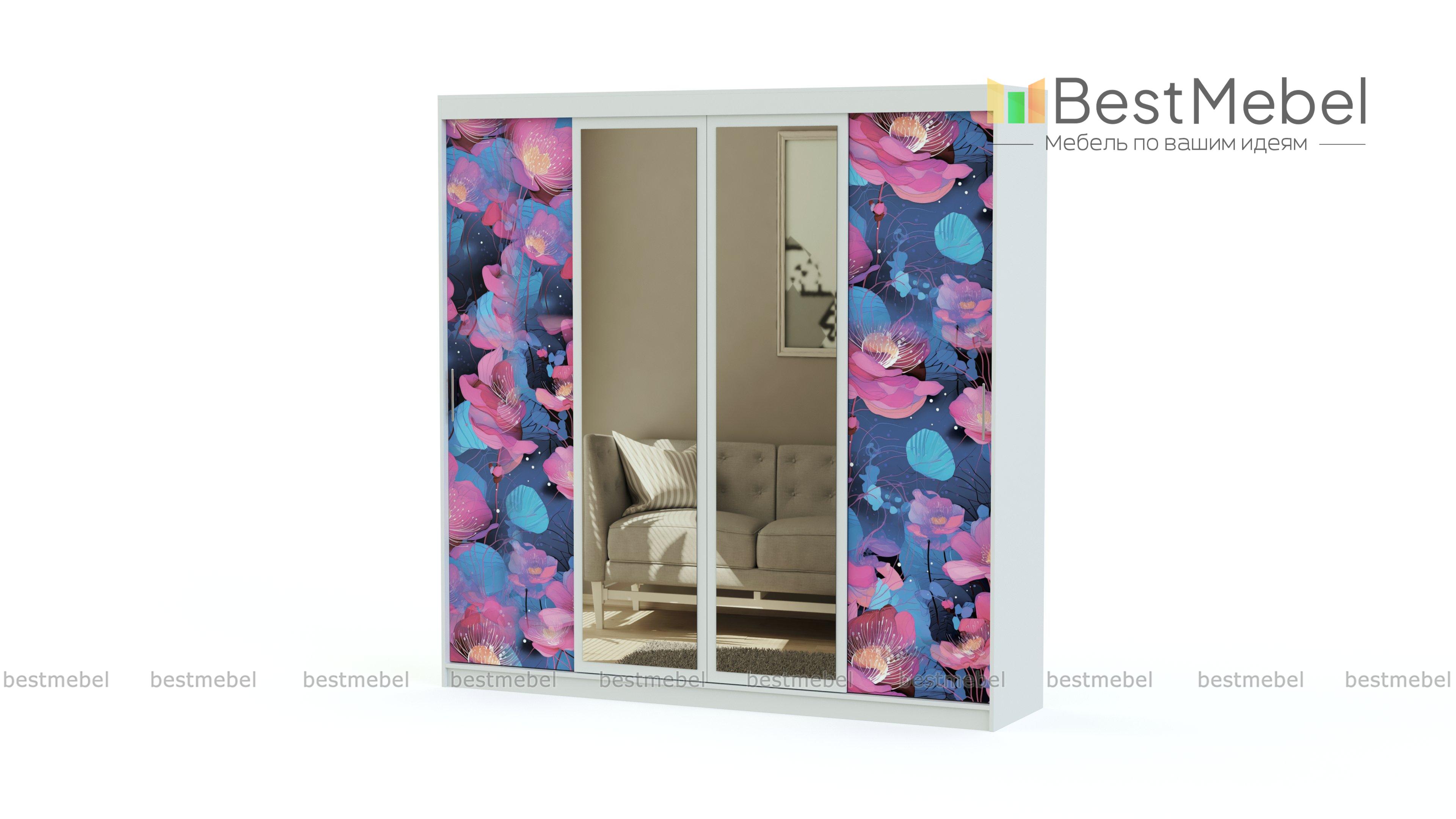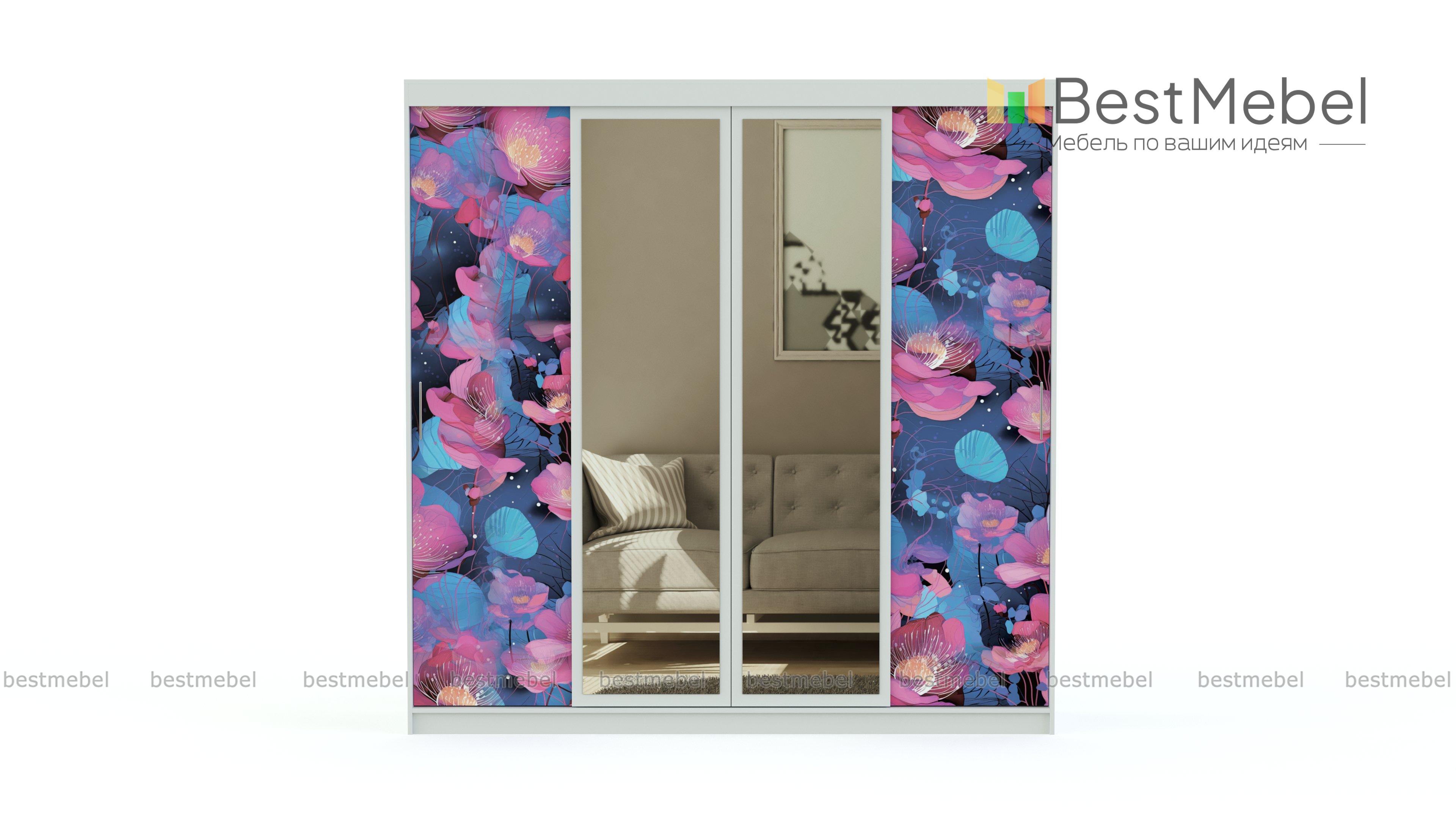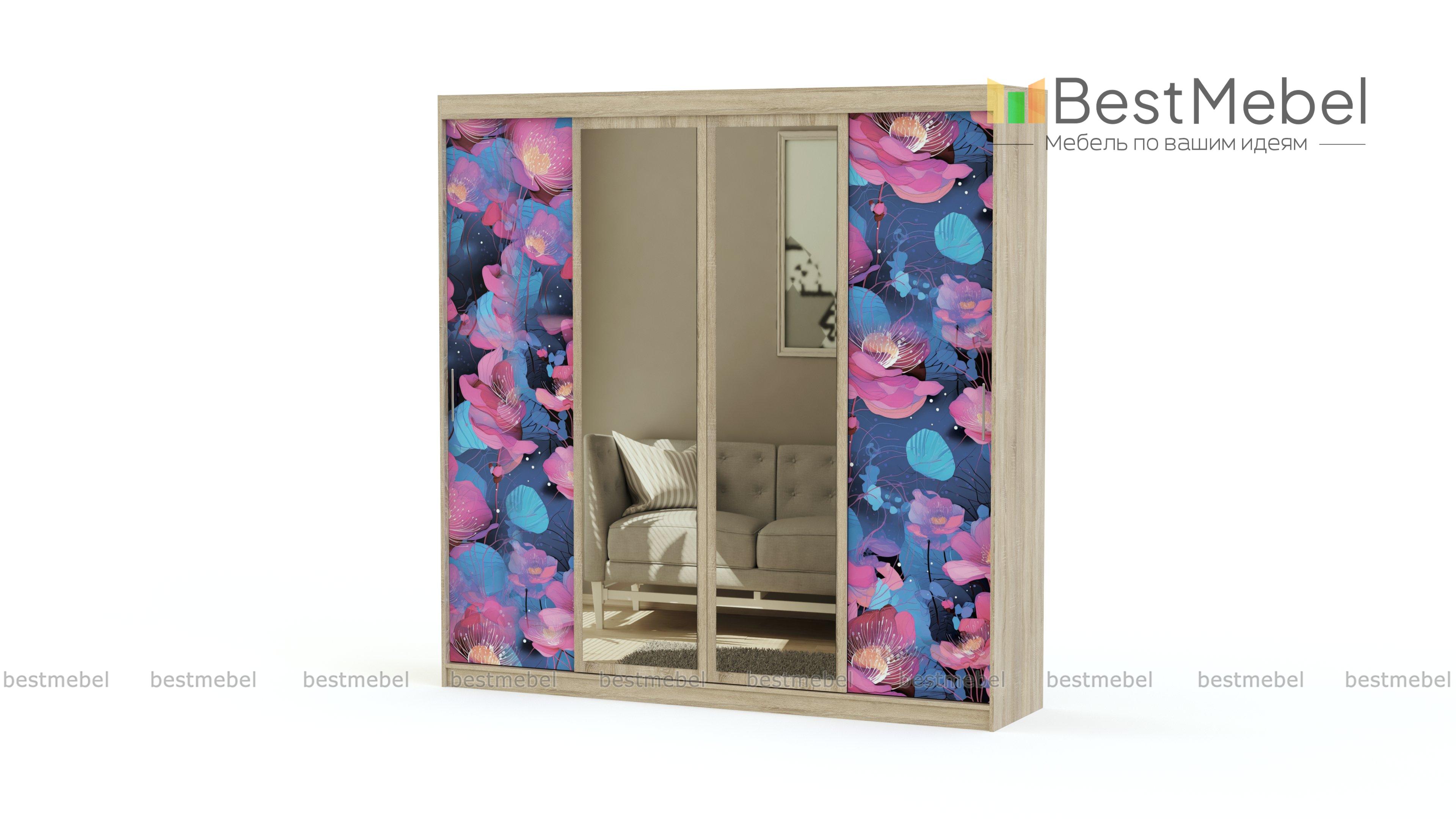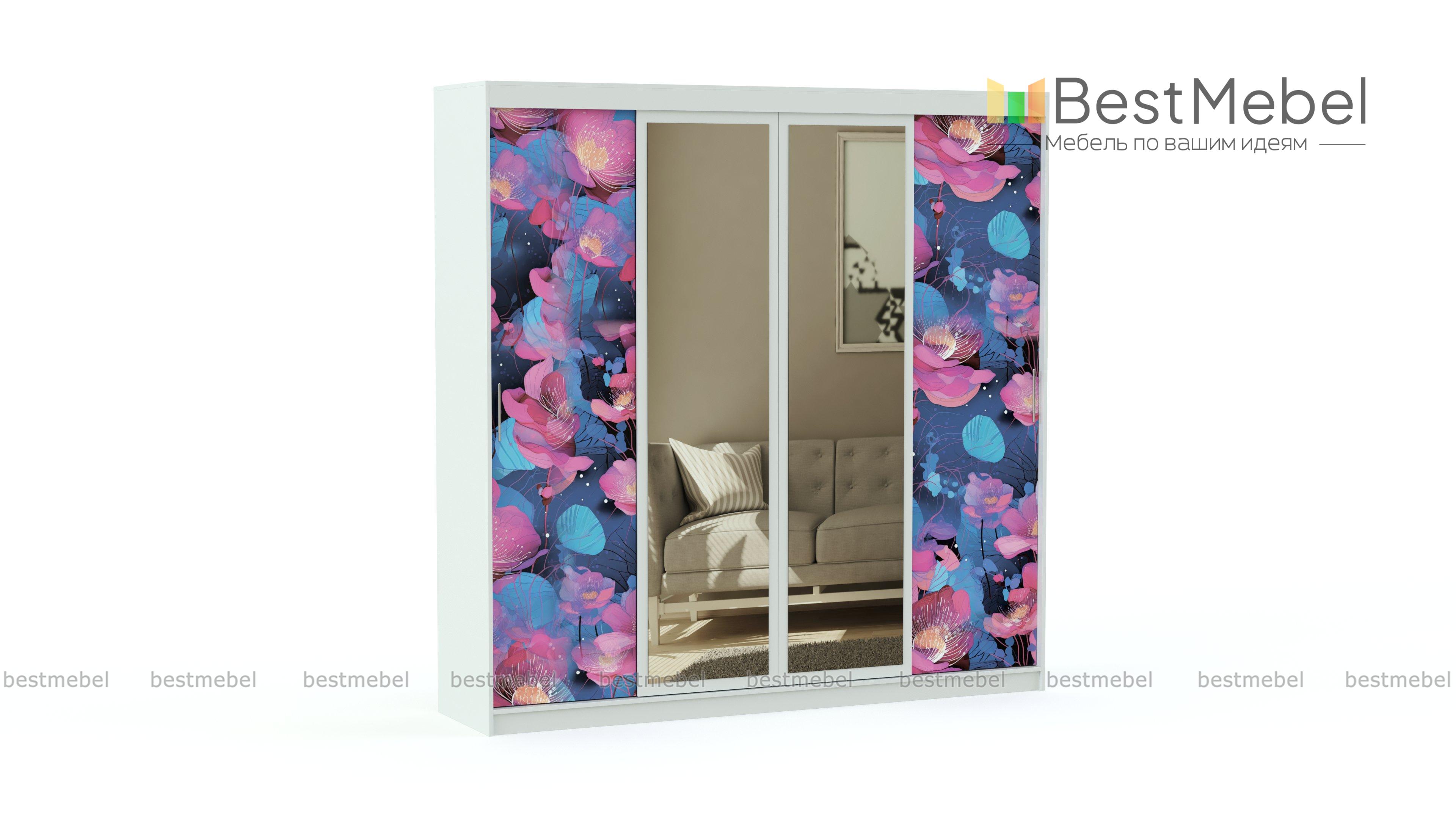 Шкаф-купе Уют 9 BMS – крупногабаритная конструкция с четырьмя раздвижными дверками. За ними можно обнаружить компоновку, состоящую из вместительных полок и штанг для вешалок. По центру располагаются зеркала. Они красиво смотрятся и украшают интерьер. Фасады, украшенные фотопечатью, подходят для декора современной комнаты. Купить шкаф-купе Уют 9 BMS можно на нашем сайте по низкой цене.
