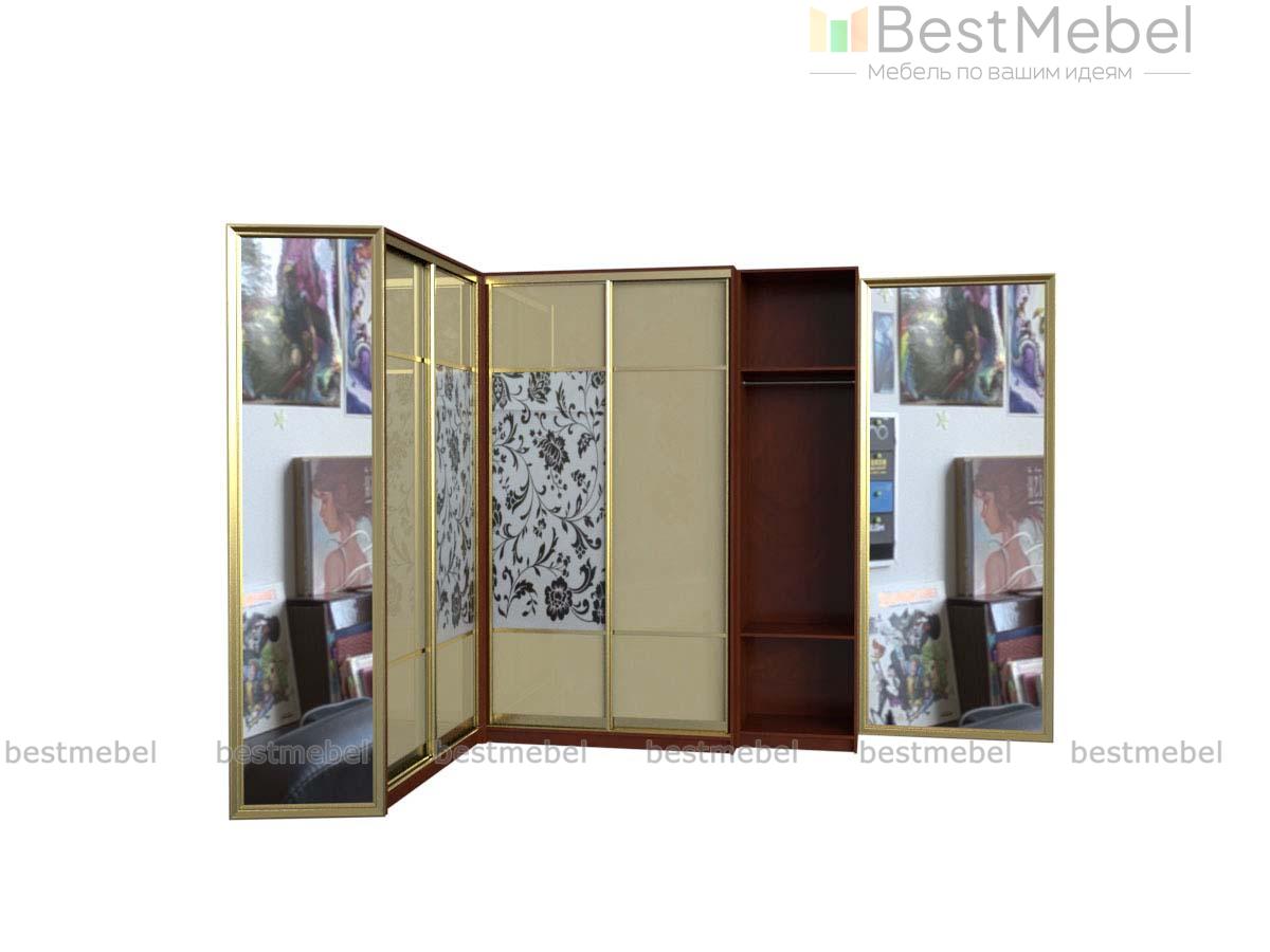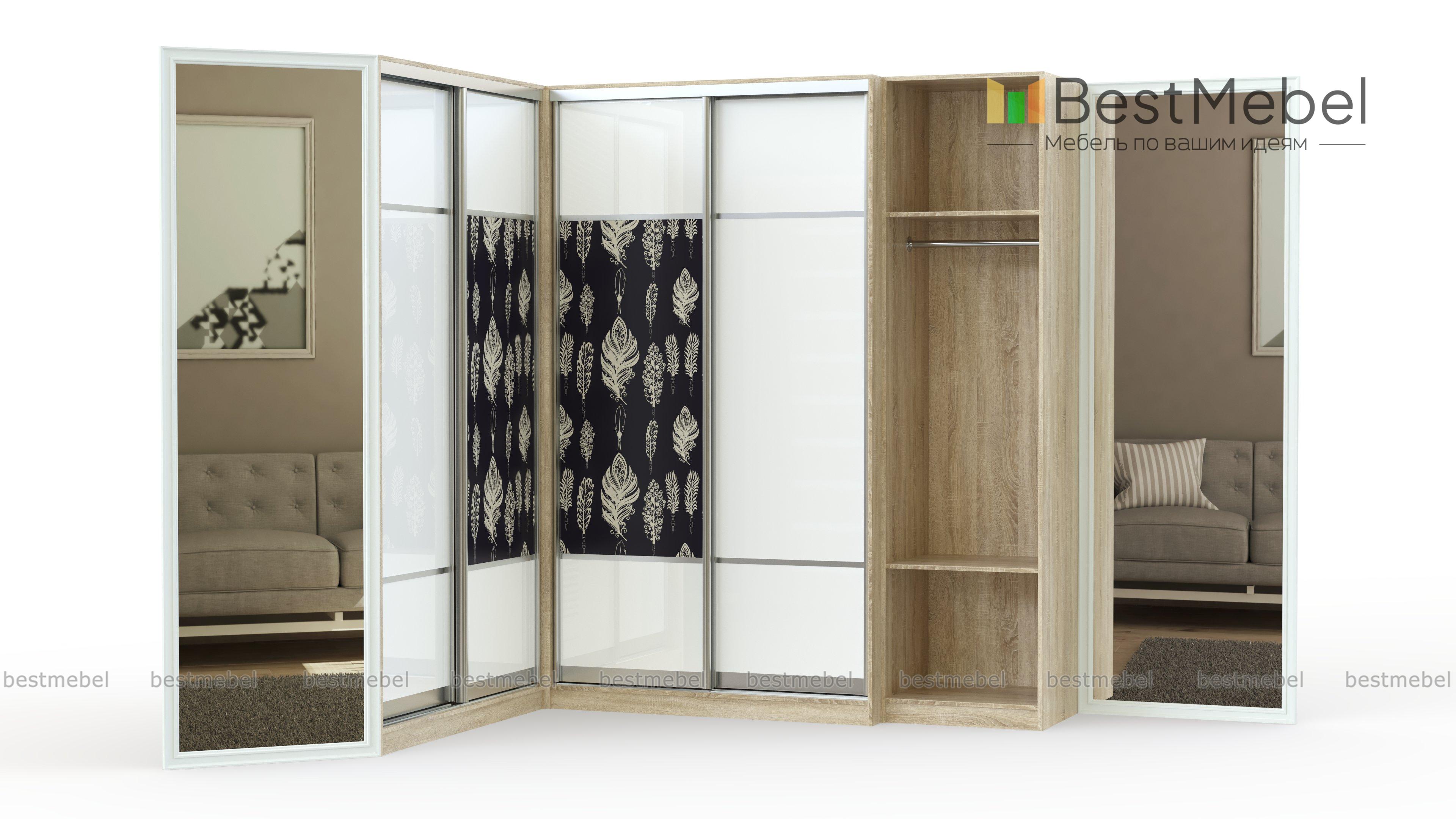 Угловой шкаф-купе Энрико BMS удовлетворяет разные потребности в хранении. Многофункциональная композиция объединила два платяных двухдверных шкафа с глухими фасадами, открытый модуль, оснащенный полками и штангой, и два ростовых зеркала. Поверхности с древесным рисунком эффектно сочетаются с глянцем, трендовой фотопечатью и зеркалами, создавая актуальный и визуально легкий дизайн. Купить угловой шкаф-купе Энрико BMS для меблировки спальни или прихожей вы сможете на сайте нашего интернет-магазина.