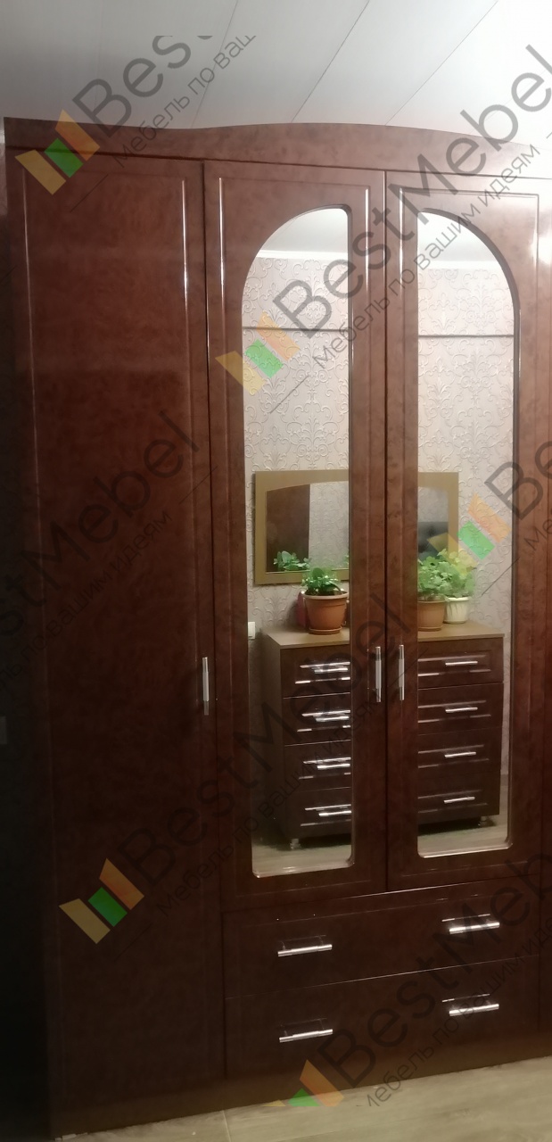 Распашной шкаф Марьяна BMS – это вместительная модель в классическом стиле, которая станет прекрасным выбором для просторной спальни. Украшенный фигурным карнизом и фрезеровкой, шкаф выполнен в насыщенных древесных тонах и дополнен образующими элегантную арку зеркалами. Четырехдверная модель оборудована распашными отделениями с бельевыми полками и штангой, а также двумя выдвижными ящиками в основании. Купить распашной шкаф Марьяна BMS вы сможете в нашем интернет-магазине, подобрав необходимые параметры.