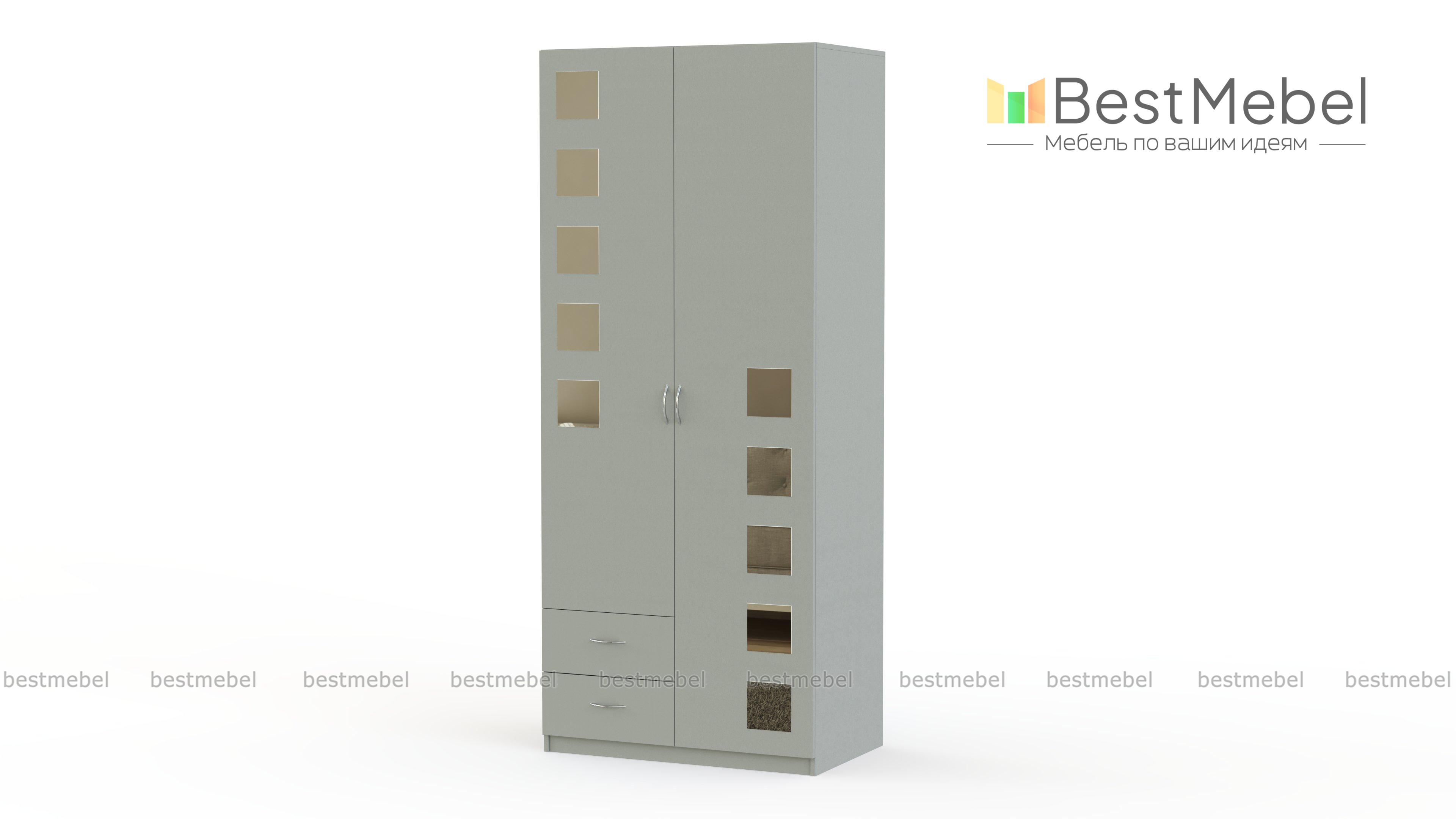 Распашной шкаф Паулина 29 BMS компактен, но вместителен за счет высоты и станет отличным выбором для меблировки небольших помещений. Двухдверная модель с просторным платяным отделением дополнена парой выдвижных ящичков для хранения мелочей в нижней части. Шкаф выполняется в светлых оттенках на выбор и декорирован по фасаду квадратными зеркальными накладками. Купить распашной шкаф Паулина 29 BMS по доступной цене вы всегда сможете в нашем интернет-магазине.