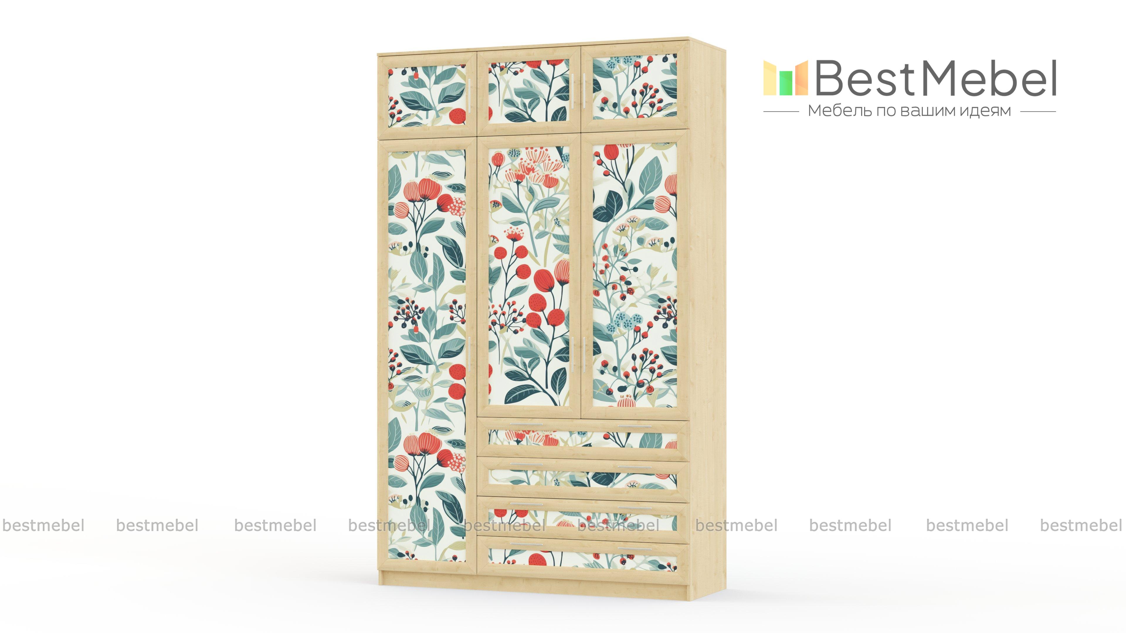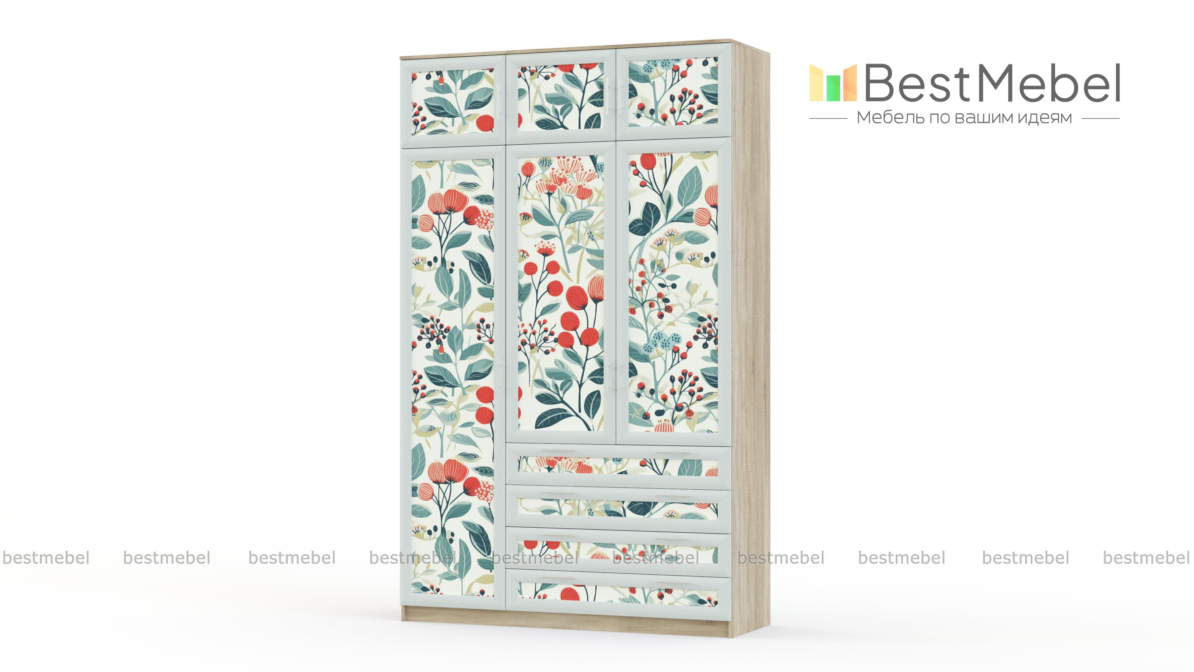 Шкаф Комфорт Люкс 3-4 BMS с модным принтом на фасаде придаст индивидуальный характер интерьеру. Рамки нежного оттенка в тон корпусу гармонируют с фотопечатью и лаконичной стильной фурнитурой. Максимально использовать пространство для хранения помогут распашные отделения с полками и штангой, четыре вместительных выдвижных ящика и антресоль. Купить шкаф Комфорт Люкс 3-4 BMS вы сможете в нашем интернет-магазине, подобрав размеры и наиболее подходящее цветовое решение.
