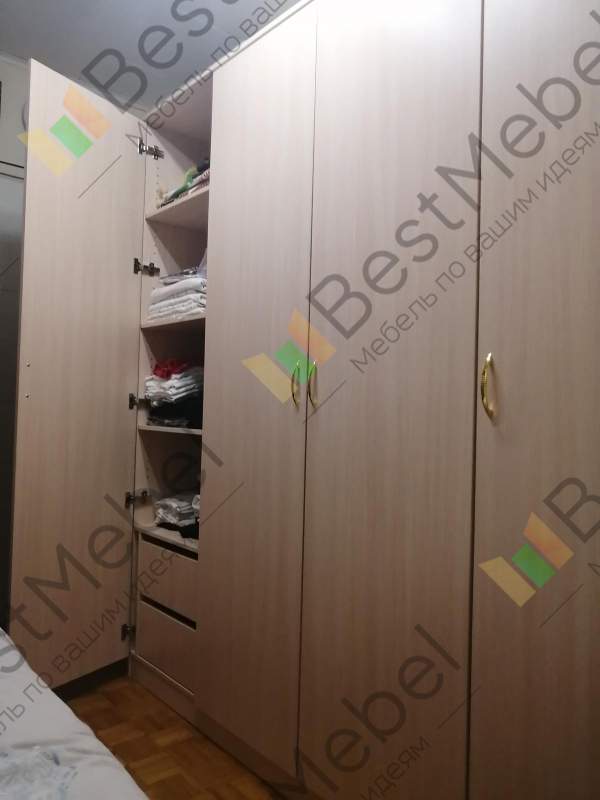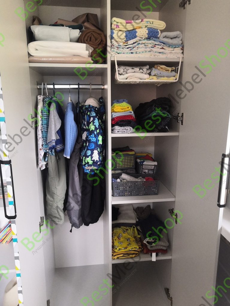 Шкаф понравился. При его изготовлении были учтены все мои пожелания. Ручки заказывала отдельно. Центральную дверь задекорировала плёнкой. Шкаф планируется для ребёнка. Вместительный, удобный