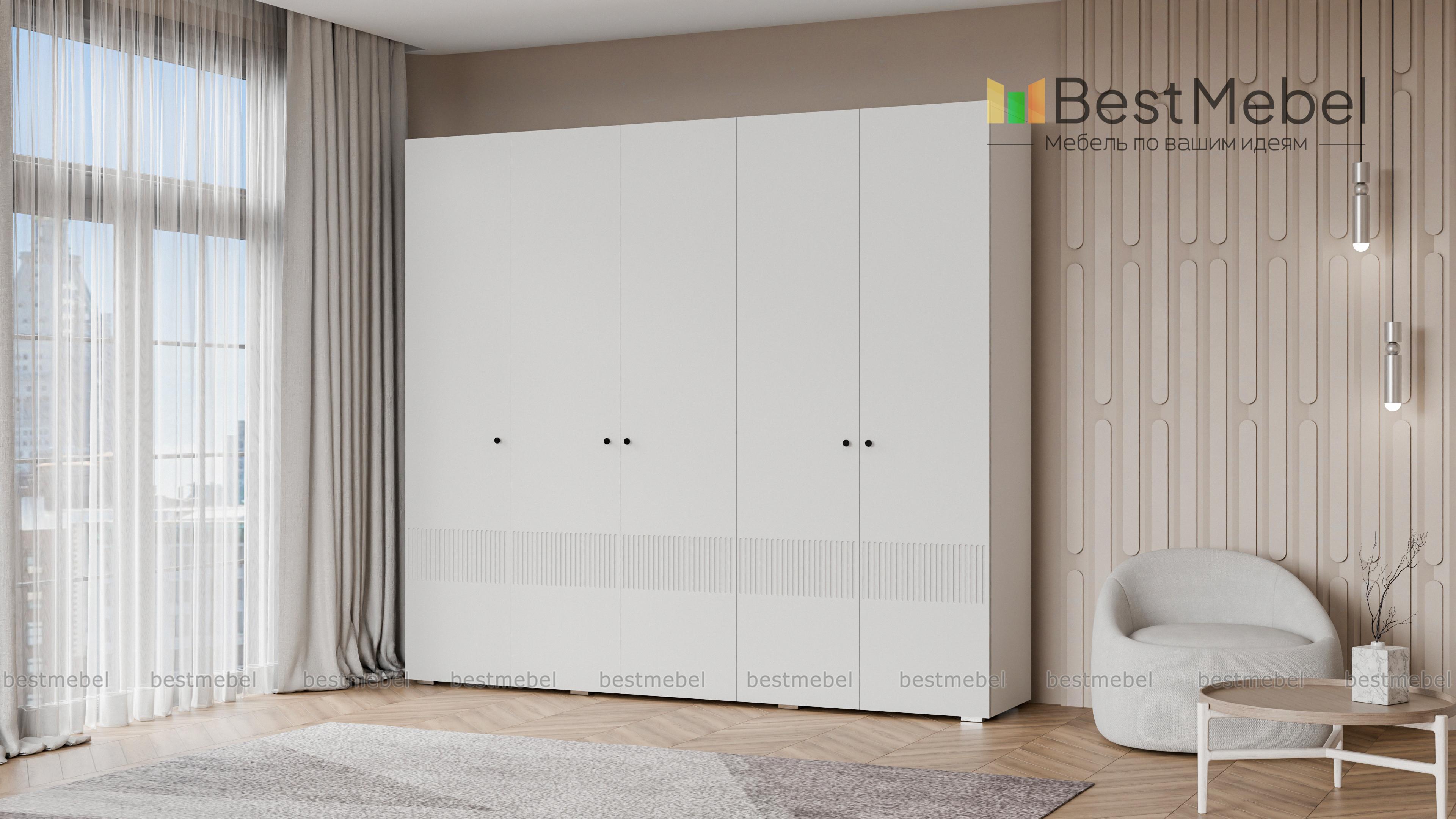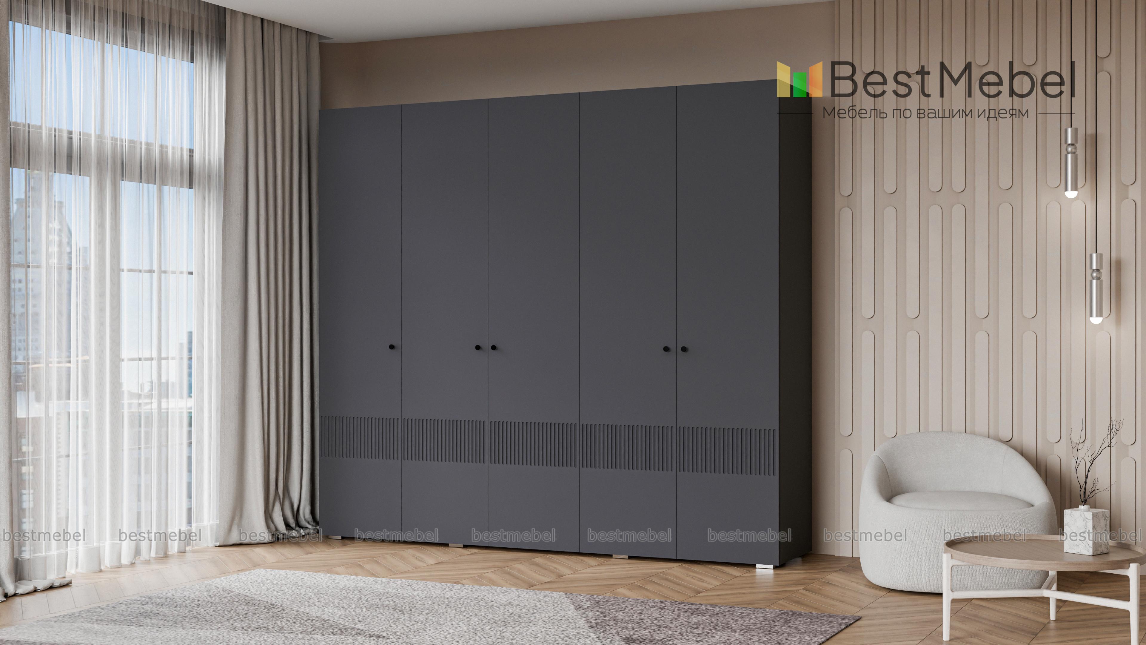Шкаф распашной Джосс 5 BMS — это яркая современная модель с цветным фасадом и фрезеровкой. Комплектация с двумя штангами и полками подходит как для сложенной, так и развешанной на вешалках одежды, а также обуви и коробок с аксессуарами. С помощью этого пятидверного шкафа вы сможете удобно и эстетично организовать хранение гардероба для двух человек. Купить шкаф распашной Джосс 5 BMS с выбором размеров, цвета и фурнитуры приглашаем к нам в интернет-магазин.